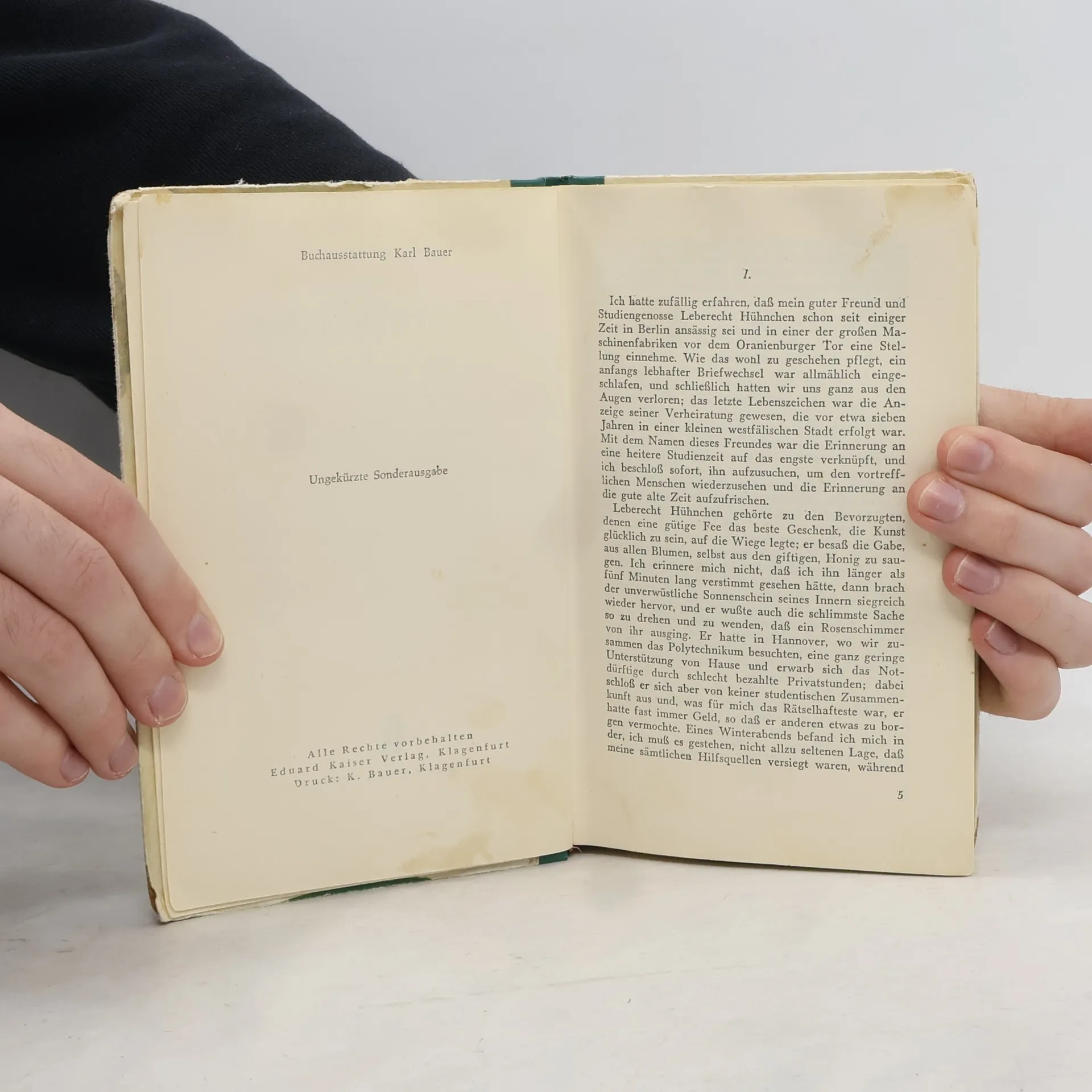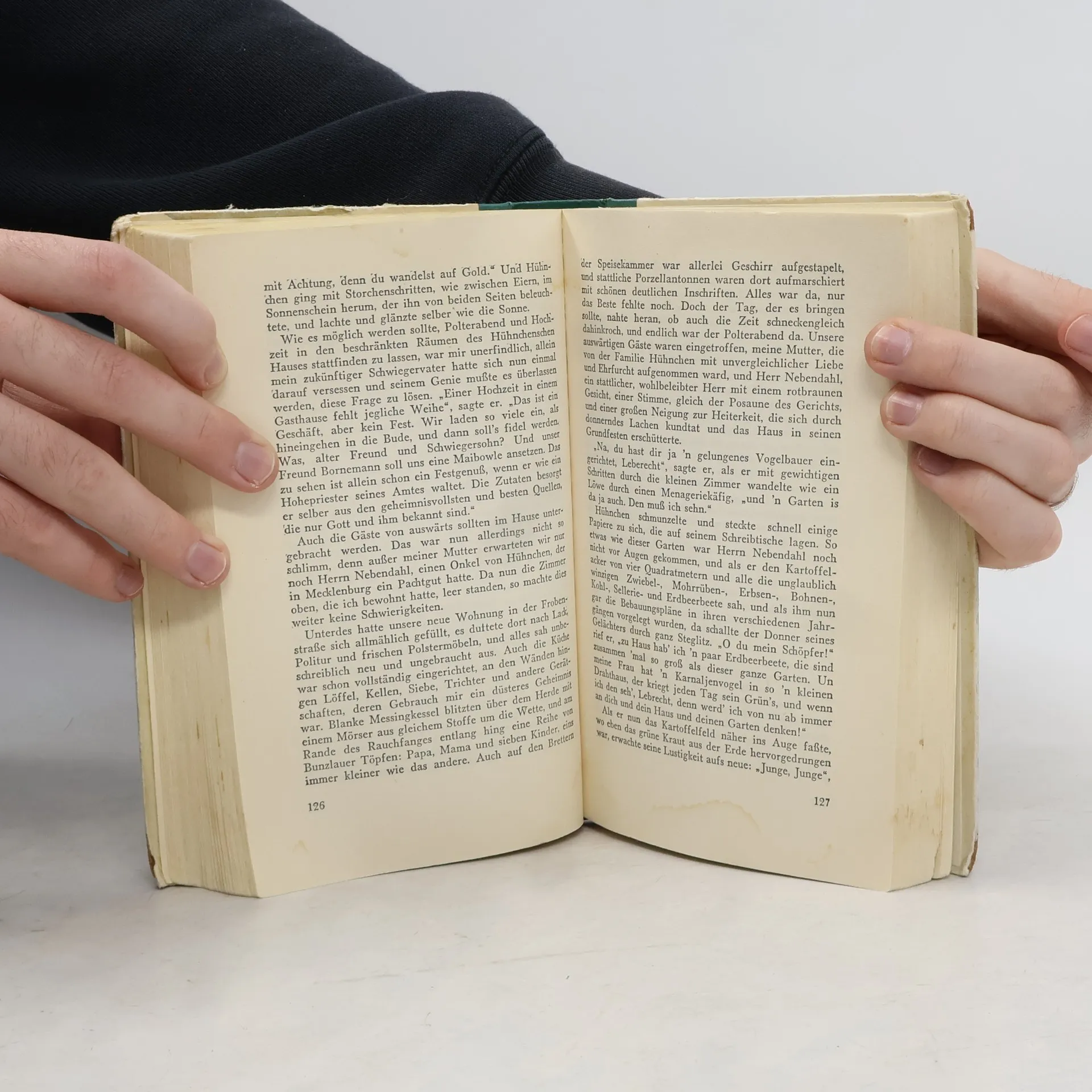 "Leberecht Hühnchen gehörte zu den Bevorzugten, denen eine gütige Fee das beste Geschenk, die Kunst glücklich zu sein, auf die Wiege legte; er besaß die Gabe, aus allen Blumen, selbst aus den giftigen, Honig zu saugen. Ich erinnere mich nicht, daß ich ihn länger als fünf Minuten lang verstimmt gesehen hätte, dann brach der unverwüstliche Sonnenschein seines Innern siegreich wieder hervor, und er wußte auch die schlimmste Sache so zu drehen und zu wenden, daß ein Rosenschimmer von ihr ausging." Gröls-Klassiker (Edition Werke der Weltliteratur)