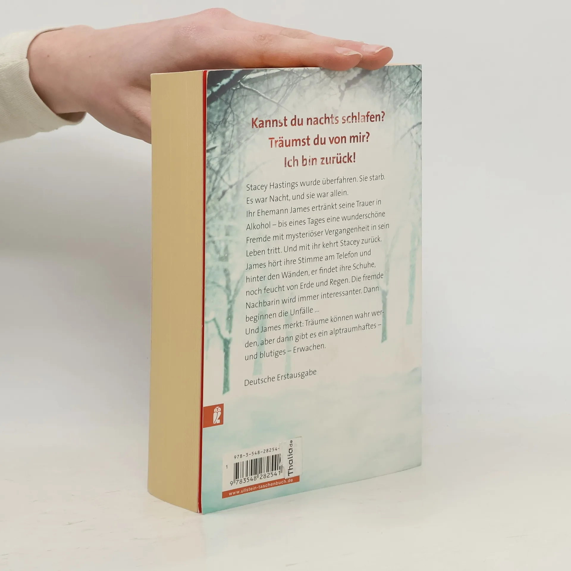 Stacey Hastings wurde überfahren. Sie starb. Es war Nacht und sie war allein. Ihr Ehemann James ertränkt seine Trauer in Alkohol – bis eines Tages eine wunderschöne Fremde mit mysteriöser Vergangenheit in sein Leben tritt. Und mit ihr kehrt Stacey zurück. James hört ihre Stimme am Telefon und hinter den Wänden, er findet ihre Schuhe, noch feucht von Erde und Regen. Und bald entdeckt er: Wenn Träume wahr werden, gibt es oft ein blutiges Erwachen.
