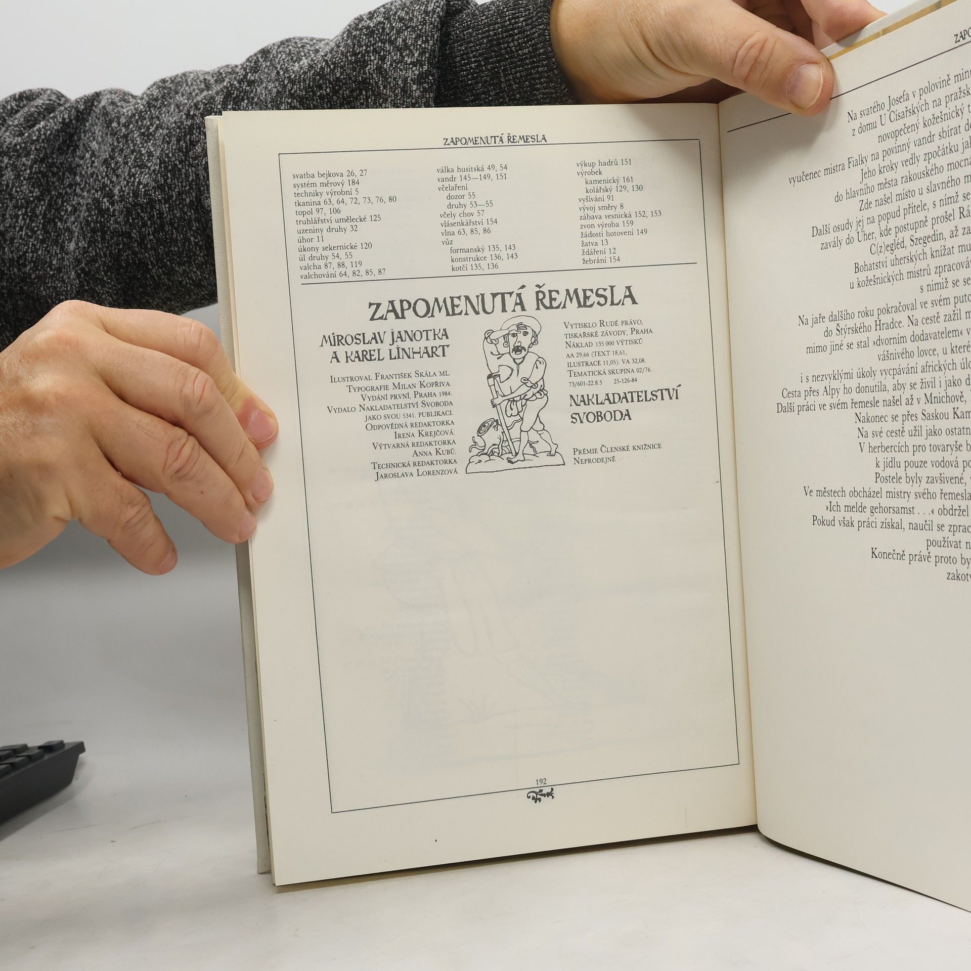 Nahlédnutí do zmizelého světa platnéřů, pasířů, krumpléřů, valchářů, bradýřů, lazebníků, truplařů, kameníků, štítařů, pernikářů, horologistů, konvářů, mistrů, tovaryšů a jiných "oudů" poctivých, učinlivých a ctnostným řemesel cechovních. Kniha hovoří o různých oborech lidské rukodělné činnosti, o materiálech, o funkční a výtvarné hodnotě vyráběných předmětů, o harmonii mezi jejich účelem, tvarem, barevností a zdobností, prostě o přírodě, lidech a věcech, o tvořivé práci, která prolínala a prolíná celým životem člověka. Kapitoly: Lidé a věci. Nejen chlebem živ je člověk: Lidé pracující na púde, Pastýři, slouhové, ovčáci, Řezníci, Uzenáři, Mlynáři, Pekaři, Pernikáři, Dílo medu, brtníci, včelaři. Starosti, jak a co na sebe: Příprava příze a její zpracování, Tkalci díla rozličného, Vývoj tklacovské techniky, Tkalcovská pohádka, Vazby tkanin, Zánik tkalcovských cechú, Běliči, barvíři, mandlíři, Tkalci vlny, Soukeníci, Mykači, Krampléři, Valcháři, Česači vlny, Postřihovači, Krejčí, Krumpléři a vyšívačky, Kloboučníci a šmukýři, Ševci. Dřevěný svět: Tesaři, Sekerníci, Truhláři, Koláři. Lidé světem jedoucí a jdoucí: Formani, Vandrovní tovariši, Světem jdoucí. Hrst řemesel nakonec: Malíři a iluminátoři, Cihláři, Hodináři, Zvonaři, Konváři, Zedníci a kameníci, Lékaři, Lazebníci a holiči. Malý slovník řemesel a lidských činností, Dvakrát měř a jednou řež, Věcný rejstřík. Prémie Členské knižnice (neprodejná)