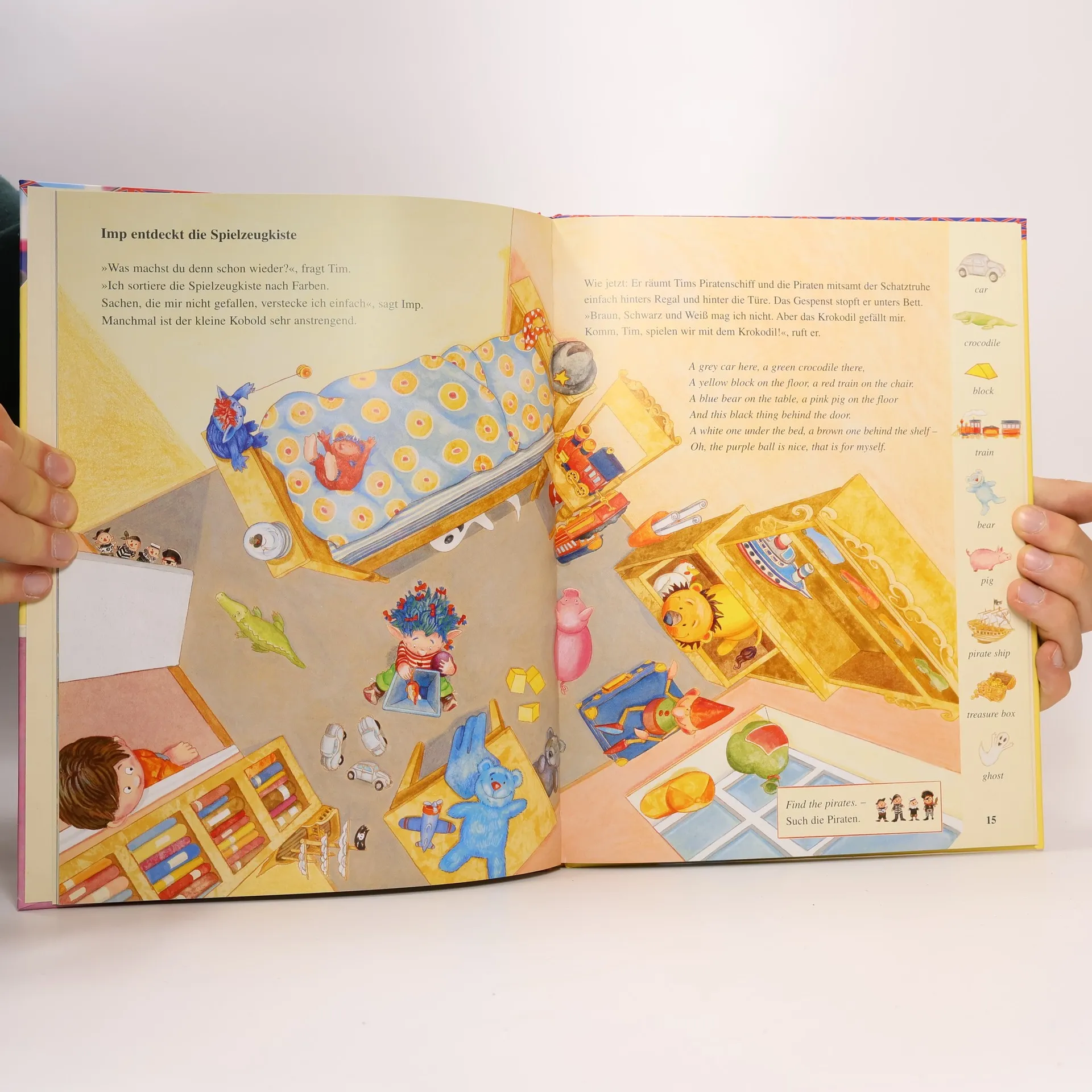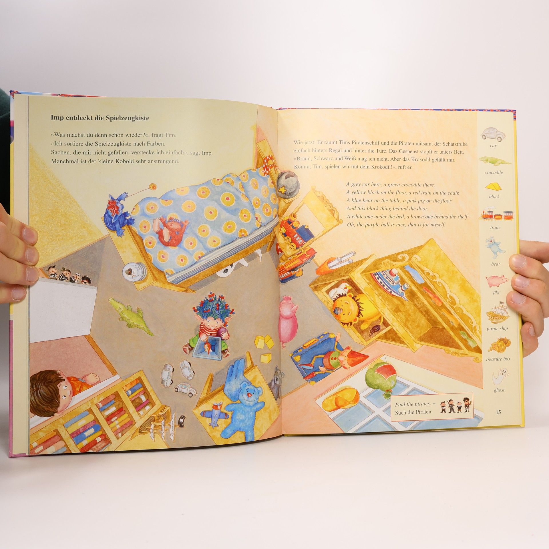 Nanu, was kreischt denn da in Tims Koffer? Mitten in der Nacht wird Tim wach. Dabei ist er so müde: Er ist gerade aus seinem Englandurlaub zurückgekommen. Und da ist doch tatsächlich ein echter englischer Kobold in seinen Koffer geraten! Der will sofort wieder nach Hause, aber Tim hat eine bessere Idee: Die beiden spielen, singen, feiern Geburtstag und dabei lernt Tim ganz nebenbei eine Menge Englisch. In diesem Bilderbuch mit Liedern und Bewegungsspielen lernen Kindergartenkinder begeistert erste englische Wörter.