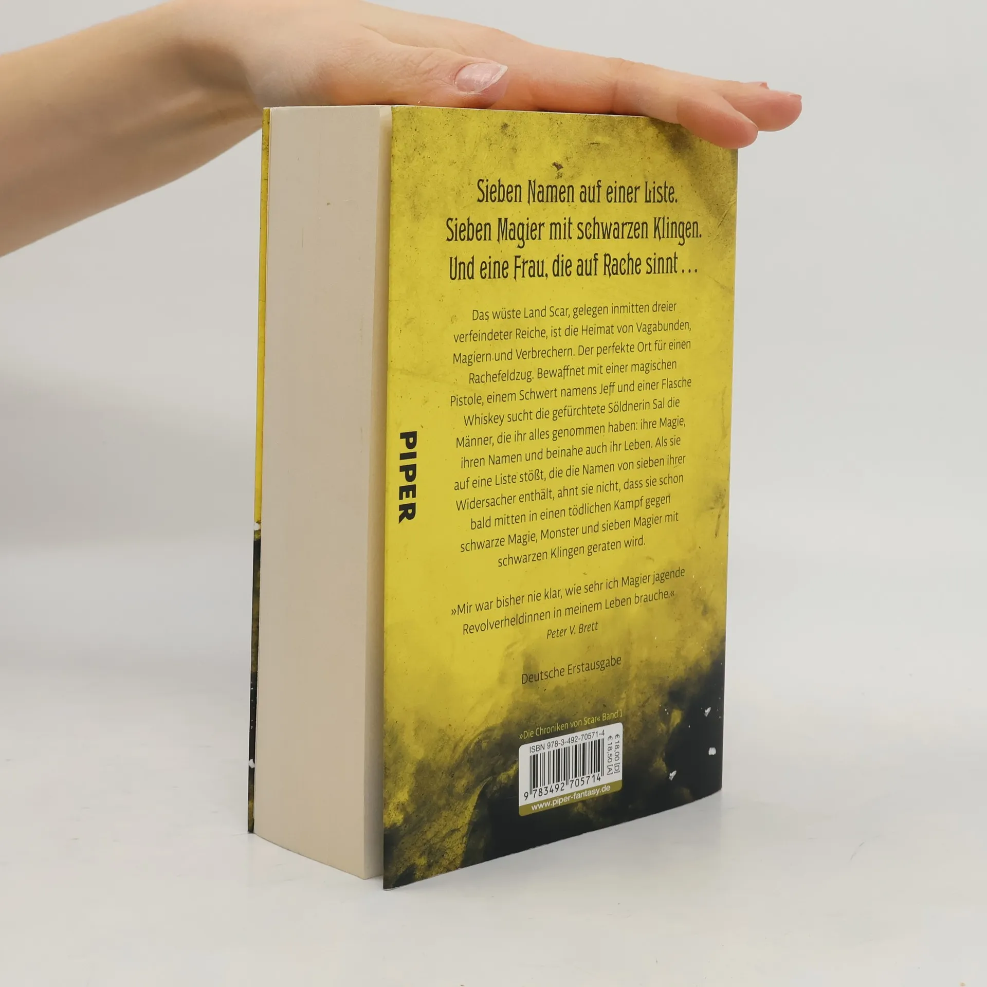 Sieben Namen auf einer Liste.Sieben Magier mit schwarzen Klingen.Und eine Frau, die auf Rache sinnt … Das wüste Land Scar, gelegen inmitten dreier verfeindeter Reiche, ist die Heimat von Vagabunden, Magiern und Verbrechern. Der perfekte Ort für einen Rachefeldzug. Bewaffnet mit einer magischen Pistole, einem Schwert namens Jeff und einer Flasche Whiskey zieht die gefürchtete Söldnerin Sal durch das Land, auf der Suche nach den Männern, die ihr alles genommen haben: Ihre Magie, ihren Namen und beinahe auch ihr Leben. Als sie auf eine Liste stößt, die die Namen von sieben ihrer Widersacher enthält, ahnt sie nicht, dass sie schon bald mitten in einen tödlichen Kampf gegen schwarze Magie, Monster und sieben Magier mit schwarzen Klingen geraten wird. »Mir war bisher nie klar, wie sehr ich Magier jagende Revolverheldinnen in meinem Leben brauche.« Peter V. Brett