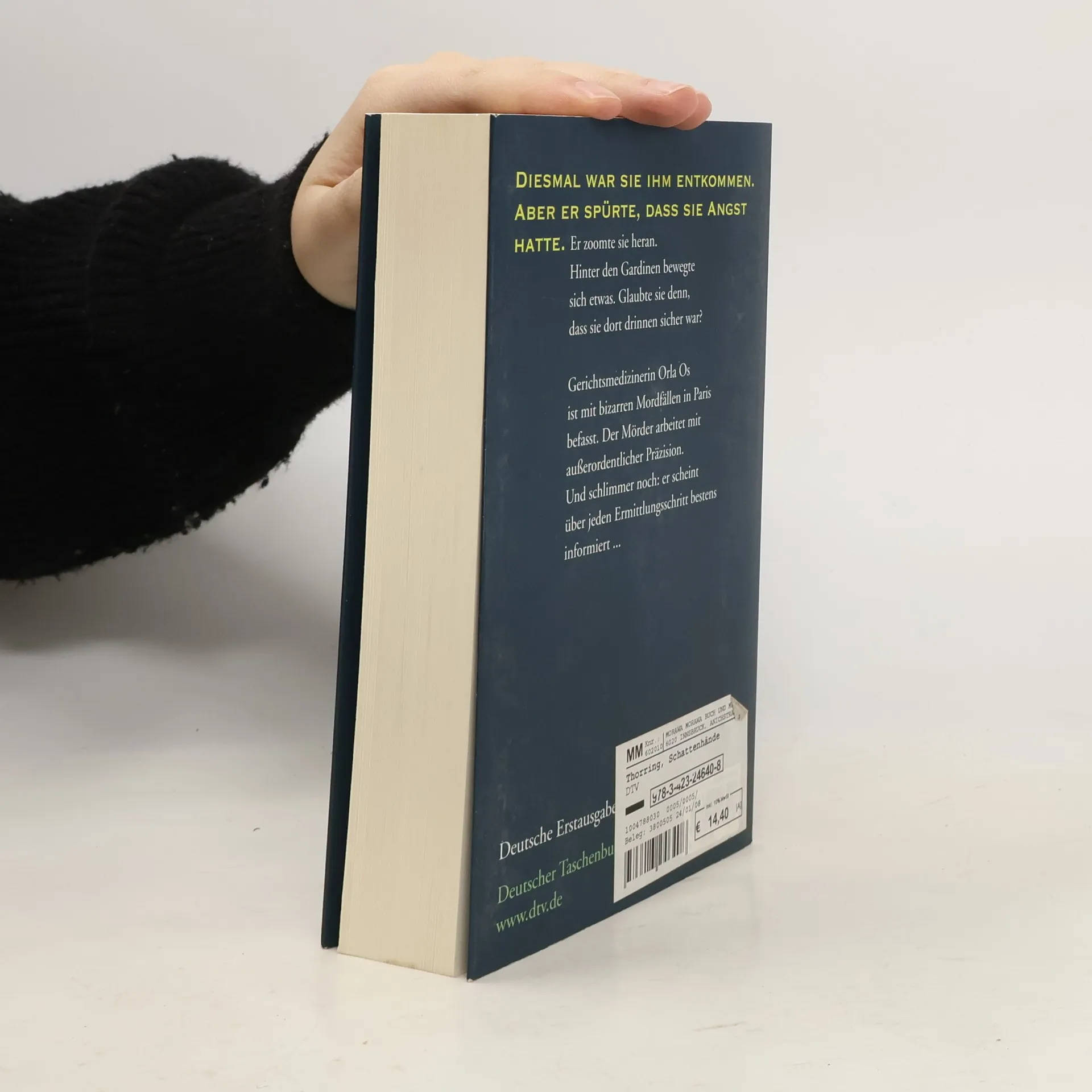 »Seine Bewegungen waren explosionsartig schnell. Er kam aus dem Sessel hoch und glitt wie ein Schatten auf sie zu. Eine Riesenwelle der Angst spülte sie auf die Füße.« In einem Pariser Hinterhof wird ein Mann erstochen aufgefunden, offenbar ein Ukrainer, der sich offiziell in Paris aufhielt, um Kunstgeschichte zu studieren. Noch während die Gerichtsmedizinerin Orla Os, eine Norwegerin, die seit 17 Jahren in Paris lebt, und ihr Kollege Kommissar Marchand die Hausbewohner vernehmen, wird ein zweiter Ukrainer, der Zimmernachbar des Toten, ermordet. Es zeigt sich, dass ein Profi am Werke war, doch fehlt zunächst jedes Motiv. Als Orla Kontakt zu einer befreundeten Slawistin aufnimmt, um eine Spur nach Russland zu verfolgen, wird auch diese kurze Zeit später umgebracht. Orla selbst wird eines Abends überfallen. Zwar kann sie entkommen, doch hat sie zusehends das Gefühl, beobachtet zu werden.