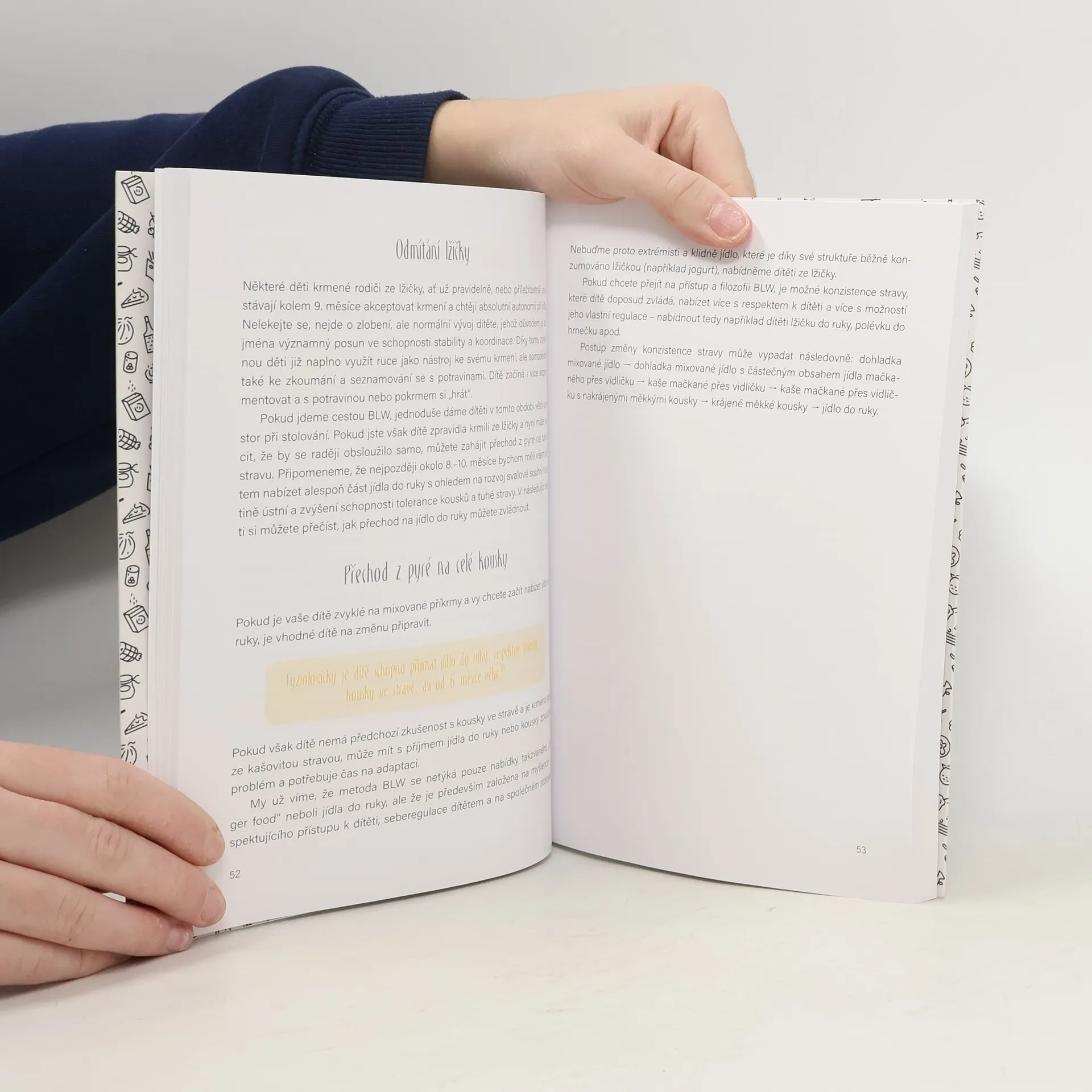 Baby-led weaning (BLW) je světově rozšířeným způsobem zavádění příkrmů do jídelníčku zdravých kojenců od zhruba šesti měsíců věku. Principem celého konceptu je respektující přístup při zavádění prvního nemléčného pokrmu do stravy kojenců a vytváření jídelních zvyklostí nenásilným způsobem, bez nucení ze strany pečujících osob. Důraz je kladen na společné stolování v rámci pestrého a vyváženého jídelníčku celé rodiny. Zásadní úlohu při zavádění příkrmů metodou BLW hraje bezpečnost jídla předkládaného dětem. Musí odpovídat schopnostem a dovednostem v určitém období jejich vývojové zralosti.Součástí knihy jsou recepty na domácí jídla středomořské kuchyně sestavené tak, aby je mohly jíst děti spolu s rodiči už v kojeneckém věku, kdy se metoda BLW v praxi uplatňuje nejvíce.Kniha přináší více pohledů na přínosy BLW. Shrnuje nejpodstatnější informace, které jsou ve spojitosti s touto metodou v odborné literatuře dostupné, zároveň uvádí příklady z praxe a odpovídá na dotazy, které pečující osoby v této oblasti trápí. Pro srozumitelnost a přehlednost je doplněna o grafy, tabulky a fotografie.