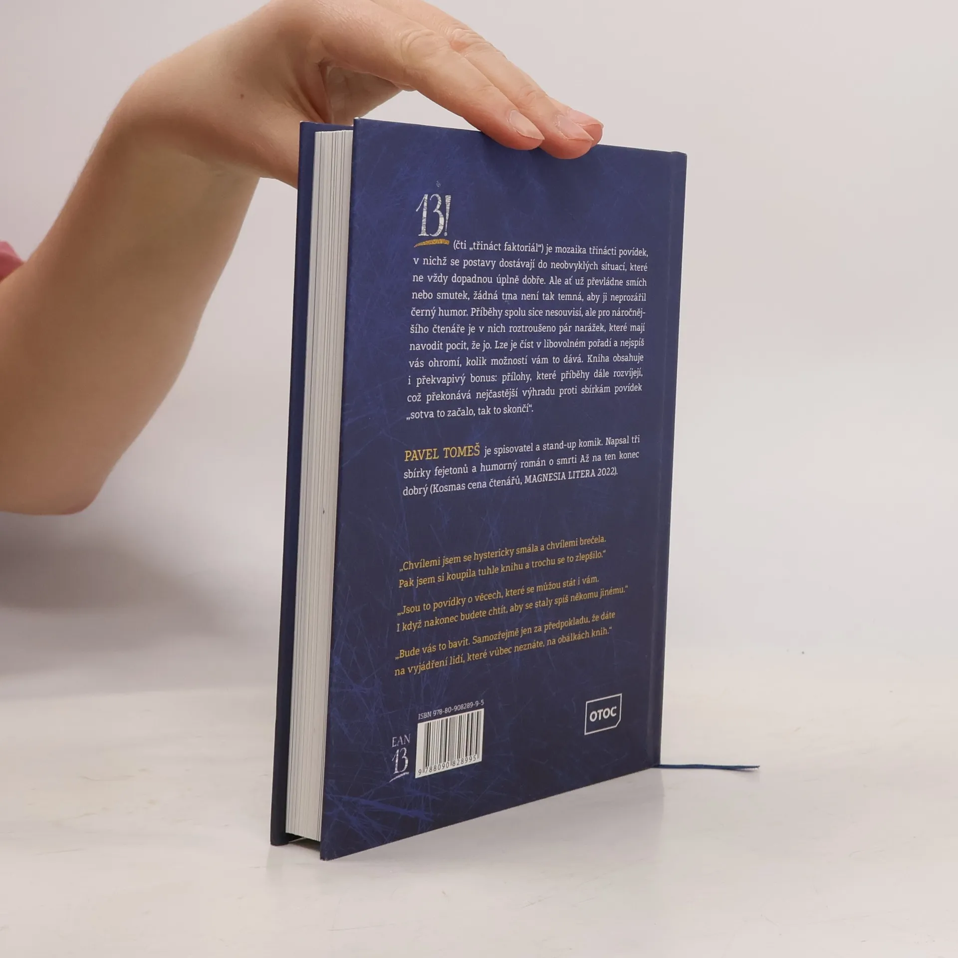 13! (čti "třináct faktoriál") je mozaika třinácti povídek, v nichž se postavy dostávají do neobvyklých situací, které ne vždy dopadnou úplně dobře. Ale ať už převládne smích nebo smutek, žádná tma není tak temná, aby ji neprozářil černý humor. Příběhy spolu sice nesouvisí, ale pro náročnějšího čtenáře je v nich roztroušeno pár narážek, které mají navodit pocit, že jo. Lze je číst v libovolném pořadí a nejspíš vás ohromí, kolik možností vám to dává. Kniha obsahuje i překvapivý bonus: přílohy, které příběhy dále rozvíjejí, což překonává nejčastější výhradu proti sbírkám povídek "sotva to začalo, tak to skončí".