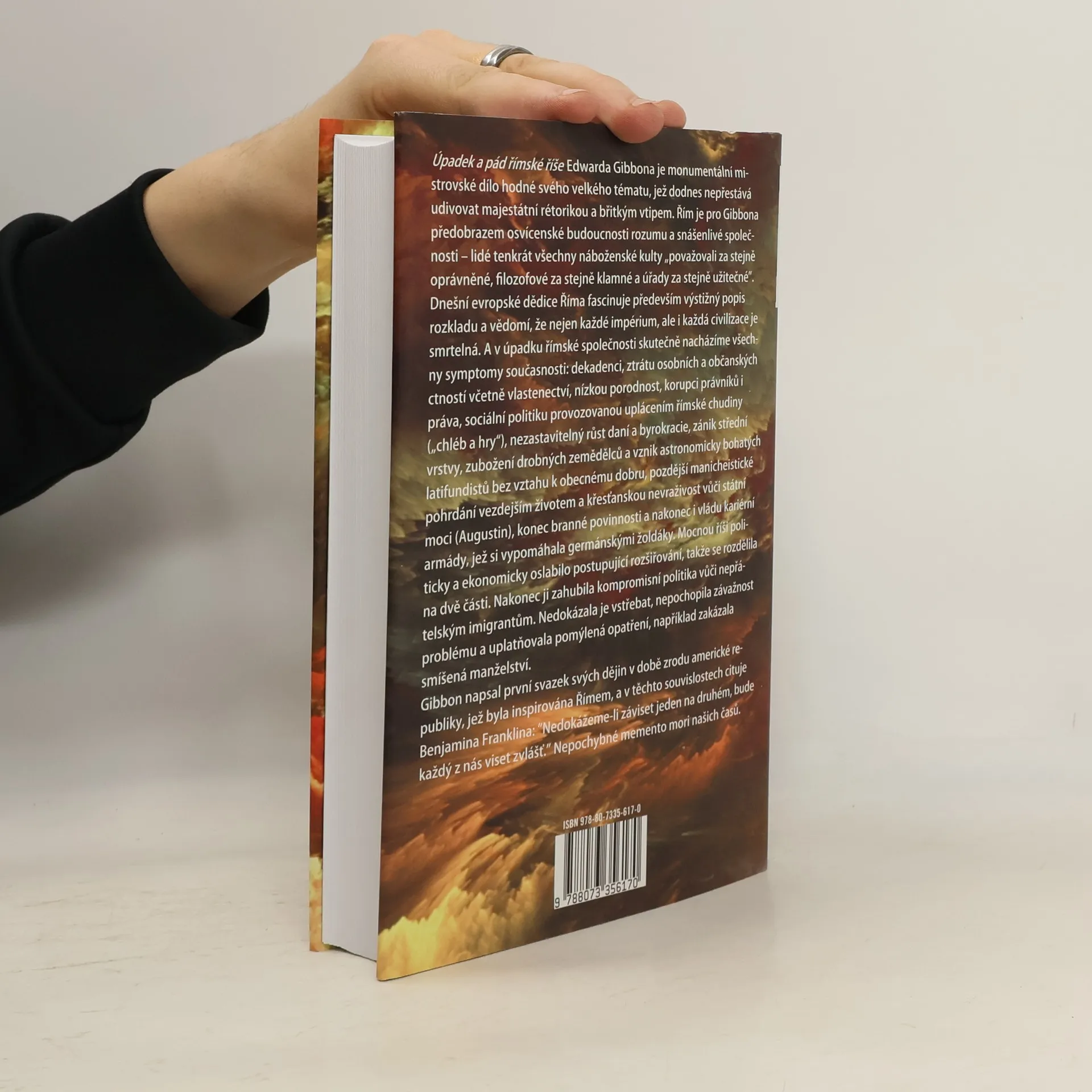 Úpadek a pád římské říše Edwarda Gibbona je monumentální dílo, které ohromuje svou rétorikou a vtipem. Gibbon podává panoramatický obraz společnosti a historických událostí, evokuje slávu římské civilizace, která se vyznačovala univerzálním právem, regionální autonomií a náboženskou tolerancí. Během Pax Romana lidé zažívali míru osobního bezpečí a prosperity, jakou nikdy předtím nepoznali. Řím je pro Gibbona symbolem osvícenské budoucnosti, kde byly všechny náboženské kulty považovány za rovnocenné. Dědictví Říma fascinují především popisy jeho rozkladu a vědomí, že každé impérium a civilizace jsou smrtelné. V úpadku římské společnosti nacházíme symptomy současnosti: dekadenci, ztrátu ctností, korupci, sociální politiku založenou na uplácení, rostoucí daně a byrokracii, zánik střední třídy a vznik bohatých latifundistů. Gibbon ukazuje, jak mocná říše byla oslabena expanzí a nakonec zničena kompromisní politikou vůči imigrantům. Při psaní prvního svazku svých dějin v době vzniku americké republiky, inspirované Římem, cituje Benjamina Franklina: „Nedokážeme-li záviset jeden na druhém, bude každý z nás viset zvlášť.” Toto je memento mori našich časů.
