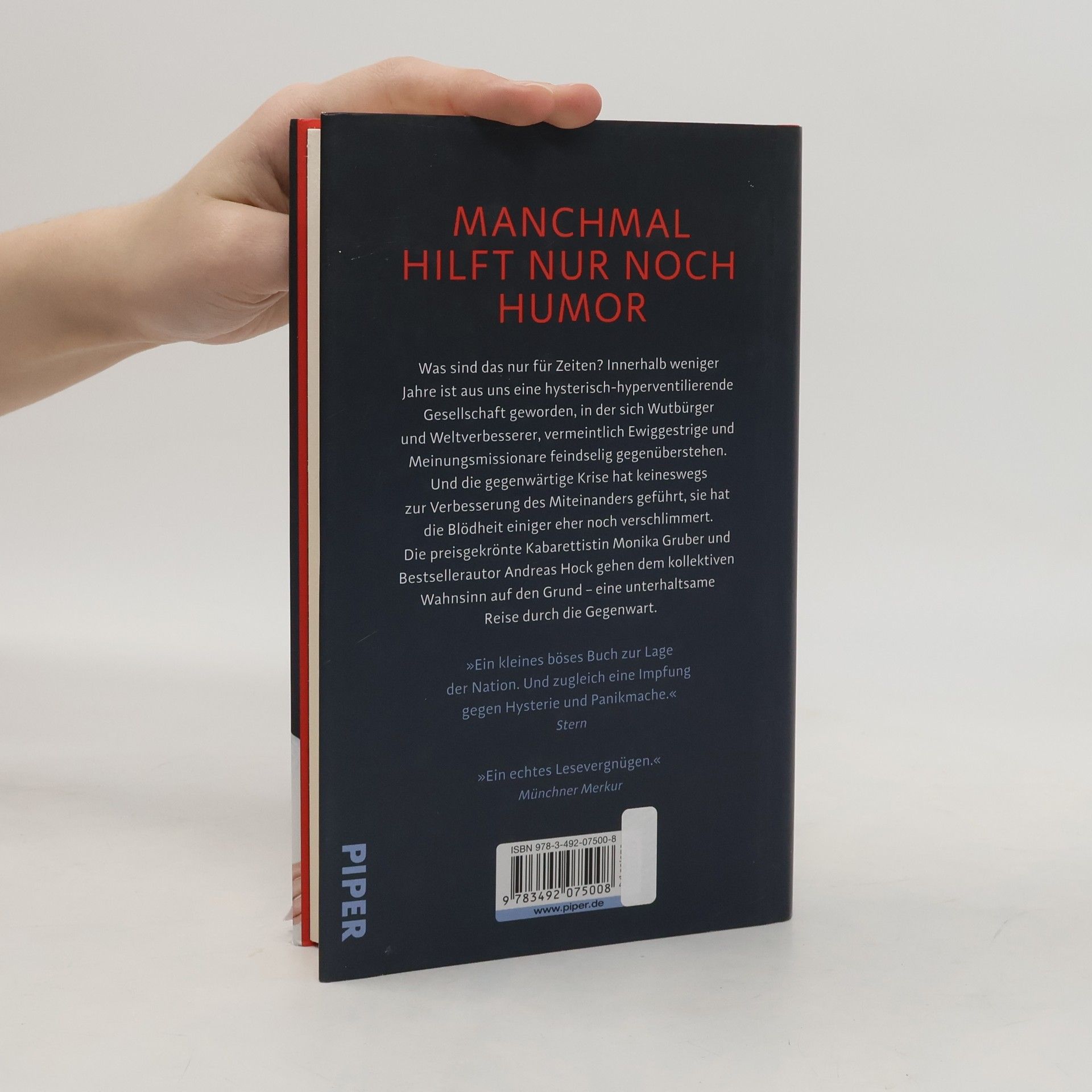 Was sind das nur für Zeiten? Innerhalb weniger Jahre ist aus uns eine hysterisch-hyperventilierende Gesellschaft geworden, in der sich Wutbürger und Weltverbesserer, vermeintlich Ewiggestrige und Meinungsmissionare feindselig gegenüberstehen. Und die gegenwärtige Krise hat keineswegs zur Verbesserung des Miteinanders geführt, sie hat die Blödheit einiger eher noch verschlimmert. Die preisgekrönte Kabarettistin Monika Gruber und Bestsellerautor Andreas Hock gehen dem kollektiven Wahnsinn auf den Grund – und stellen fest, dass er seine Ursache vor allem in der Ignoranz und im Egoismus einiger Weniger hat. Mit Selbstironie und schwarzem Humor begeben sie sich auf die Suche nach dem gesunden Menschenverstand und gehen dorthin, wo es wirklich wehtut – eine unterhaltsame Reise durch die Gegenwart, die beweist: Lachen hilft!