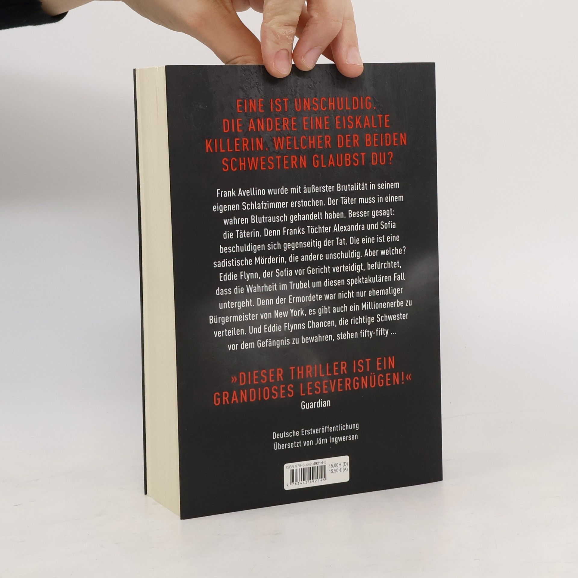 Eine ist unschuldig. Die andere eine eiskalte Killerin. Welcher der beiden Schwestern glaubst du? Frank Avellino wurde mit äußerster Brutalität in seinem eigenen Schlafzimmer erstochen, der Täter muss in einem wahren Blutrausch gehandelt haben. Besser gesagt: die Täterin. Denn Franks Töchter Alexandra und Sofia beschuldigen sich gegenseitig der Tat. Die eine ist eine sadistische Mörderin, die andere unschuldig. Aber welche? Sowohl Eddie Flynn, der Sofia vor Gericht verteidigt, als auch Alexandras junge Anwältin Kate Brooks befürchten, dass die Wahrheit im Trubel um diesen spektakulären Fall untergeht. Denn der Ermordete war nicht nur ehemaliger Bürgermeister von New York, es gibt auch ein Millionenerbe zu verteilen. Und Eddie Flynns Chancen, die richtige Schwester vor dem Gefängnis zu bewahren, stehen fifty-fifty ...