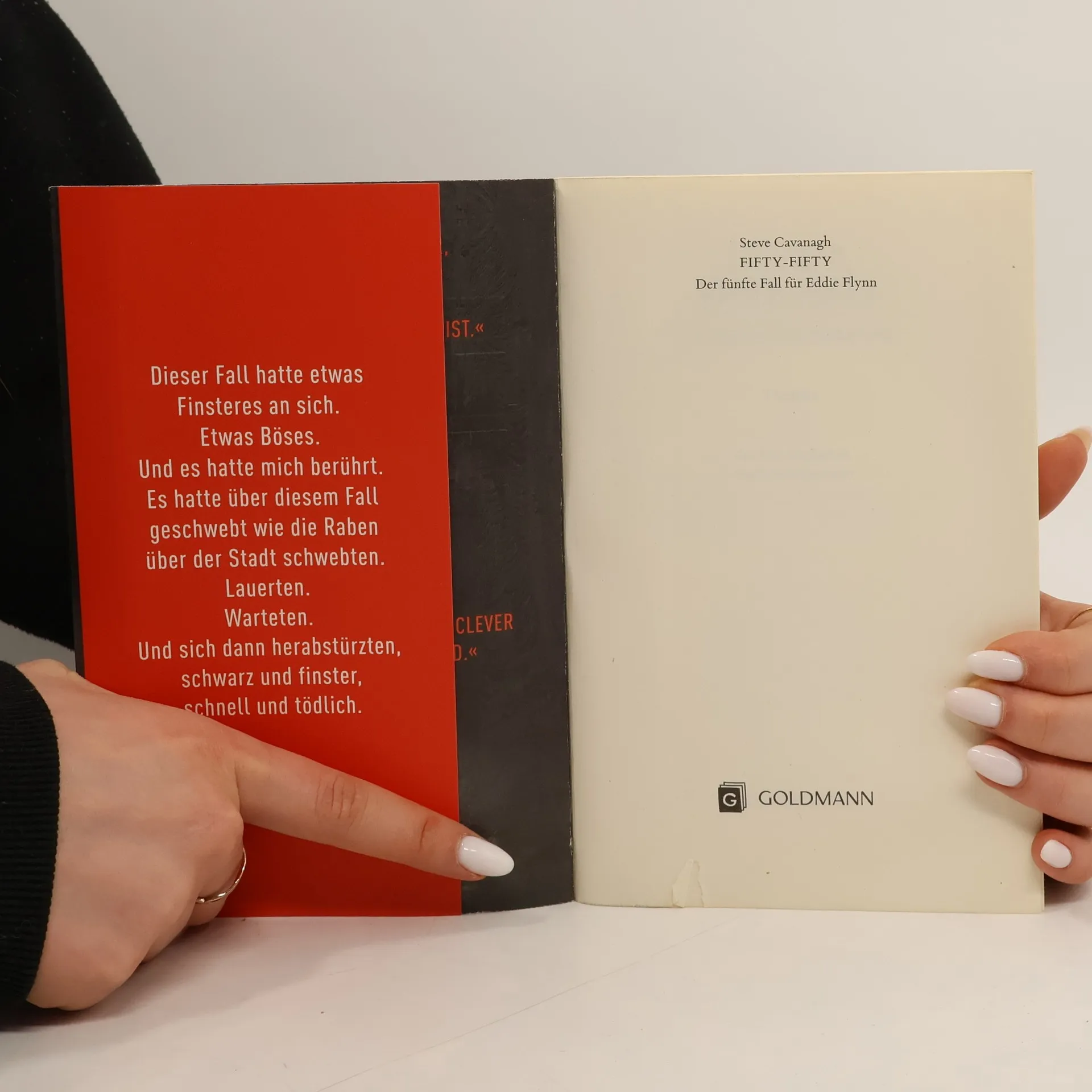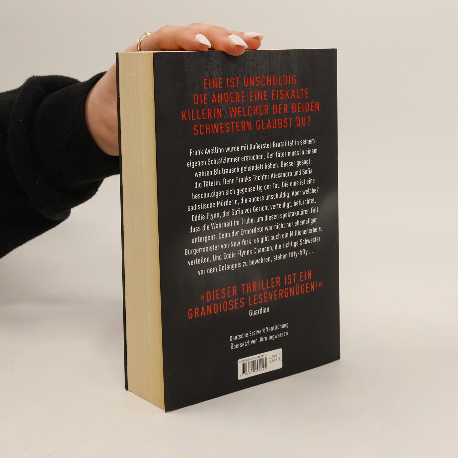 Eine ist unschuldig. Die andere eine eiskalte Killerin. Welcher der beiden Schwestern glaubst du? Frank Avellino wurde mit äußerster Brutalität in seinem eigenen Schlafzimmer erstochen, der Täter muss in einem wahren Blutrausch gehandelt haben. Besser gesagt: die Täterin. Denn Franks Töchter Alexandra und Sofia beschuldigen sich gegenseitig der Tat. Die eine ist eine sadistische Mörderin, die andere unschuldig. Aber welche? Sowohl Eddie Flynn, der Sofia vor Gericht verteidigt, als auch Alexandras junge Anwältin Kate Brooks befürchten, dass die Wahrheit im Trubel um diesen spektakulären Fall untergeht. Denn der Ermordete war nicht nur ehemaliger Bürgermeister von New York, es gibt auch ein Millionenerbe zu verteilen. Und Eddie Flynns Chancen, die richtige Schwester vor dem Gefängnis zu bewahren, stehen fifty-fifty ...