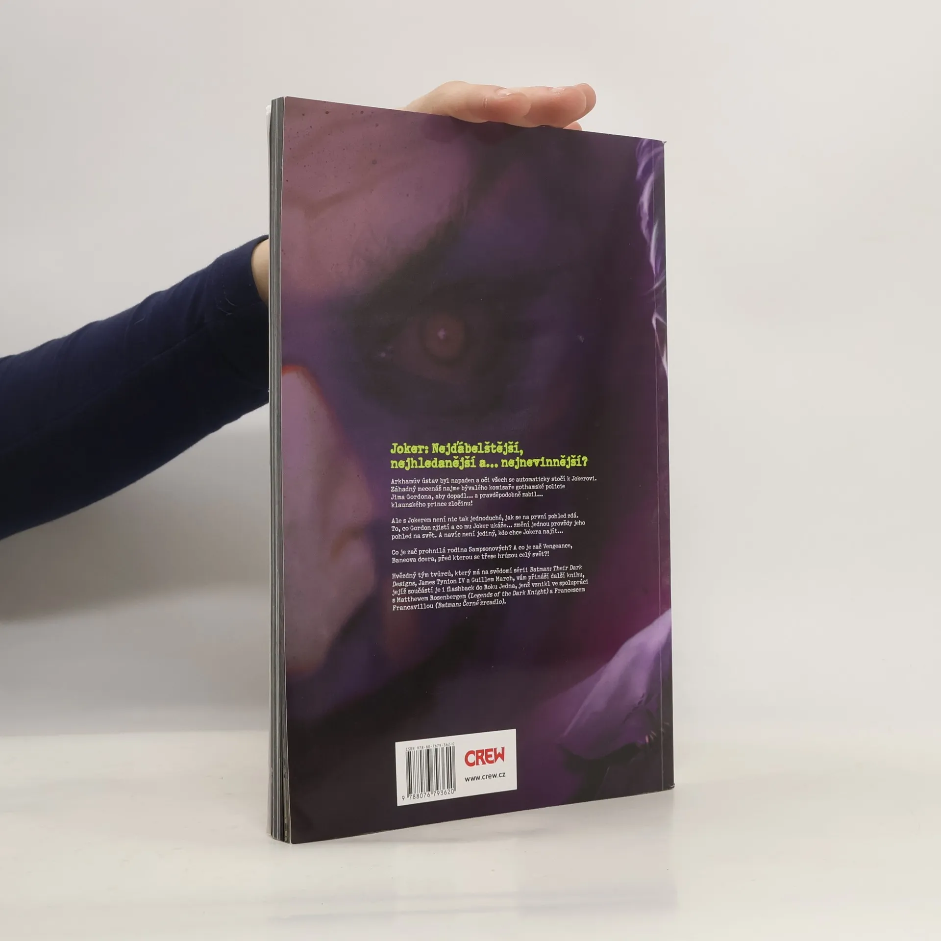 Joker: Nejďábelštější, nejhledanější a… nejnevinnější?Arkhamův ústav byl napaden a oči všech se automaticky stočí k Jokerovi. Záhadný mecenáš najme bývalého komisaře gothamské policie Jima Gordona, aby dopadl… a pravděpodobně zabil… klaunského prince zločinu!Ale s Jokerem není nic tak jednoduché, jak se na první pohled zdá. To, co Gordon zjistí a co mu Joker ukáže… změní jednou provždy jeho pohled na svět. A navíc není jediný, kdo chce Jokera najít…Co je zač prohnilá rodina Sampsonových? A co je zač Vengeance, Baneova dcera, před kterou se třese hrůzou celý svět?!Hvězdný tým tvůrců, který má na svědomí sérii Batman: Their Dark Designs, James Tynion IV a Guillem March, vám přináší další knihu, jejíž součástí je i flashback do Roku Jedna, jenž vznikl ve spolupráci s Matthewem Rosenbergem (Legends of the Dark Knight) a Francescem Francavillou (Batman: Černé zrcadlo).