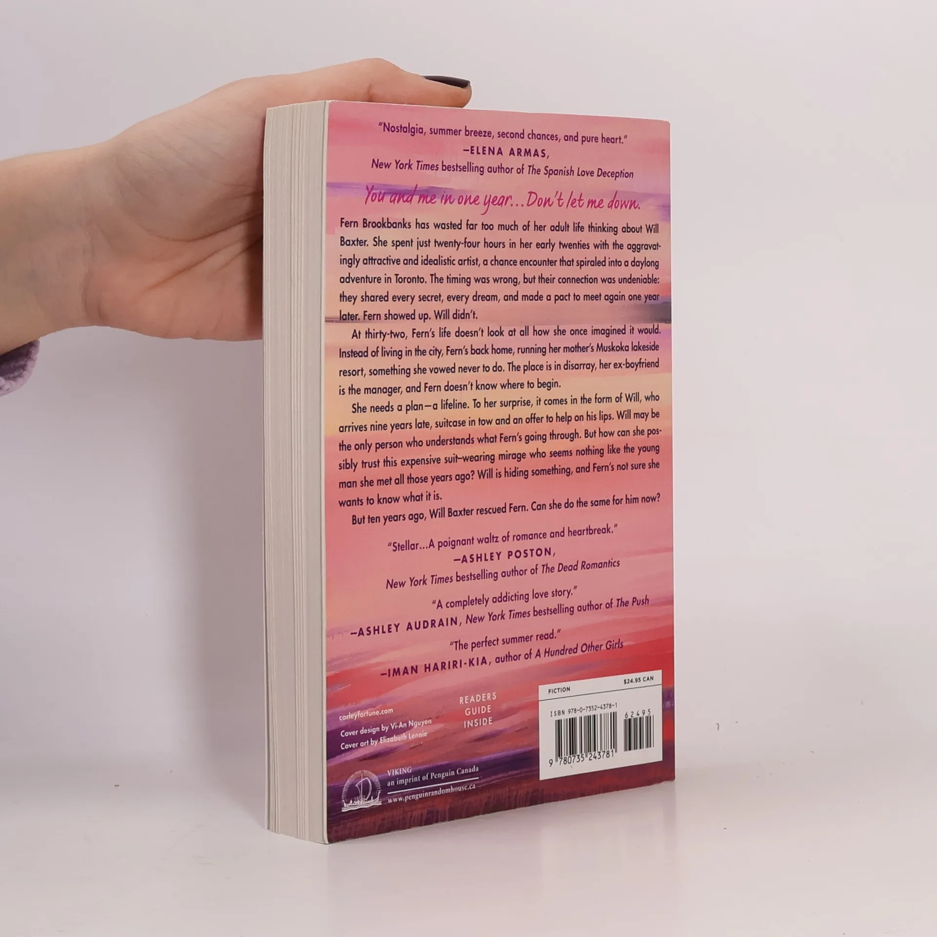 Fern Brookbanks has wasted far too much of her adult life thinking about Will Baxter. She spent just twenty-four hours in her early twenties with the aggravatingly attractive, idealistic artist, a chance encounter that spiraled into a daylong adventure in Toronto. The timing was wrong, but their connection was undeniable: they shared every secret, every dream, and made a pact to meet one year later. Fern showed up. Will didn't.At thirty-two, Fern's life doesn't look at all how she once imagined it would. Instead of living in the city, Fern's back home, running her mother's Muskoka lakeside resort—something she vowed never to do. The place is in disarray, her ex-boyfriend's the manager, and Fern doesn't know where to begin.She needs a plan—a lifeline. To her surprise, it comes in the form of Will, who arrives nine years too late, with a suitcase in tow and an offer to help on his lips. Will may be the only person who understands what Fern's going through. But how could she possibly trust this expensive-suit wearing mirage who seems nothing like the young man she met all those years ago. Will is hiding something, and Fern's not sure she wants to know what it is.But ten years ago, Will Baxter rescued Fern. Can she do the same for him?
