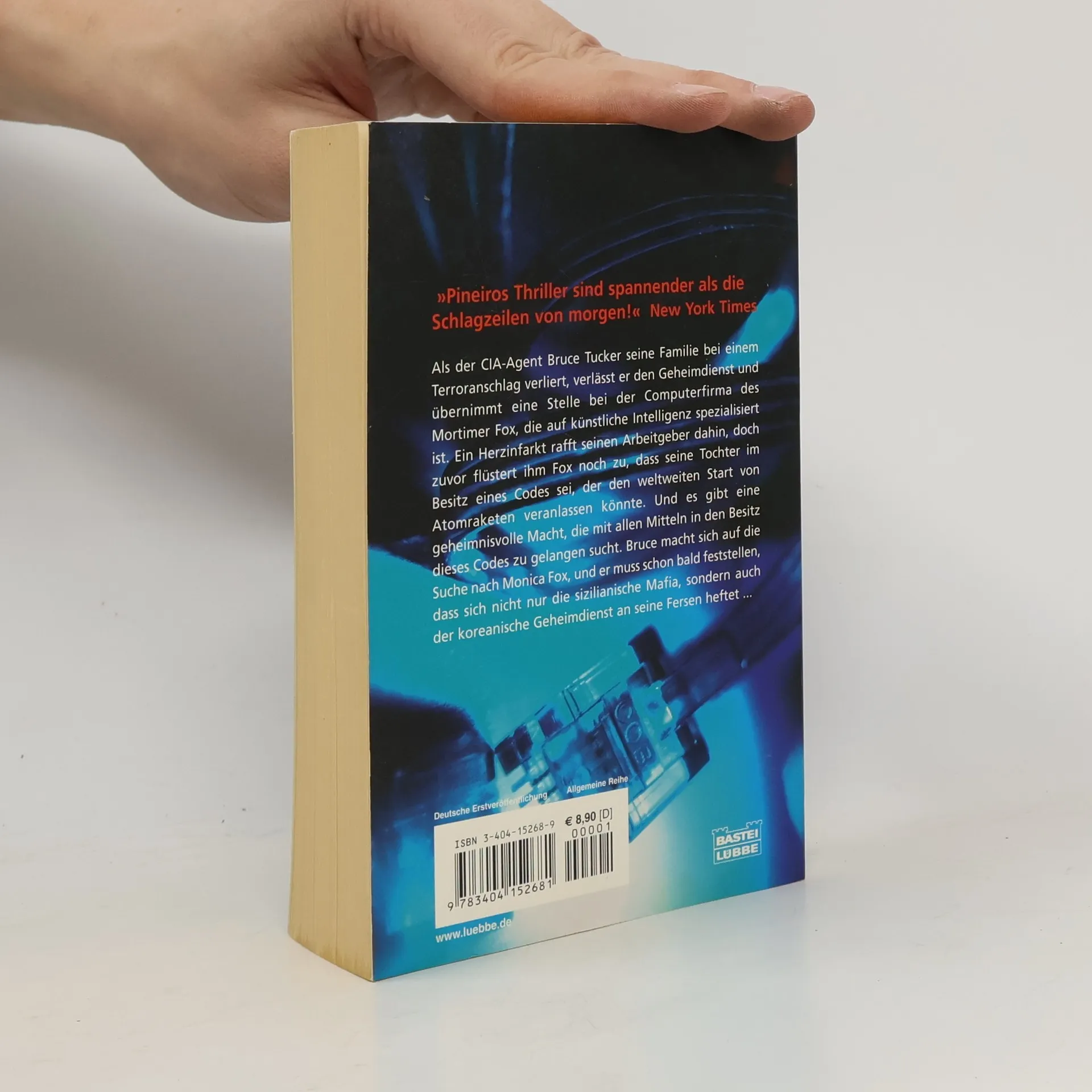 Als der CIA-Agent Bruce Tucker seine Familie bei einem Terroranschlag verliert, verlässt er den Geheimdienst und übernimmt eine Stelle bei der Computerfirma des Mortimer Fox, die auf künstliche Intelligenz spezialisiert ist. Ein Herzinfarkt rafft seinen Arbeitgeber dahin, doch zuvor flüstert ihm Fox noch zu, dass seine Tochter im Besitz eines Codes sei, der den weltweiten Start von Atomraketen veranlassen könnte. Und es gibt eine geheimnisvolle Macht, die mit allen Mitteln in den Besitz dieses Codes zu gelangen sucht. Bruce macht sich auf die Suche nach Monica Fox, und er muss schon bald feststellen, dass sich nicht nur die sizilianische Mafia, sondern auch der koreanische Geheimdienst an seine Fersen heftet. „Pineiros Thriller sind spannender als die Schlagzeilen von morgen!“ New York Times