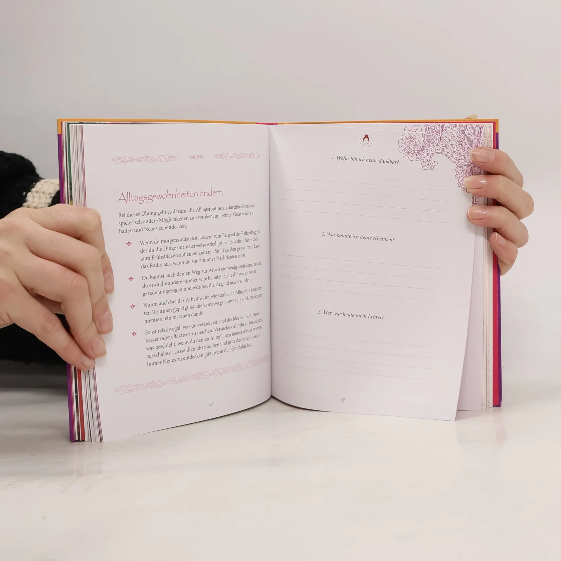 Drei buddhistische Fragen führen zum Glück. 1. Wofür bin ich heute dankbar? Diese Frage lenkt die Aufmerksamkeit auf die Geschenke, die uns das Leben täglich macht und schult so den Blick für das Positive. 2. Was konnte ich heute schenken? Hier geht es um die eigene Großzügigkeit bzw. die Fähigkeit, unser Herz zu öffnen und uns mitfühlend mit anderen zu verbinden. Und 3. Wer war heute mein Lehrer? Diese Frage verwandelt Probleme in Herausforderungen, Hindernisse in Lernaufgaben. Sie lässt uns auch schwierige Lebenssituationen annehmen und mutig voranschreiten. So können wir wachsen und unser Potenzial entwickeln. Somit lassen uns Buddhas drei Fragen bewusster und achtsamer durchs Leben gehen. Vertieft wird dieser Prozess durch die Tagebuch-Funktion des Buches. Wer jeden Tag seine Antworten notiert, der kann in Momenten des Zweifels, des Haderns oder gar Scheiterns auf die im Tagebuch dokumentierten Ressourcen zurückgreifen und daraus neue Kraft schöpfen.
