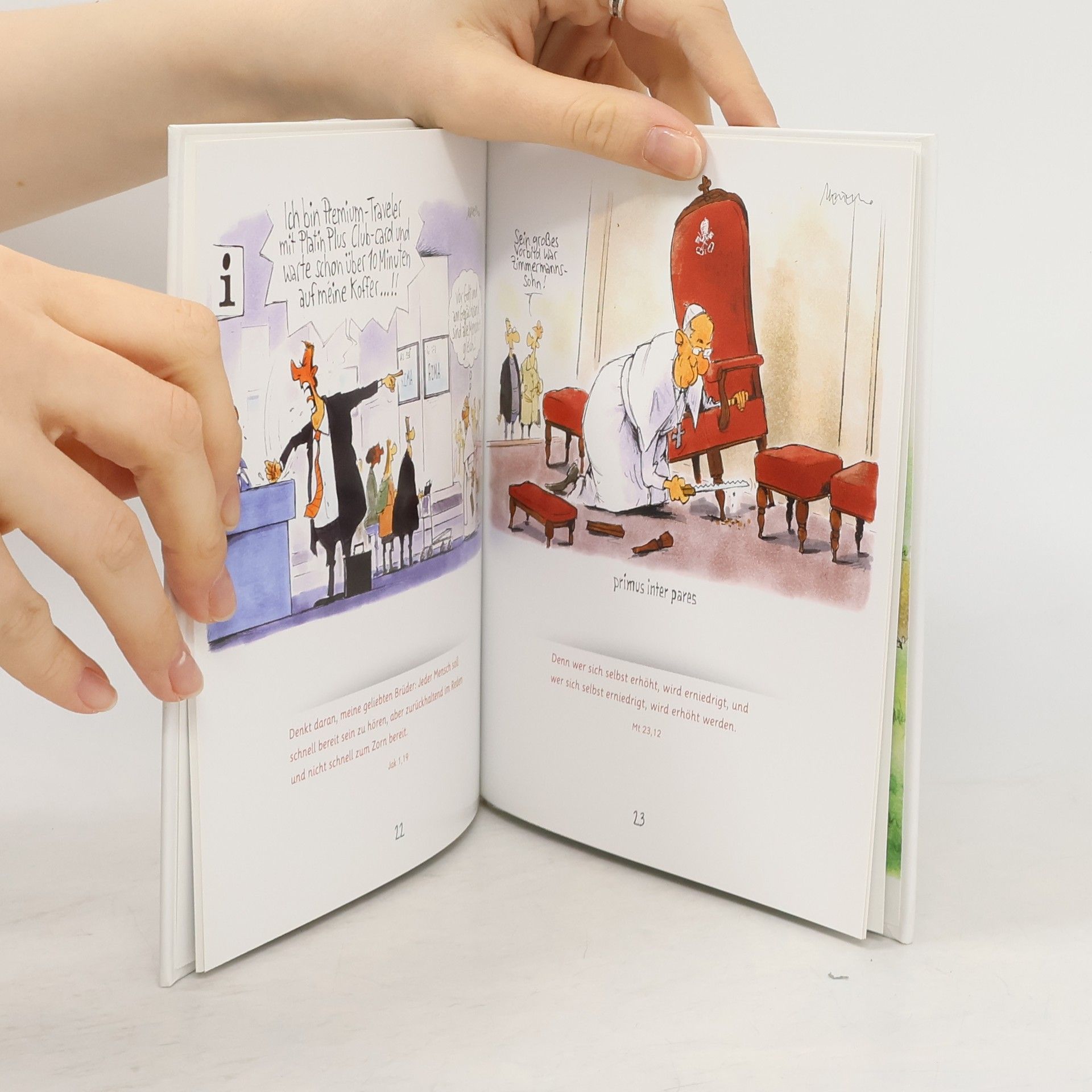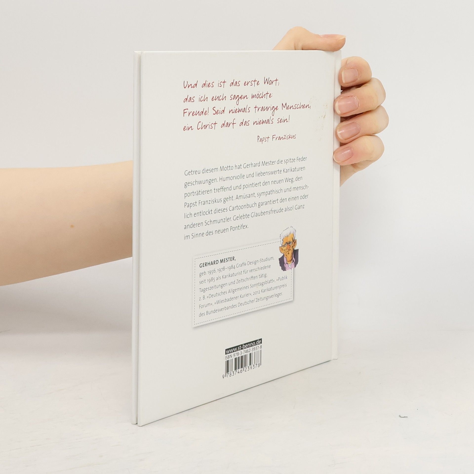 Getreu dem Motto von Papst Franziskus „Seid niemals traurige Menschen, ein Christ darf niemals traurig sein!“ hat Gerhard Mester die spitze Feder geschwungen. Humorvolle und liebenswerte Karikaturen porträtieren treffend und pointiert den neuen Weg, den Papst Franziskus geht. Amüsant, sympathisch und menschlich entlockt dieses Cartoonbuch garantiert den einen oder anderen Schmunzler. Gelebte Glaubensfreude also! Ganz im Sinne des neuen Pontifex.