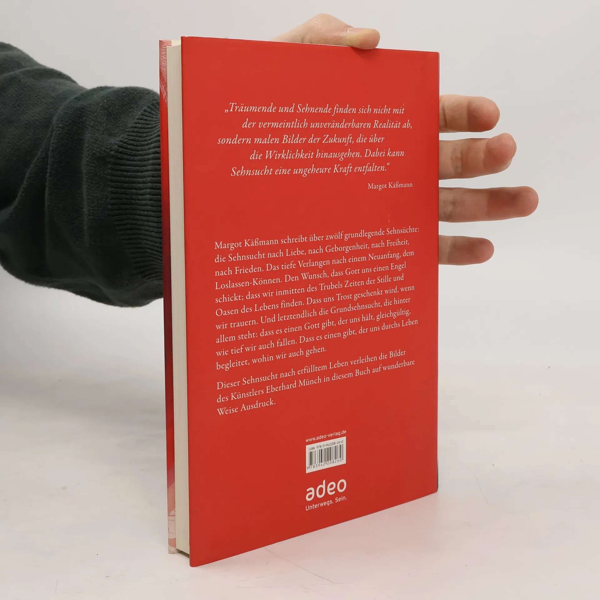 Margot Käßmann schreibt über zwölf grundlegende Sehnsüchte: die Sehnsucht nach Liebe, nach Geborgenheit, nach Freiheit, nach Frieden. Das tiefe Verlangen nach einem Neuanfang, dem Loslassen-Können. Den Wunsch, dass Gott uns einen Engel schickt; dass wir inmitten des Trubels Zeiten der Stille und Oasen des Lebens finden. Dass uns Trost geschenkt wird, wenn wir trauern. Und letztendlich die Grundsehnsucht, die hinter allem steht: dass es einen Gott gibt, der uns hält, egal, wie tief wir auch fallen. Dass es einen gibt, der uns durchs Leben begleitet, wohin wir auch gehen. Die im Buch enthaltenen Bilder des Künstlers Eberhard Münch, dessen Werk Margot Käßmann besonders schätzt, spiegeln das Verlangen nach einer anderen Welt. „Die Sehnenden sind wie die Träumenden. Sie denken über Grenzen hinaus. Sie malen Bilder, die über die Wirklichkeit hinausgehen. Sie finden sich nicht ab mit der vermeintlich unveränderbaren Realität. Dabei kann Sehnsucht eine ungeheure Kraft entfalten.“ Margot Käßmann