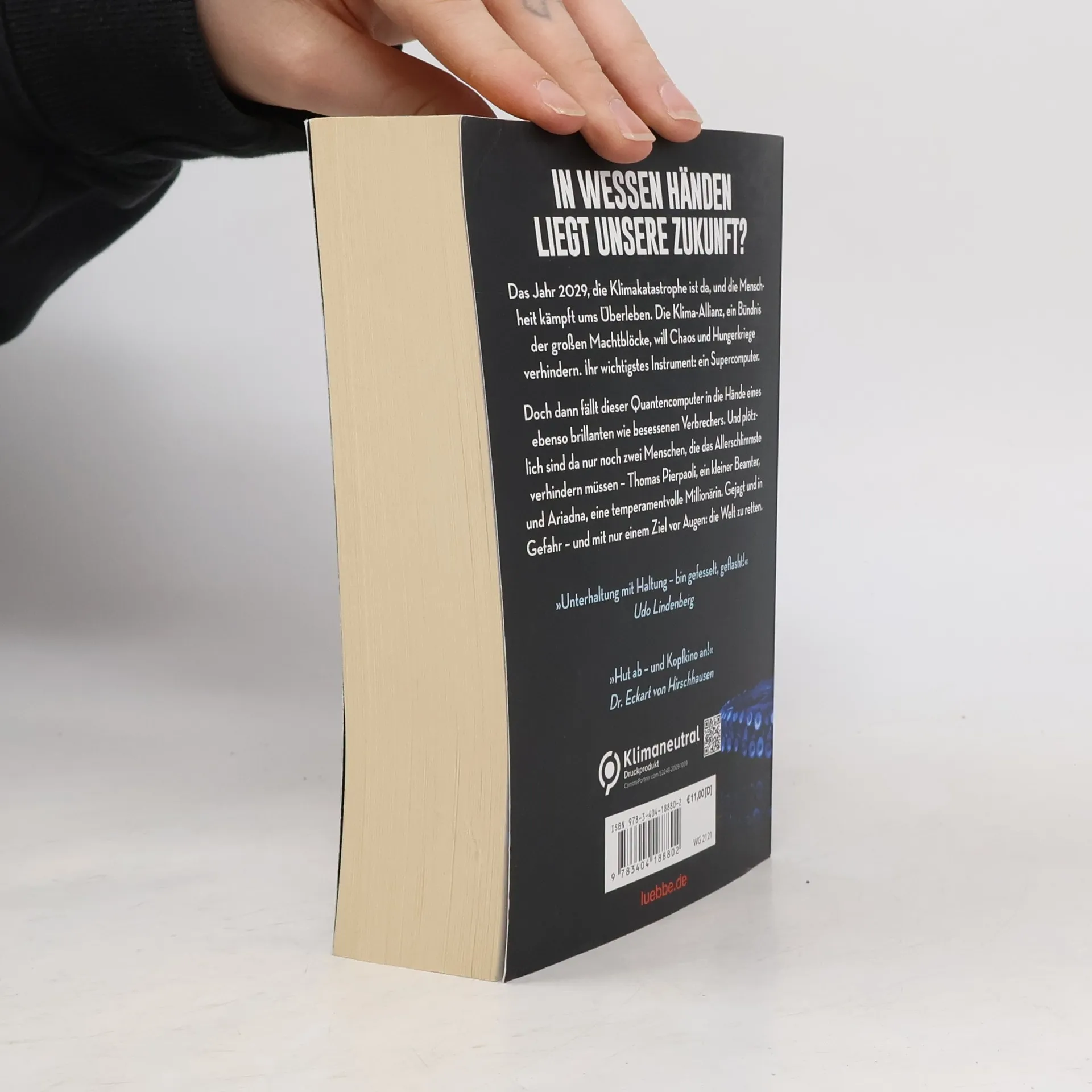 Das Jahr 2029, die Klimakatastrophe ist da, und die Menschheit kämpft ums Überleben. Die Klima-Allianz, ein Bündnis der großen Machtblöcke, will Chaos und Hungerkriege verhindern. Ihr wichtigstes Instrument: ein Supercomputer. Doch dann fällt dieser Quantencomputer in die Hände eines ebenso brillanten wie besessenen Verbrechers. Und plötzlich sind da nur noch zwei Menschen, die das Allerschlimmste verhindern müssen - Thomas Pierpaoli, ein kleiner Beamter, und Ariadna, eine temperamentvolle Millionärin. Gejagt und in Gefahr - und mit nur einem Ziel vor Augen: die Welt zu retten.