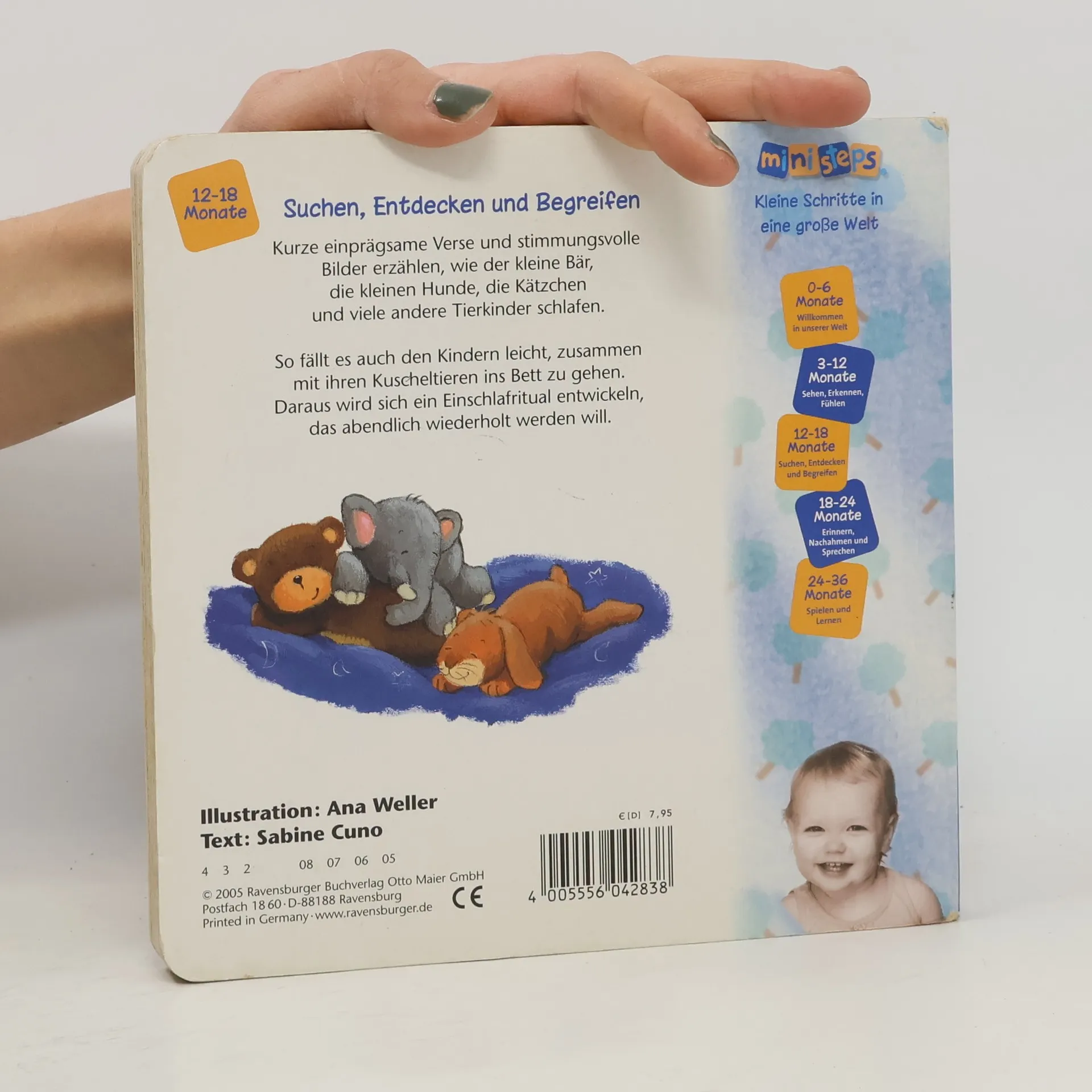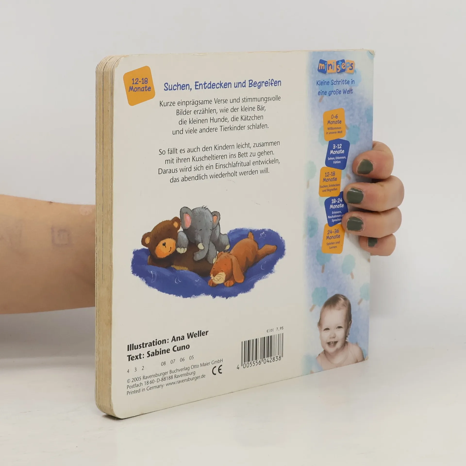 Ein Lieblings-Gutenacht-Buch für die Kleinsten! Liebevolle Gute-Nacht-Szenen zeigen, wie der kleine Bär, die kleinen Hunde und viele andere Tierkinder schlafen gehen. Zweiundzwanzig stimmungsvolle Bilder begleiten die Geschichten. Kurze emotionale Reime animieren zum Mitsprechen und sind ein ideales Ritual für Kinder, sodass es ihnen leichtfällt, ins Bett zu gehen. Diese besondere Geschichte bietet ein wunderschönes Einschlafritual und sollte in keinem Kinderzimmer fehlen. Die Bären schlafen in ihrer Höhle, die Schnecke zieht sich in ihr Haus zurück, und die Hundekinder kuscheln sich aneinander. Wie schlafen Igelkinder, Löwenbabys und kleine Pinguine? Fast 20 verschiedene Tierkinder werden liebevoll zu Bett gebracht. Die stimmungsvollen Bilder zeigen die Tiere und ihre Kinder in ihrem natürlichen Zuhause und bieten viele Gesprächsanlässe für Eltern und Kind. Die Reime führen durch das Buch, bis auch das Kind mit seinen Kuscheltieren schlafen geht. So wird das Einschlafen kinderleicht. - Unterstützt das Einschlafritual - Reime fördern die Sprachentwicklung - Mit den Lieblingstieren der Kleinen Vertrauen schenken. ministeps begleitet Babys und Kleinkinder auf ihren ersten Schritten ins Leben. Die vielfältigen ministeps Produkte bieten optimale Sinnesanreize, fördern das Erkennen von Farben, Formen und Bildern und ermutigen zum Krabbeln und Sprechen. Alle Produkte sind von höchster Ravensburger Qualität.