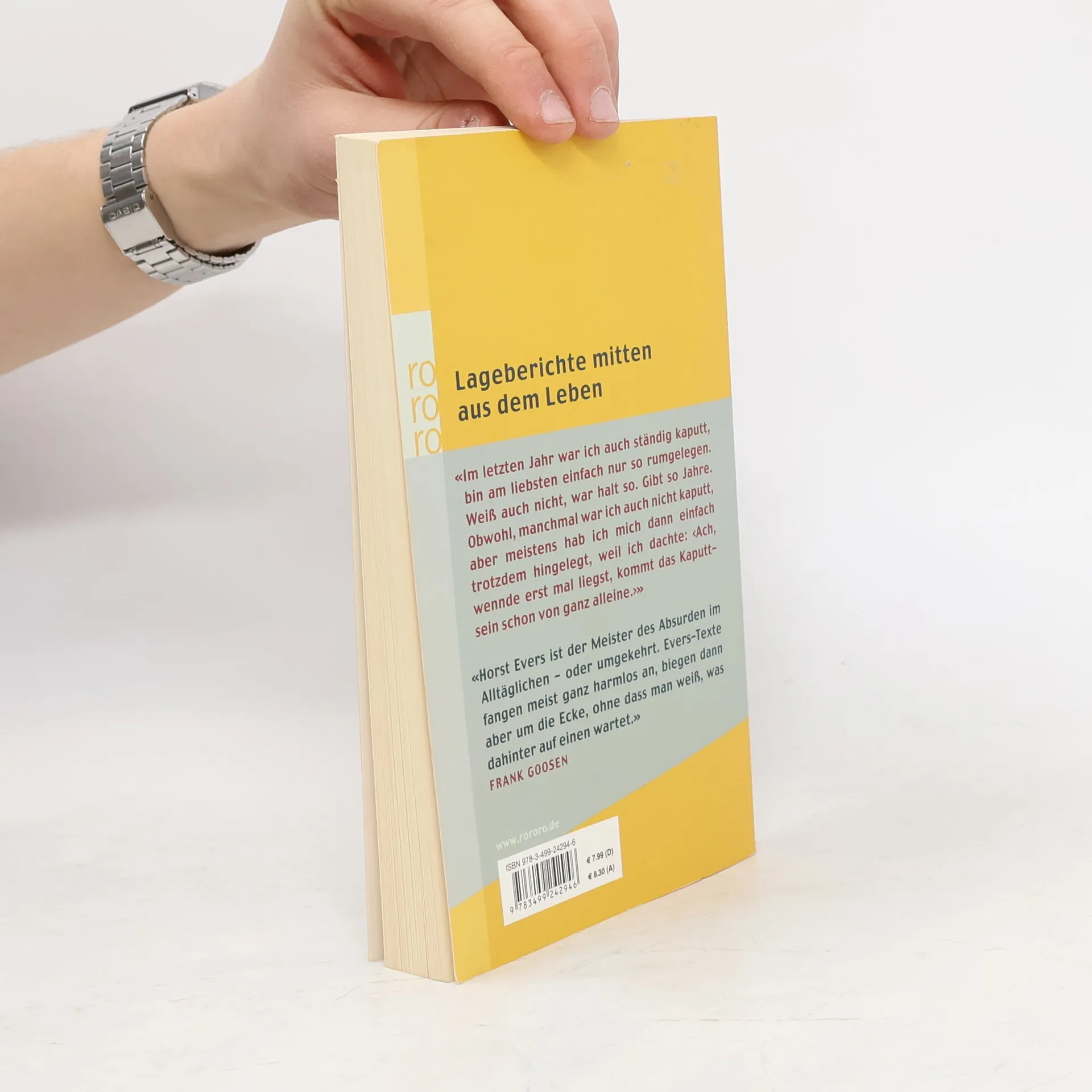 Lageberichte mitten aus dem Leben. „Im letzten Jahr war ich auch ständig kaputt, bin am liebsten einfach nur so rumgelegen. Weiß auch nicht, war halt so. Gibt so Jahre. Obwohl, manchmal war ich auch nicht kaputt, aber meistens hab ich mich dann einfach trotzdem hingelegt, weil ich dachte: ‚Ach, wennde erst mal liegst, kommt das Kaputtsein schon von ganz allein.‘“ „Horst Evers ist der Meister des Absurden im Alltäglichen – oder umgekehrt. Evers-Texte fangen meist ganz harmlos an, biegen dann aber um die Ecke, ohne dass man weiß, was dahinter auf einen wartet.“ (Frank Goosen)