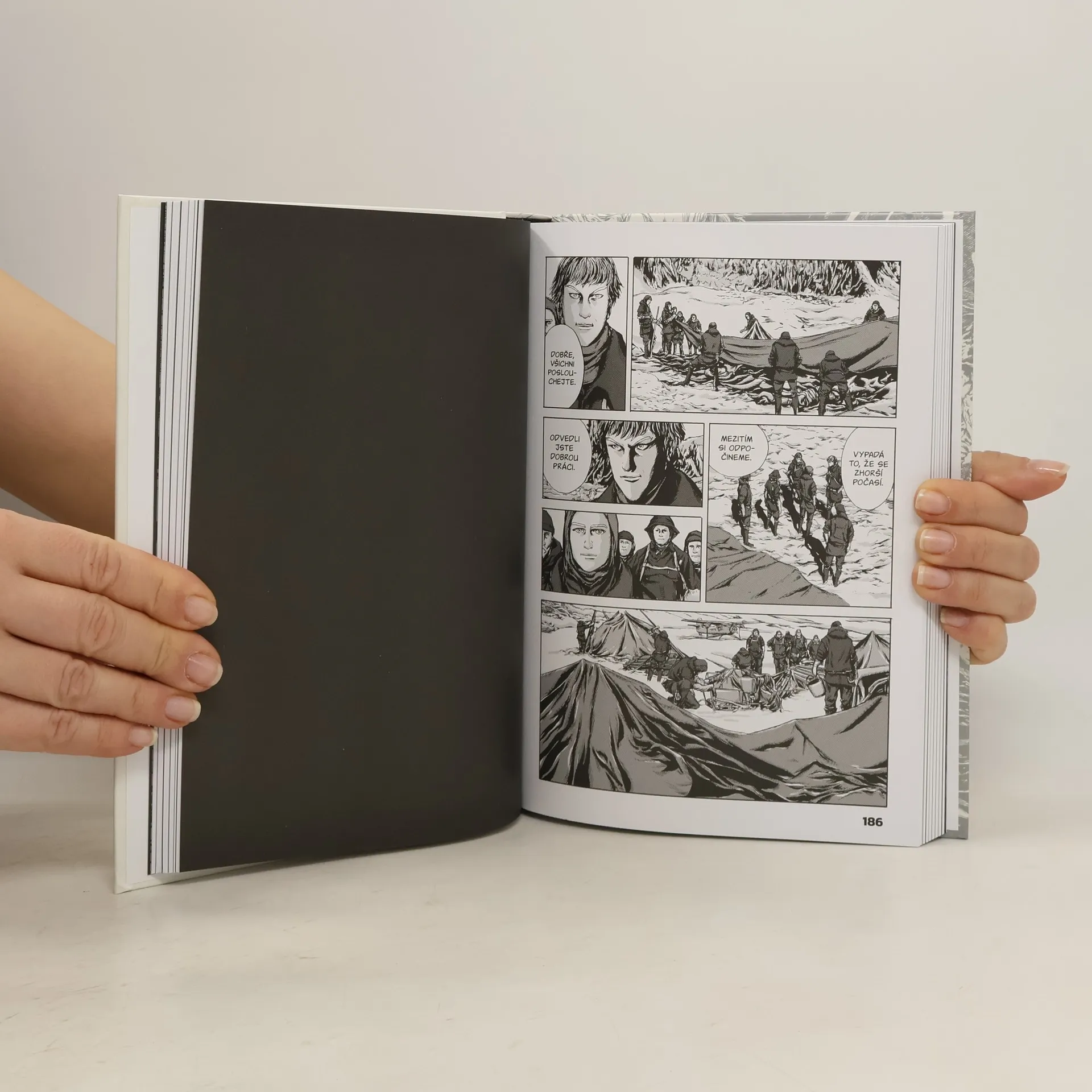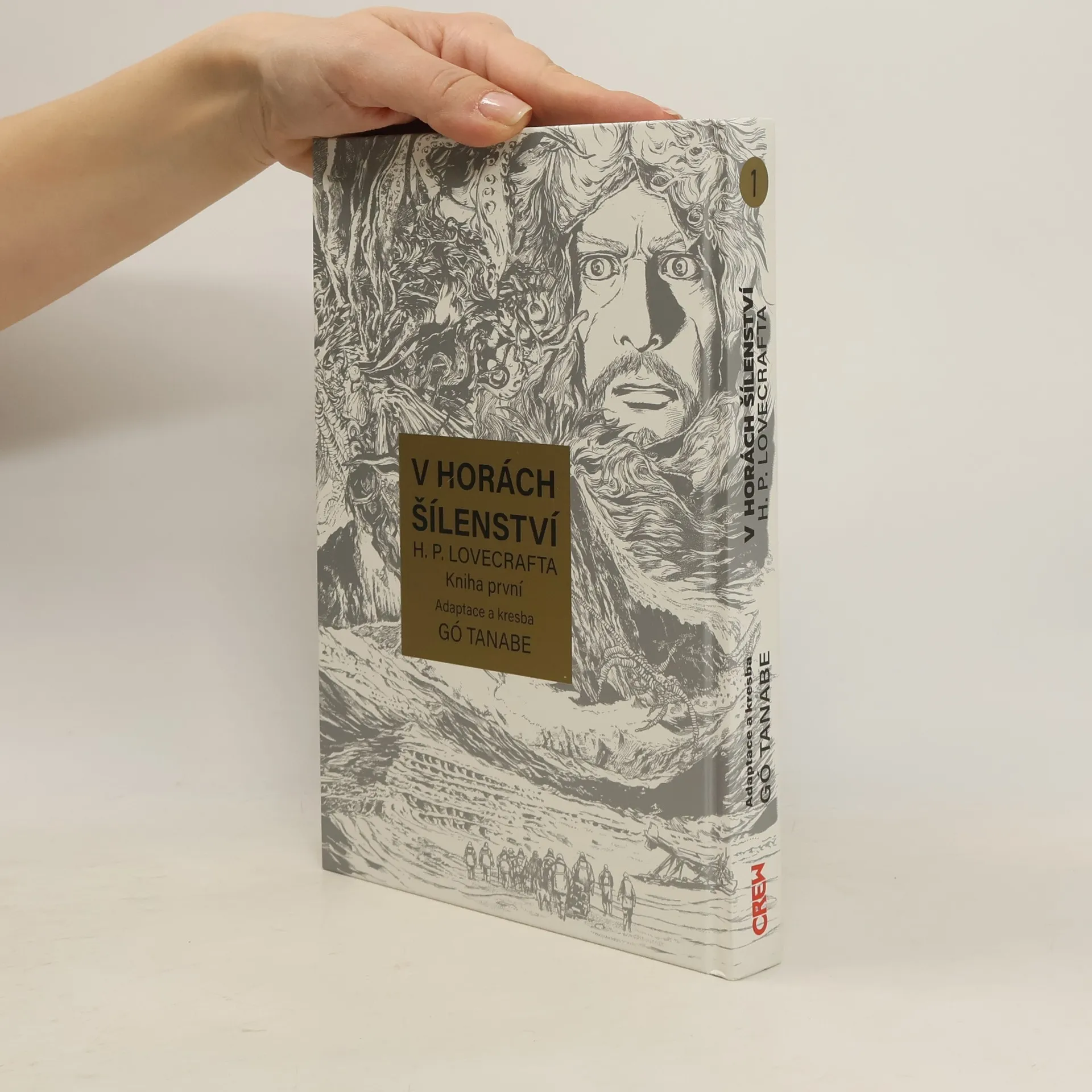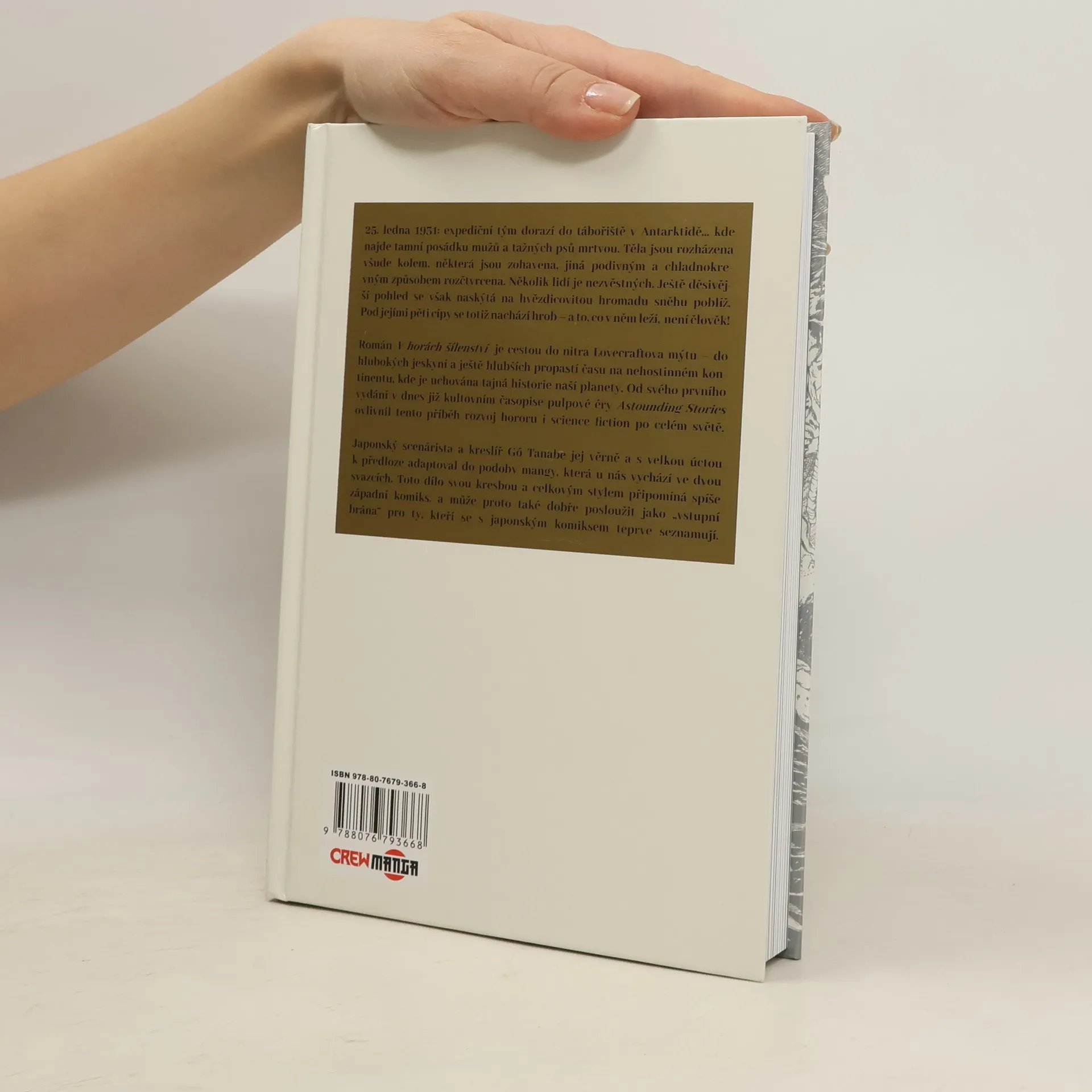 25. ledna 1931: expediční tým dorazí do tábořiště v Antarktidě... kde najde tamní posádku mužů a tažných psů mrtvou. Těla jsou rozházena všude kolem, některá jsou zohavena, jiná podivným a chladnokrevným způsobem rozčtvrcena. Několik lidí je nezvěstných. Ještě děsivější pohled se však naskýtá na hvězdicovitou hromadu sněhu poblíž. Pod jejími pěti cípy se totiž nachází hrob – a to, co v něm leží, není člověk! Román V horách šílenství je cestou do nitra Lovecraftova mýtu – do hlubokých jeskyní a ještě hlubších propastí času na nehostinném kontinentu, kde je uchována tajná historie naší planety. Od svého prvního vydání v dnes již kultovním časopise pulpové éry Astounding Stories ovlivnil tento příběh rozvoj hororu i science fiction po celém světě. Japonský scenárista a kreslíř Gó Tanabe jej věrně a s velkou úctou k předloze adaptoval do podoby mangy, jejíž první polovinu najdete v této knize a jež svou kresbou a celkovým stylem připomíná spíše západní komiks, a může proto také dobře posloužit jako „vstupní brána“ pro ty, kteří se s japonským komiksem teprve seznamují.