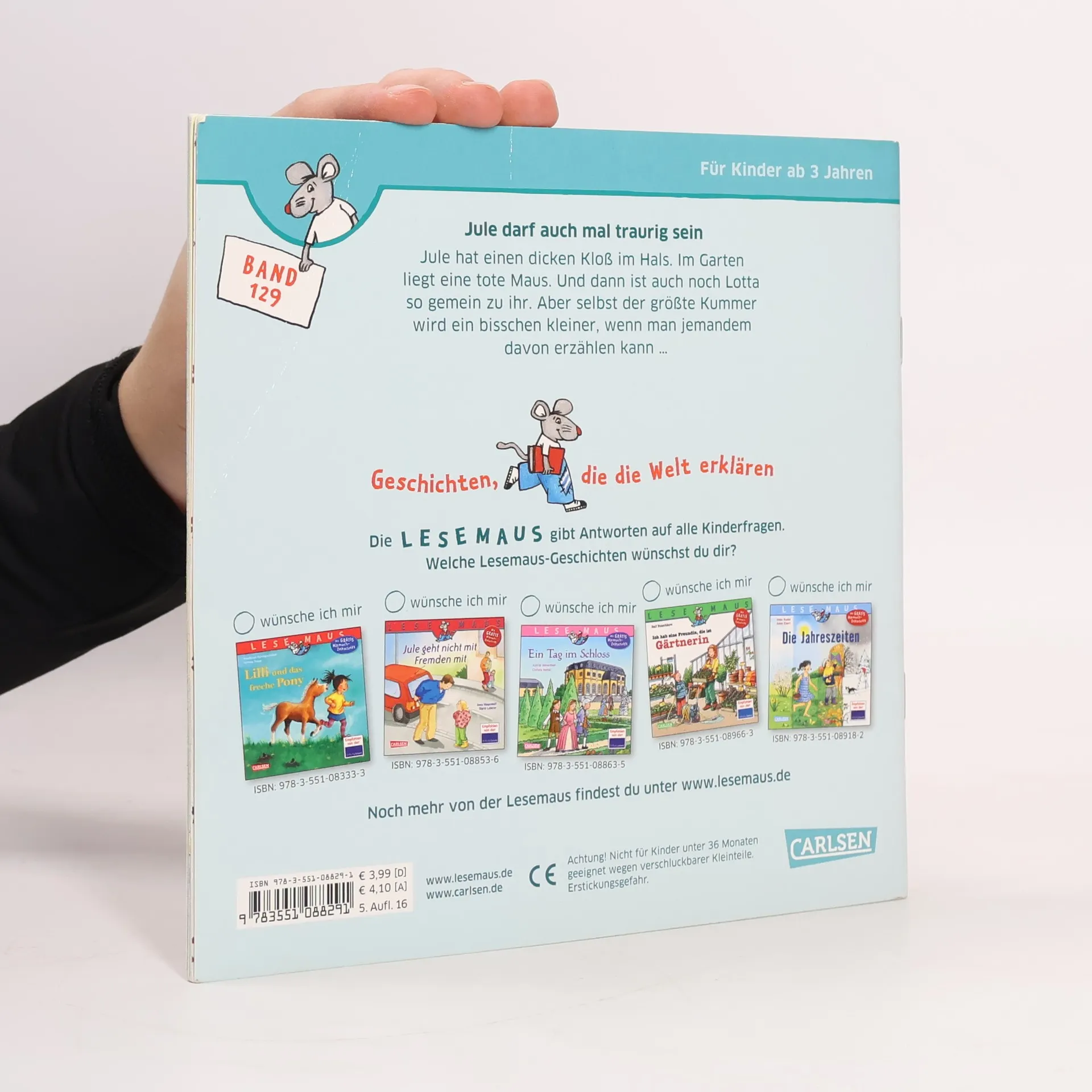 Jule hat einen dicken Kloß im Hals. Im Garten liegt eine tote Maus. Und dann ist auch noch Lotta so gemein zu ihr. Aber selbst der größte Kummer wird ein bisschen kleiner, wenn man jemandem davon erzählen kann ... Diese Geschichte hilft Kindern, ihre Gefühle zu erkennen und zu verstehen. Mit Nachwort zum Thema für Eltern und Erzieher. Diese Geschichte könnt ihr euch in der kostenlosen App „Der kleine Vorleser“ auch vorlesen lassen! So geht’s: Öffnet den Appstore eures Gerätes und gebt im Suchfeld „Der kleine Vorleser“ ein. Installiert die App und öffnet sie. Tippt auf euer Buch und scannt die Vorderseite des Buches mit der Kamera eures Gerätes ein. Nun startet der Vorlesespaß! Mit dieser App könnt ihr euch auch viele andere eurer Bücher vorlesen lassen. Viel Spaß beim Zuhören!