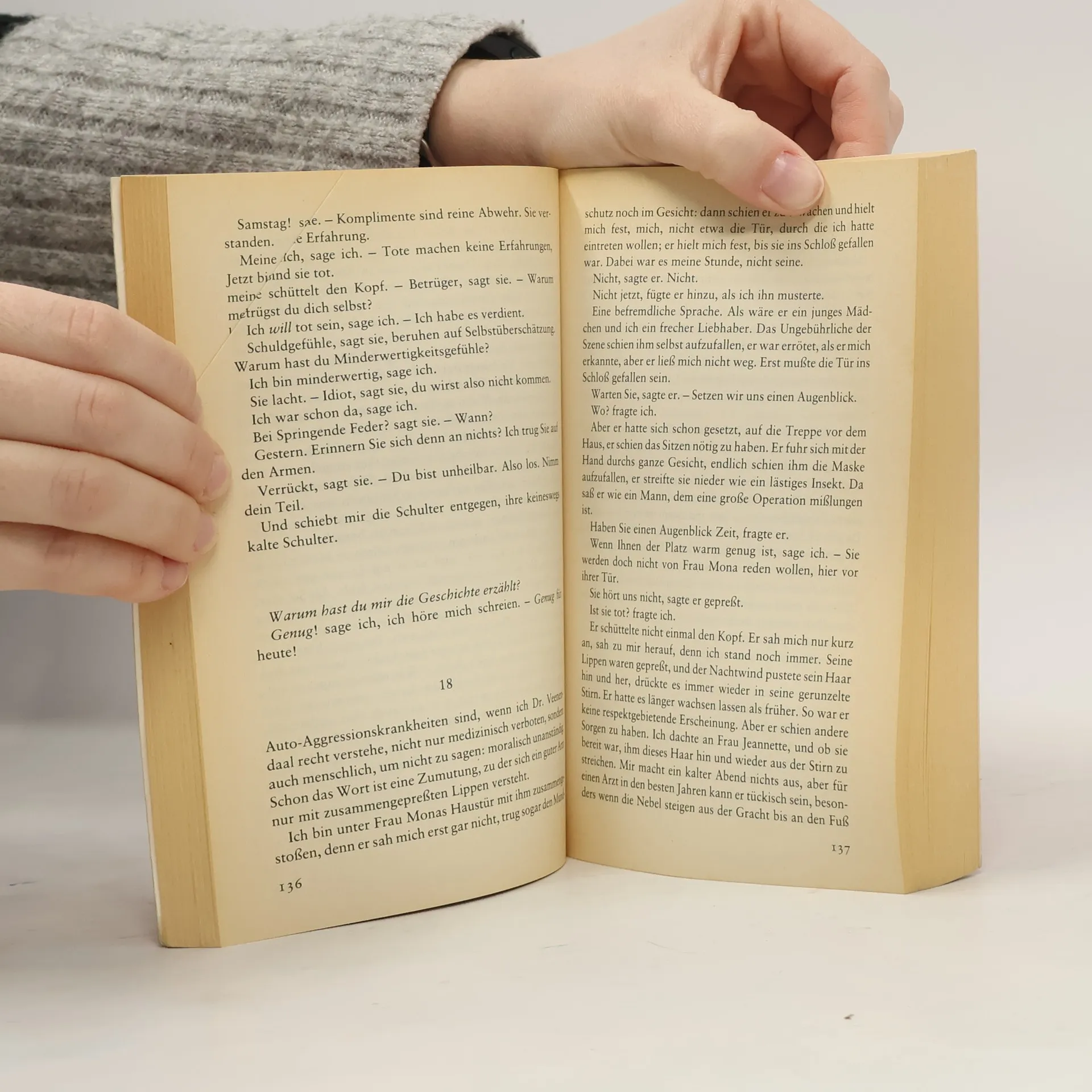 Wie findet sich ein Vampir heute in einer Stadt wie Amsterdam zurecht? Er versucht, sich legal, sozusagen redlich zu ernähren: als Saugtherapeut. Über seine Kundschaft, mit Vorliebe Arztfrauen, weiß er Geschichten. Aber Mona, seine einzige nächtliche Zuhörerin, will sich mit erzählten Figuren nicht zufriedengeben und hat Gründe, diesen Erzähler namens Samstag auf seine Stichhaltigkeit hin zu prüfen. Was bedeutet es, wenn er sich über die Medizin lustig macht? Was meint er eigentlich, wenn er sich selbst »tot« nennt? Ist er fähig, sie leben zu lassen – erzählt er um ihr Leben oder redet er sie tot? Die Lösung im dritten Teil dieses Buches ist zugleich einfach und überraschend. Sie läßt dem vampirischen Erzähler keine andere Wahl, als sich zu ändern.