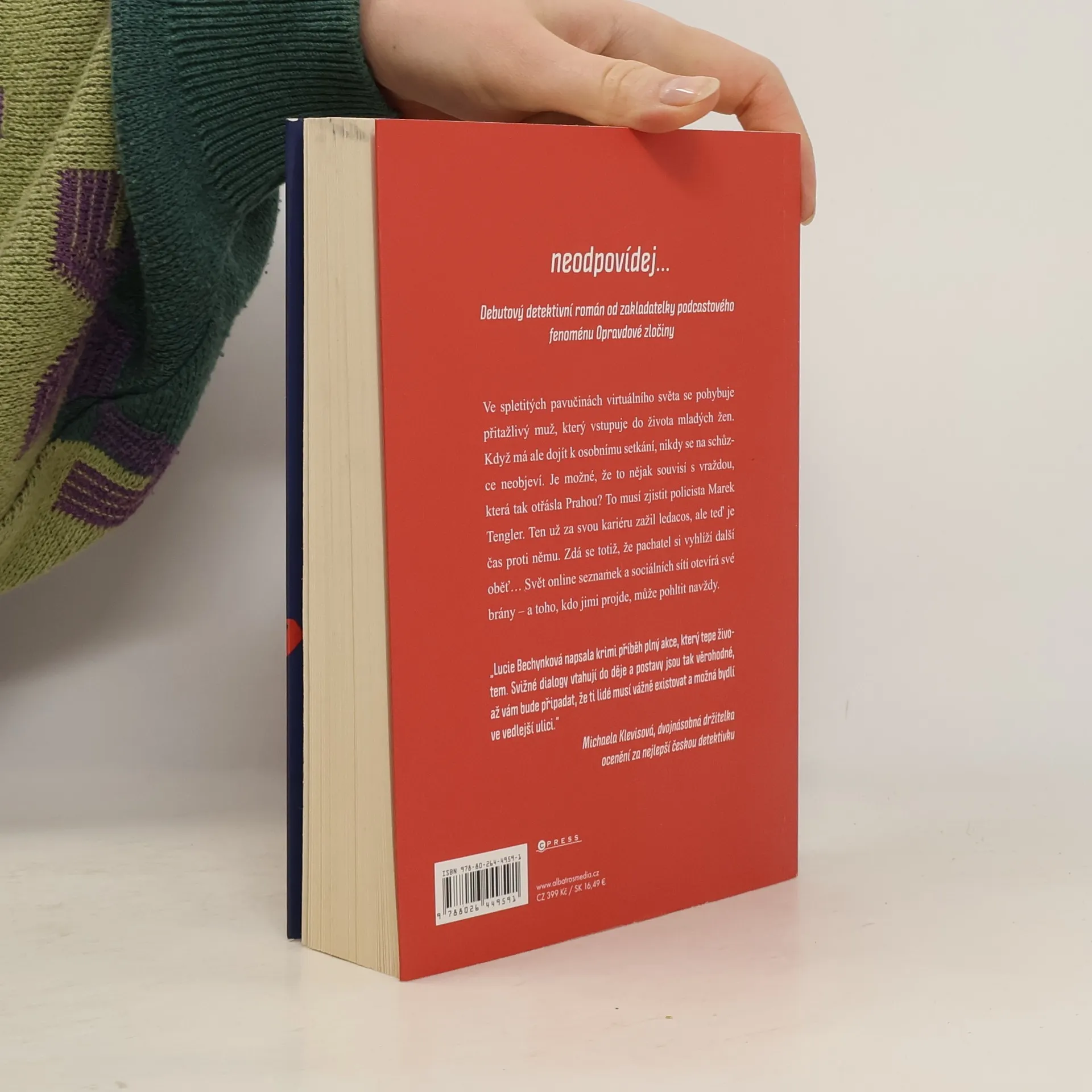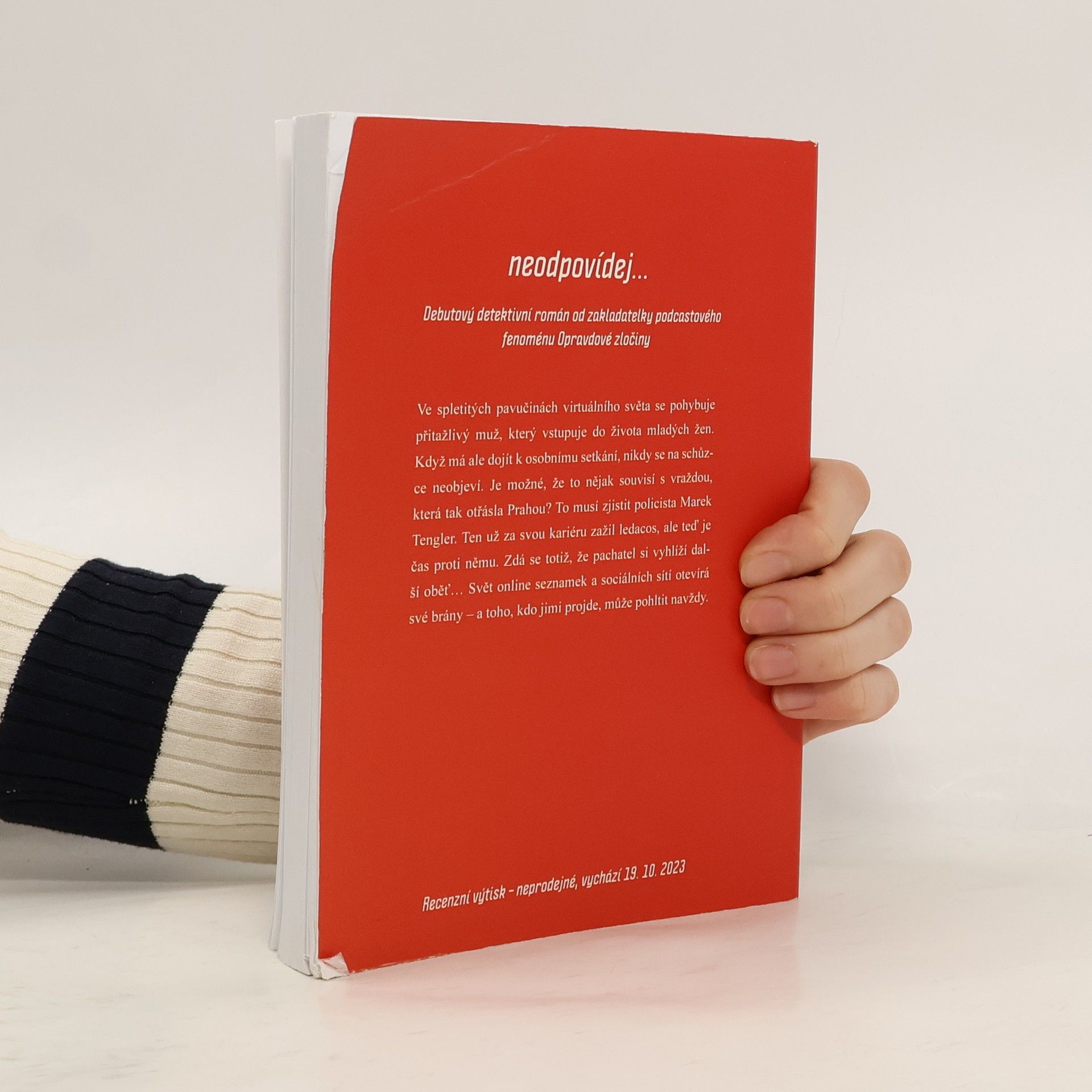 Debutový detektivní román od zakladatelky podcastového fenoménu Opravdové zločiny Ve spletitých pavučinách virtuálního světa se pohybuje přitažlivý muž, který vstupuje do života mladých žen. Když má ale dojít k osobnímu setkání, nikdy se na schůzce neobjeví. Je možné, že to nějak souvisí s vraždou, která tak otřásla Prahou? To musí zjistit policista Marek Tengler. Ten už za svou kariéru zažil ledacos, ale teď je čas proti němu. Zdá se totiž, že pachatel si vyhlíží další oběť Svět online seznamek a sociálních sítí otevírá své brány – a toho, kdo jimi projde, může pohltit navždy.