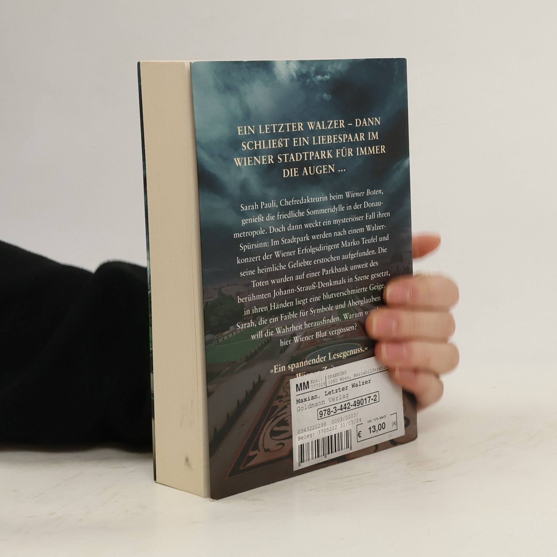 Ein letzter Walzer – dann schließt ein Liebespaar im Wiener Stadtpark für immer die Augen ... Sarah Pauli, Chefredakteurin beim Wiener Boten, genießt die friedliche Sommeridylle in der Donaumetropole. Doch dann weckt ein mysteriöser Fall ihren Spürsinn: Im Stadtpark werden nach einem Walzerkonzert der Wiener Erfolgsdirigent Marko Teufel und seine heimliche Geliebte erstochen aufgefunden. Die Toten wurden auf einer Parkbank unweit des berühmten Johann-Strauß-Denkmals in Szene gesetzt, in ihren Händen liegt eine blutverschmierte Geige. Sarah, die ein Faible für Symbole und Aberglauben hat, will die Wahrheit herausfinden. Warum wurde hier Wiener Blut vergossen?