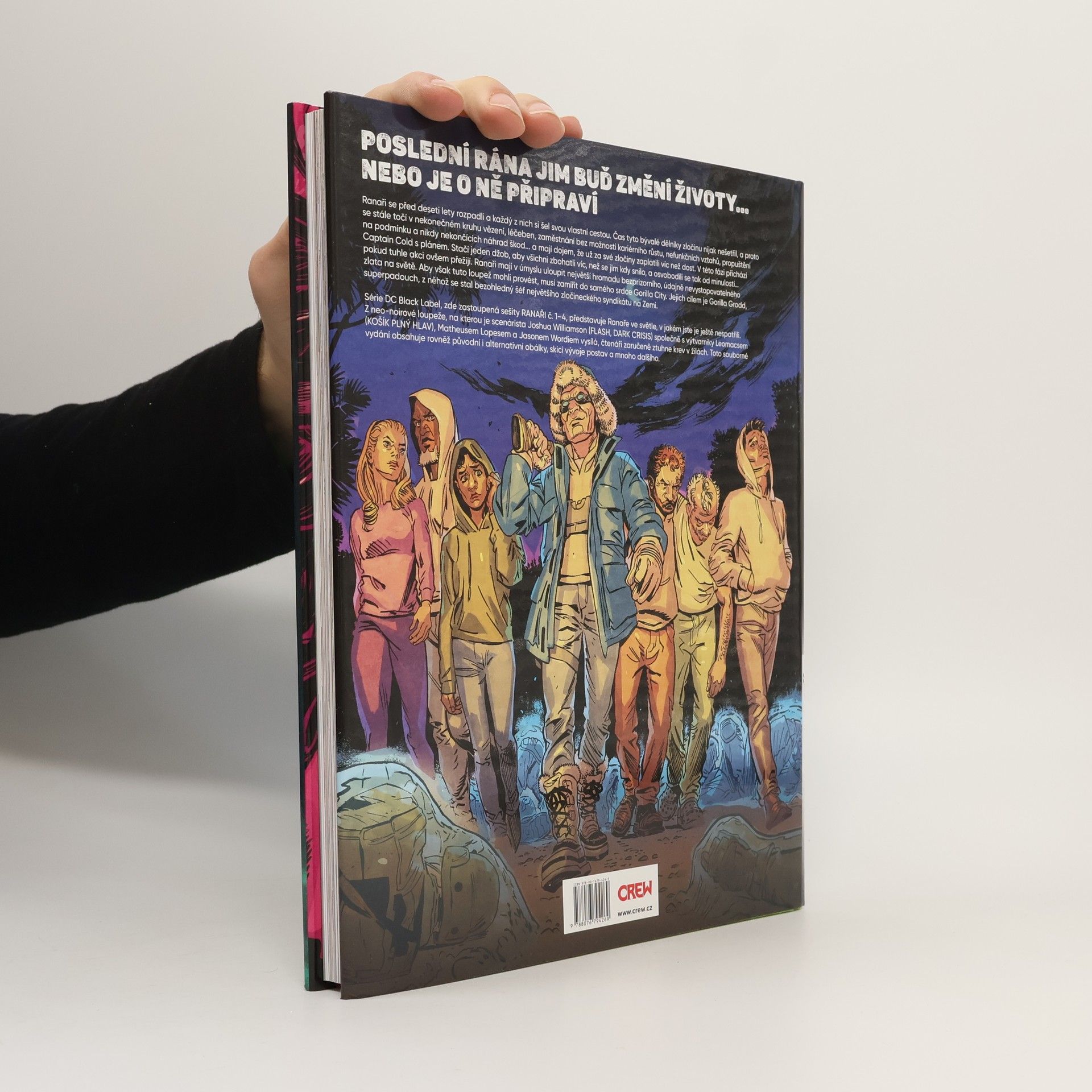 POSLEDNÍ RÁNA JIM BUĎ ZMĚNÍ ŽIVOTY… NEBO JE O NĚ PŘIPRAVÍ Ranaři se před deseti lety rozpadli a každý z nich si šel svou vlastní cestou. Čas tyto bývalé dělníky zločinu nijak nešetřil, a proto se stále točí v nekonečném kruhu vězení, léčeben, zaměstnání bez možnosti kariérního růstu, nefunkčních vztahů, propuštění na podmínku a nikdy nekončících poplatků jakožto náhrad škod... Ranaři mají dojem, že už za své zločiny zaplatili víc než dost. A v této fázi přichází Captain Cold s plánem. Stačí jeden džob, aby všichni zbohatli víc, než se jim kdy snilo, a osvobodili se tak od minulosti… pokud tuhle akci ovšem přežijí. Ranaři mají v úmyslu uloupit největší zásobu bezprizorního, údajně nevystopovatelného zlata na světě. Aby však tuto loupež mohli provést, musí zamířit do samého srdce Gorilla City a okrást zde Gorilla Grodda, superpadoucha, z něhož se stal bezohledný šéf největšího zločineckého syndikátu na Zemi.Série DC Black Label, zde zastoupená sešity Ranaři č. 1–4, představuje Ranaře ve světle, v jakém jste je ještě nespatřili. Z neo-noirové loupeže, na kterou je scenárista Joshua Williamson (Flash, Dark Crisis) společně s výtvarníky Leomacsem (Košík plný hlav), Matheusem Lopesem a Jasonem Wordiem vysílá, čtenáři zaručeně ztuhne krev v žilách. Toto souborné vydání obsahuje rovněž původní i alternativní obálky, skici vývoje postav a mnoho dalšího.