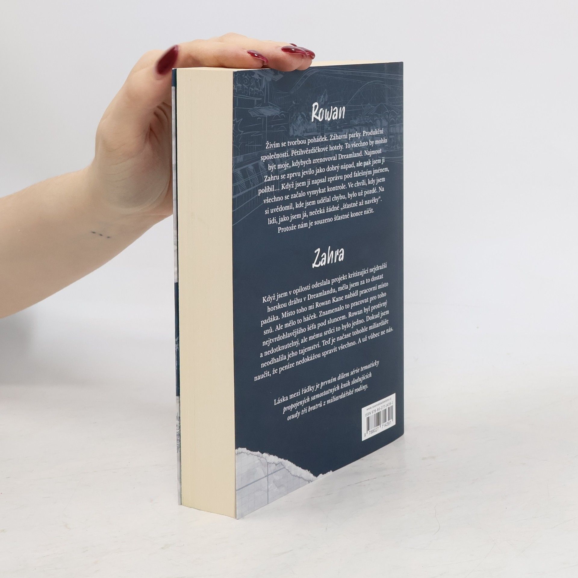Rowan. Živím se tvorbou pohádek. Zábavní parky. Produkční společnosti. Pětihvězdičkové hotely. To všechno by mohlo být moje, kdybych zrenovoval Dreamland. Najmout Zahru se zprvu jevilo jako dobrý nápad, ale pak jsem ji políbil Když jsem jí napsal zprávu pod falešným jménem, všechno se začalo vymykat kontrole. Když jsem si uvědomil, kde jsem udělal chybu, bylo už pozdě. Na lidi, jako jsem já, nečeká žádné „šťastně až navěky“. Protože nám je souzeno šťastné konce ničit. Zahra Když jsem v opilosti odeslala projekt kritizující nejdražší horskou dráhu v Dreamlandu, měla jsem za to dostat padáka. Místo toho mi Rowan Kane nabídl pracovní místo snů. Ale mělo to háček. Znamenalo to pracovat pro toho nejtvrdohlavějšího šéfa pod sluncem. Rowan byl protivný a nedotknutelný, ale mému srdci to bylo jedno. Dokud jsem neodhalila jeho tajemství. Teď je načase tohohle miliardáře naučit, že peníze nedokážou spravit všechno. A už vůbec ne nás. Láska mezi řádky je prvním dílem série tematicky propojených samostatných knih sledujících osudy tří bratrů z miliardářské rodiny.