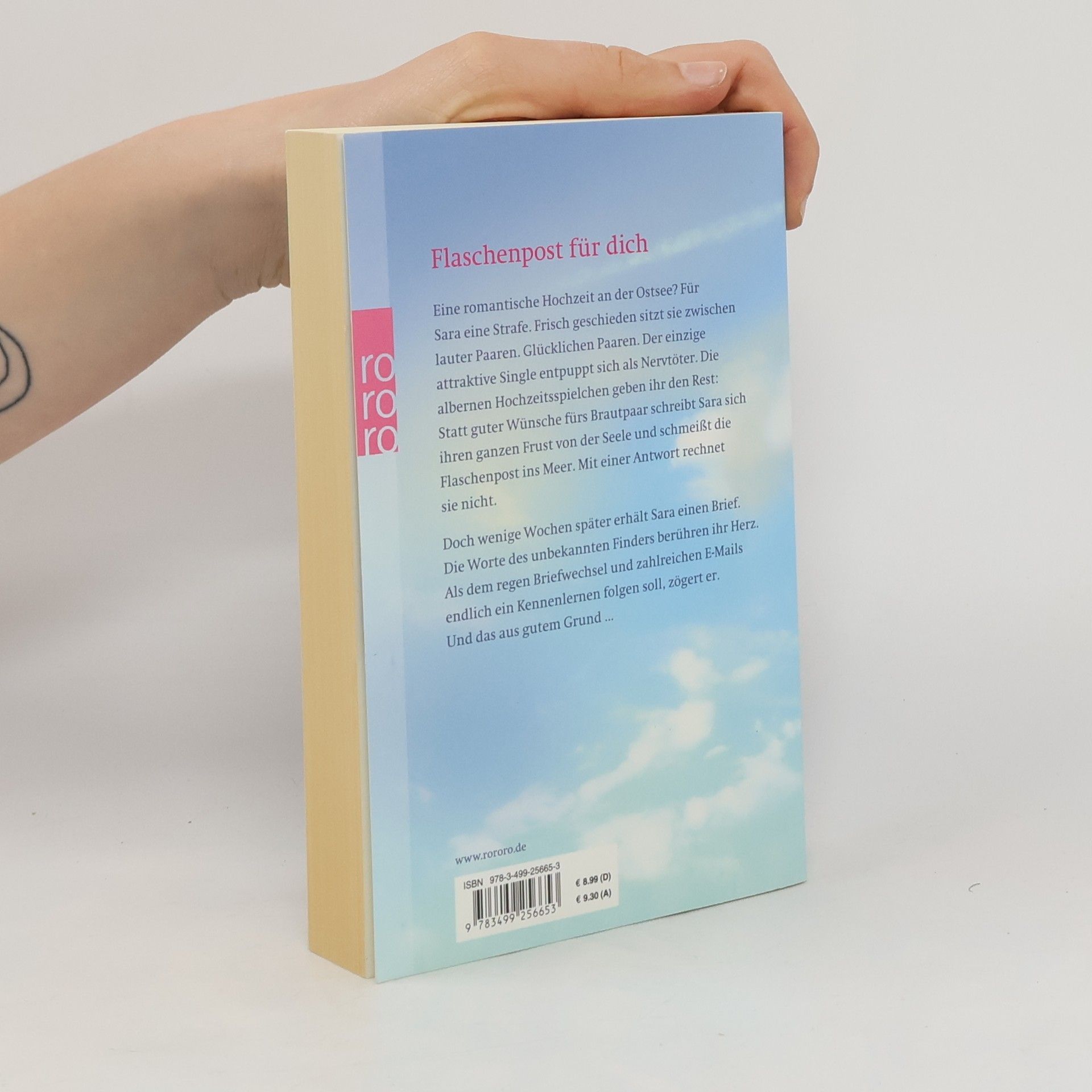 Flaschenpost für dich. Eine romantische Hochzeit an der Ostsee? Für Sara eine Strafe. Frisch geschieden sitzt sie zwischen lauter Paaren. Glücklichen Paaren. Der einzige attraktive Single entpuppt sich als Nervtöter. Die albernen Hochzeitsspielchen geben ihr den Rest: Statt guter Wünsche fürs Brautpaar schreibt Sara sich ihren ganzen Frust von der Seele und schmeißt die Flaschenpost ins Meer. Mit einer Antwort rechnet sie nicht. Doch wenige Wochen später erhält Sara einen Brief. Die Worte des unbekannten Finders berühren ihr Herz. Als dem regen Briefwechsel und zahlreichen E-Mails endlich ein Kennenlernen folgen soll, zögert er. Und das aus gutem Grund …