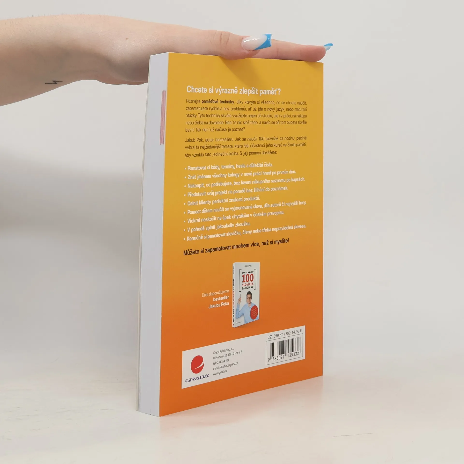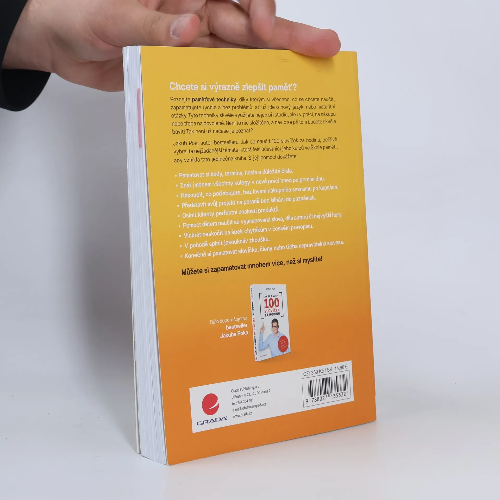 Chcete si výrazně zlepšit paměť? Poznejte paměťové techniky, díky kterým si všechno, co se chcete naučit, zapamatujete rychle a bez problémů, ať už jde o nový jazyk, nebo maturitní otázky. Tyto techniky skvěle využijete nejen při studiu, ale i v práci, na nákupu nebo třeba na dovolené. Není to nic složitého, a navíc se při tom budete skvěle bavit! Tak není už načase je poznat? Jakub Pok, autor bestselleru Jak se naučit 100 slovíček za hodinu, pečlivě vybral ta nejžádanější témata, která řeší účastníci jeho kurzů ve Škole paměti, aby vznikla tato jedinečná kniha. S její pomocí dokážete spoustu užitečných věcí, např. pamatovat si kódy, termíny, hesla a důležitá čísla, představit svůj projekt na poradě bez šilhání do poznámek, konečně si pamatovat slovíčka, členy nebo třeba nepravidelná slovesa atd. Můžete si zapamatovat mnohem více, než si myslíte!