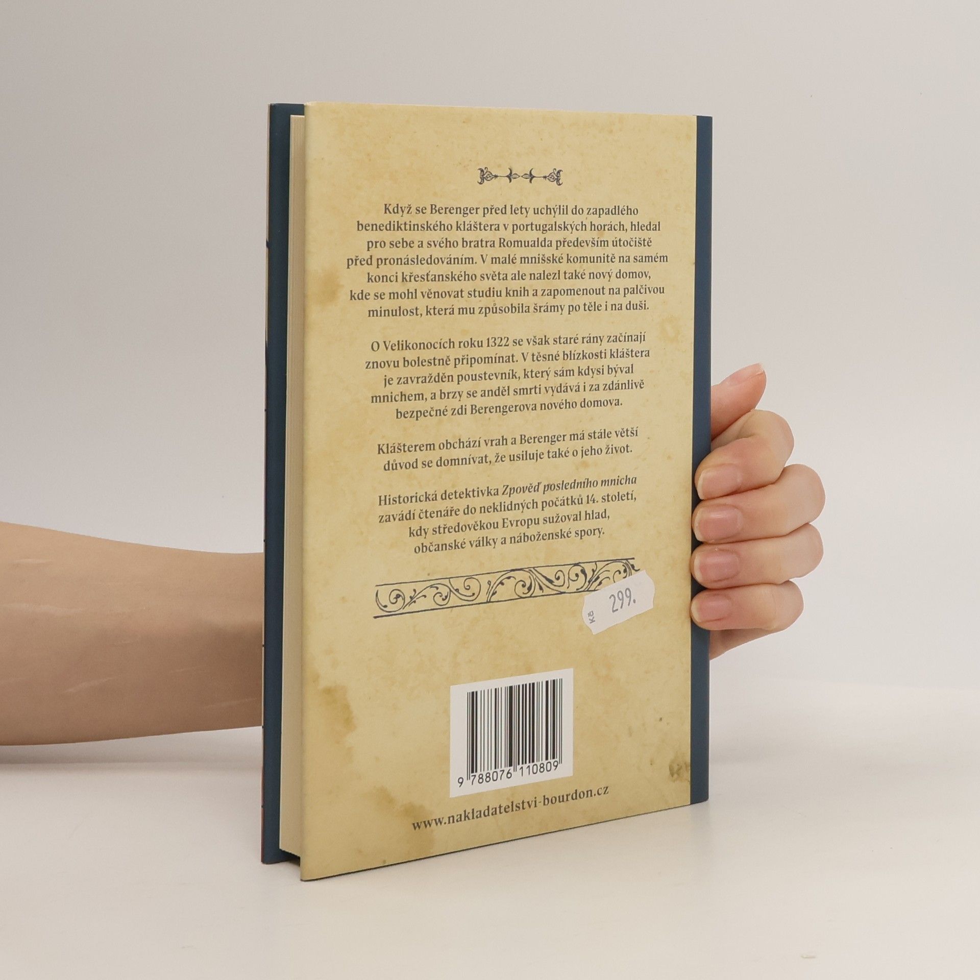Když se Berenger před lety uchýlil do zapadlého benediktinského kláštera v portugalských horách, hledal pro sebe a svého bratra Romualda především útočiště před pronásledováním. V malé mnišské komunitě na samém konci křesťanského světa ale nalezl také nový domov, kde se mohl věnovat studiu knih a zapomenout na palčivou minulost, která mu způsobila šrámy po těle i na duši.O Velikonocích roku 1322 se však staré rány začínají znovu bolestně připomínat. V těsné blízkosti kláštera je zavražděn poustevník, který sám kdysi býval mnichem, a brzy se anděl smrti vydává i za zdánlivě bezpečné zdi Berengerova nového domova.Klášterem obchází vrah a Berenger má stále větší důvod se domnívat, že usiluje také o jeho život.Historická detektivka Zpověď posledního mnicha zavádí čtenáře do neklidných počátků 14. století, kdy středověkou Evropu sužoval hlad, občanské války a náboženské spory.