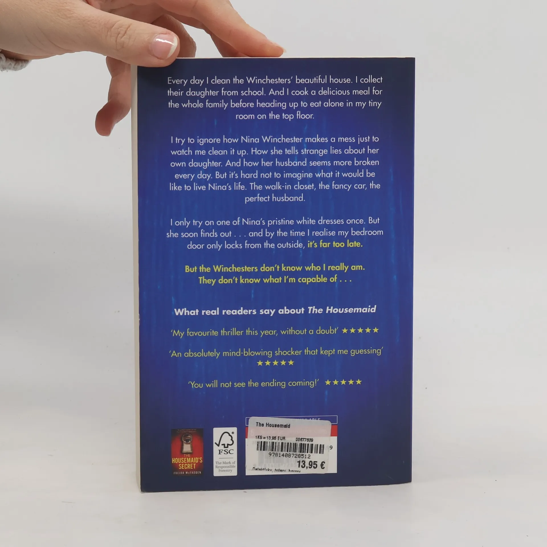 "Welcome to the family," Nina Winchester says as I shake her elegant, manicured hand. I smile politely, gazing around the marble hallway. Working here is my last chance to start fresh. I can pretend to be whoever I like. But I'll soon learn that the Winchesters' secrets are far more dangerous than my own . . .Every day I clean the Winchesters' beautiful house top to bottom. I collect their daughter from school. And I cook a delicious meal for the whole family before heading up to eat alone in my tiny room on the top floor. I try to ignore how Nina makes a mess just to watch me clean it up. How she tells strange lies about her own daughter. And how her husband Andrew seems more broken every day. But as I look into Andrew's handsome brown eyes, so full of pain, it's hard not to imagine what it would be like to live Nina's life. The walk-in closet, the fancy car, the perfect husband. I only try on one of Nina's pristine white dresses once. Just to see what it's like. But she soon finds out... and by the time I realize my attic bedroom door only locks from the outside, it's far too late. But I reassure myself: the Winchesters don't know who I really am. They don't know what I'm capable of . . .