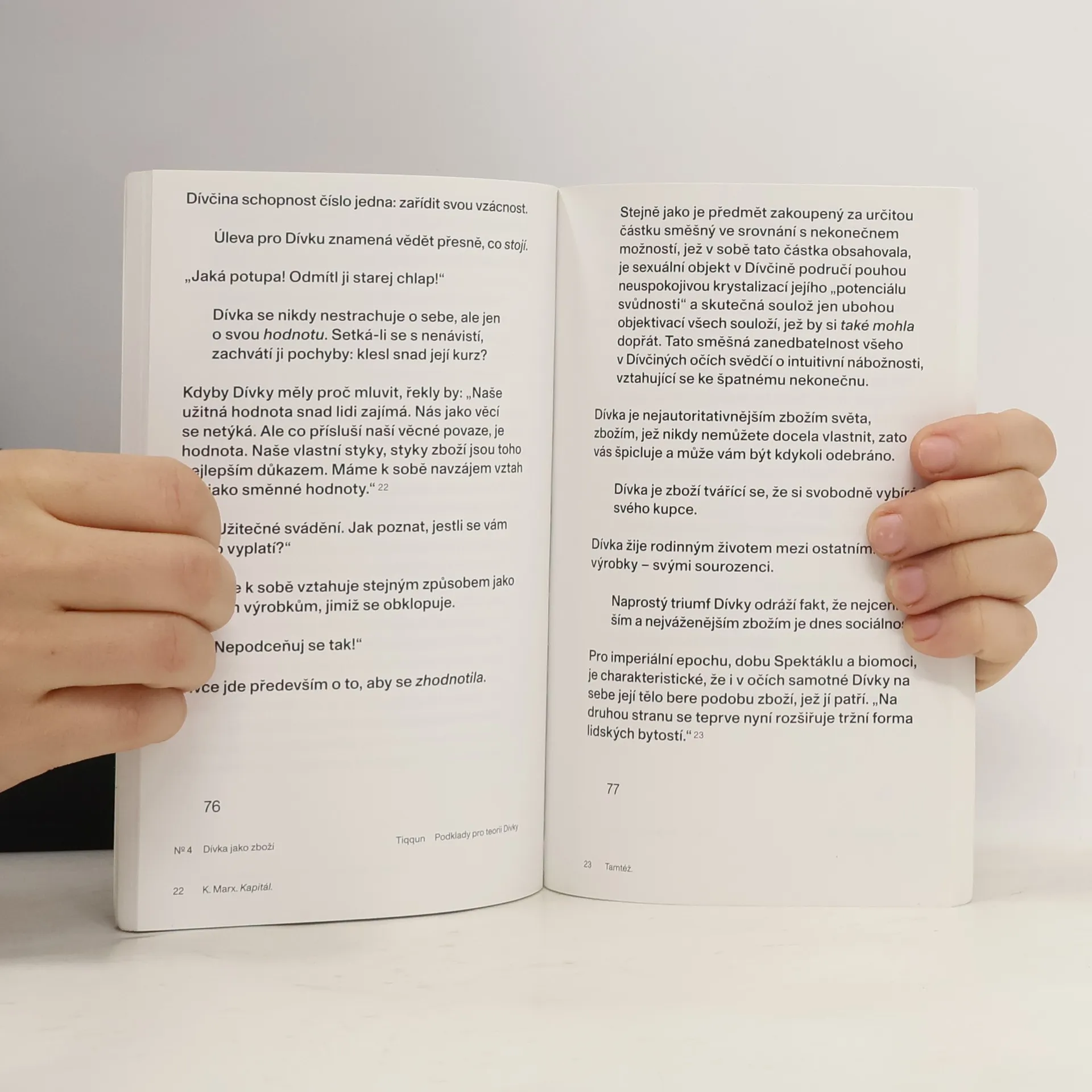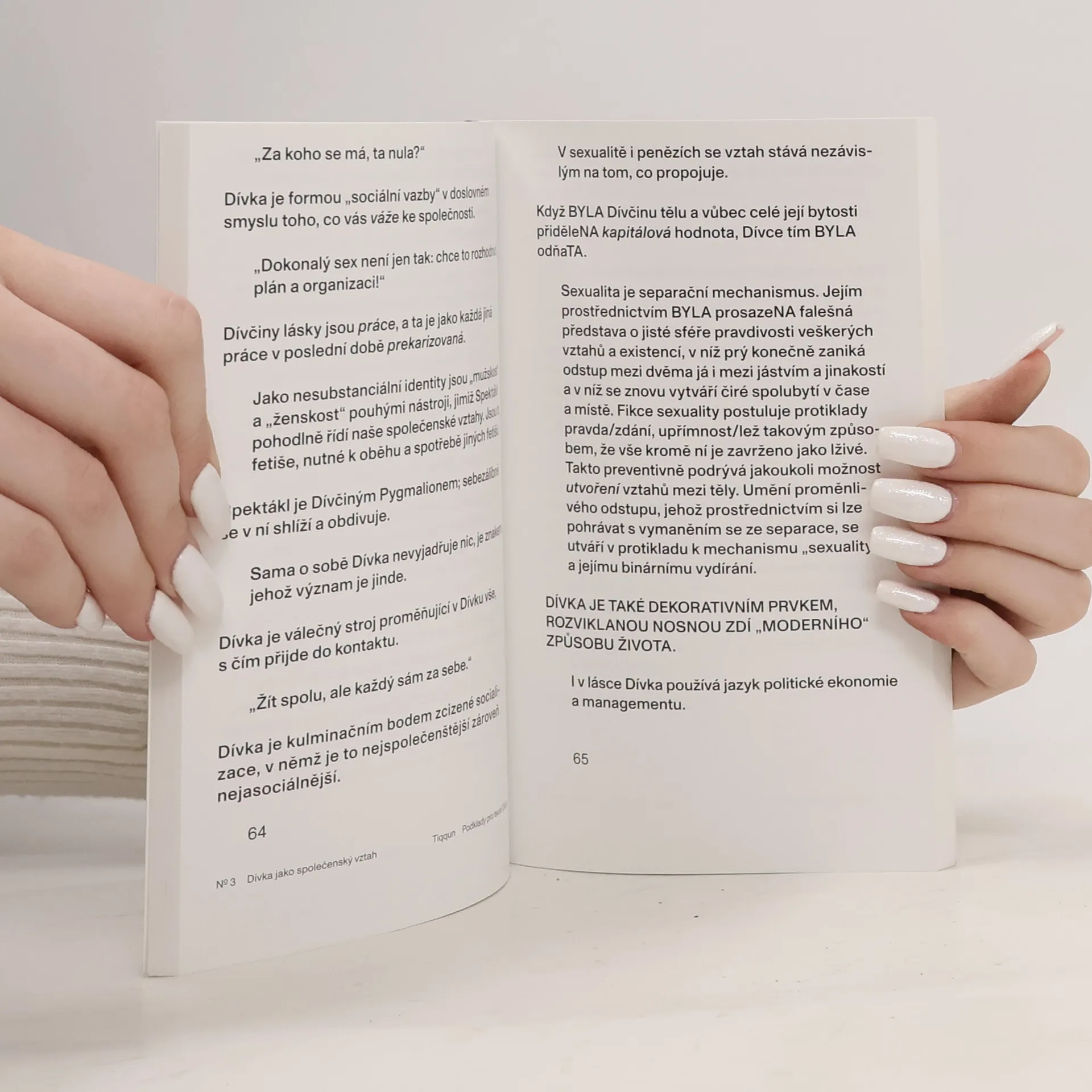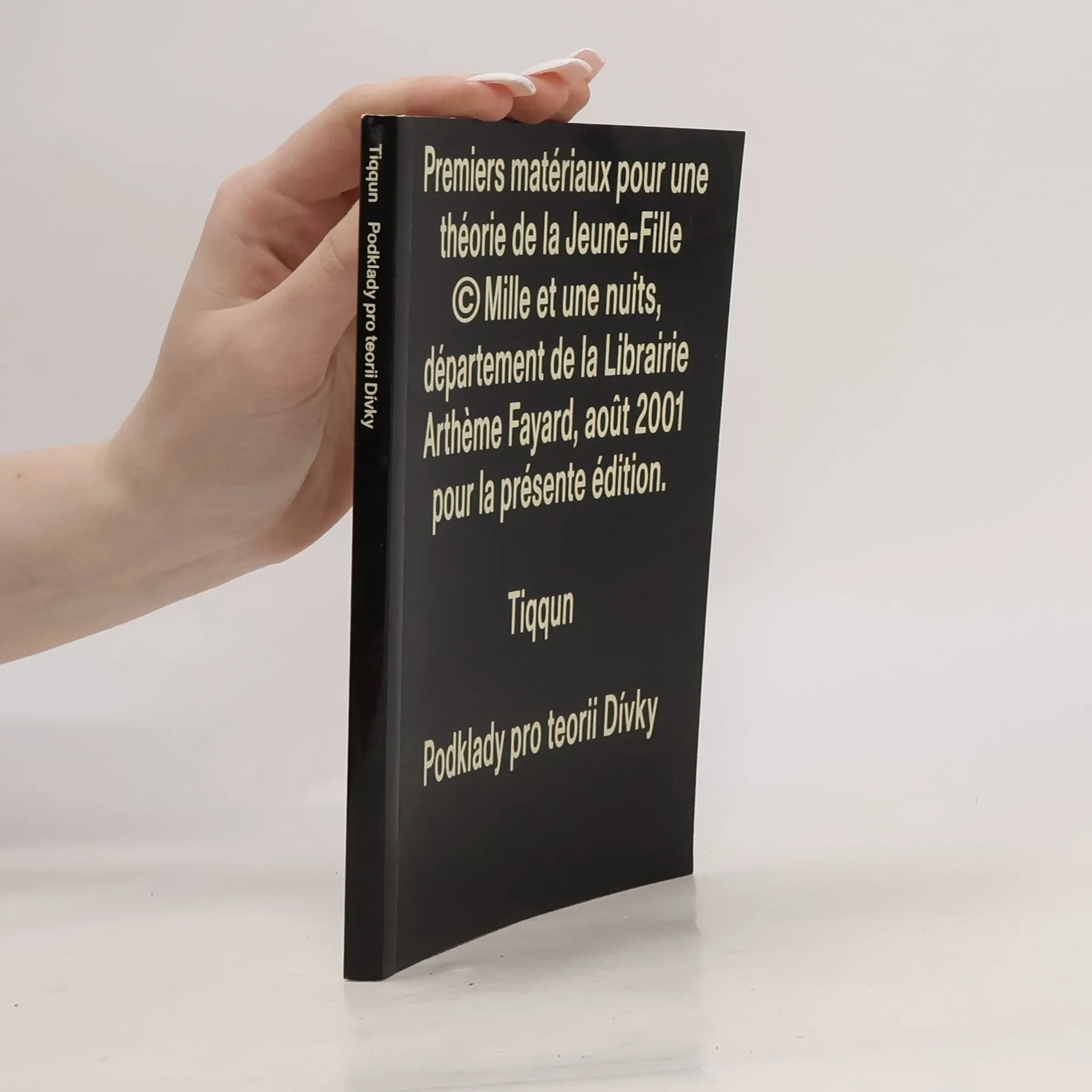 Podklady pro teorii dívky“ je pravděpodobně nejdůležitější a nejinovativnější esej posledních 20 let. Anonymní francouzský aktivistický kolektiv Tiqqun v ní analyzuje příčiny a různé procesy „mechanizace těl a duší“. Inovativně popisuje důsledky velkolepé tržní ekonomiky na své současníky, konkrétně na jejich zvyky a životní styly. Téma bohatě ilustrují příklady ze skutečného života. "Dívka je v současnosti nejluxusnější komoditou na trhu s výrobky podléhajícími rychlé zkáze, vlajkovou lodí mezi zbožím páté průmyslové revoluce, tou, jež prodává všechny ostatní, od životního pojištění až po jadernou elektrárnu, monstrózní, ale velmi skutečný sen těch nejdrzejších a nejvrtošivějších obchodníků: autonomním zbožím, jež chodí, mluví a umlčuje, konečně živou věcí, která se již života nezmocňuje, ale stravuje ho. Tři tisíce let neúnavné dřiny miliard zavalitých hokynářů, generace za generací, nacházejí v Dívce své geniální vyvrcholení, je totiž zbožím, které nelze spálit, které se samo množí, je nezcizitelným a nepřevoditelným vlastnictvím, za něž se nicméně platí, ctností, jež se neustále zpeněžuje, děvkou, jež vyžaduje úctu, smrtí, převalující se sama v sobě, je zákonem i policií současně... Kdo v její definitivní a pochmurné kráse nezahlédl alespoň záblesk sex-appealu anorganického?”
