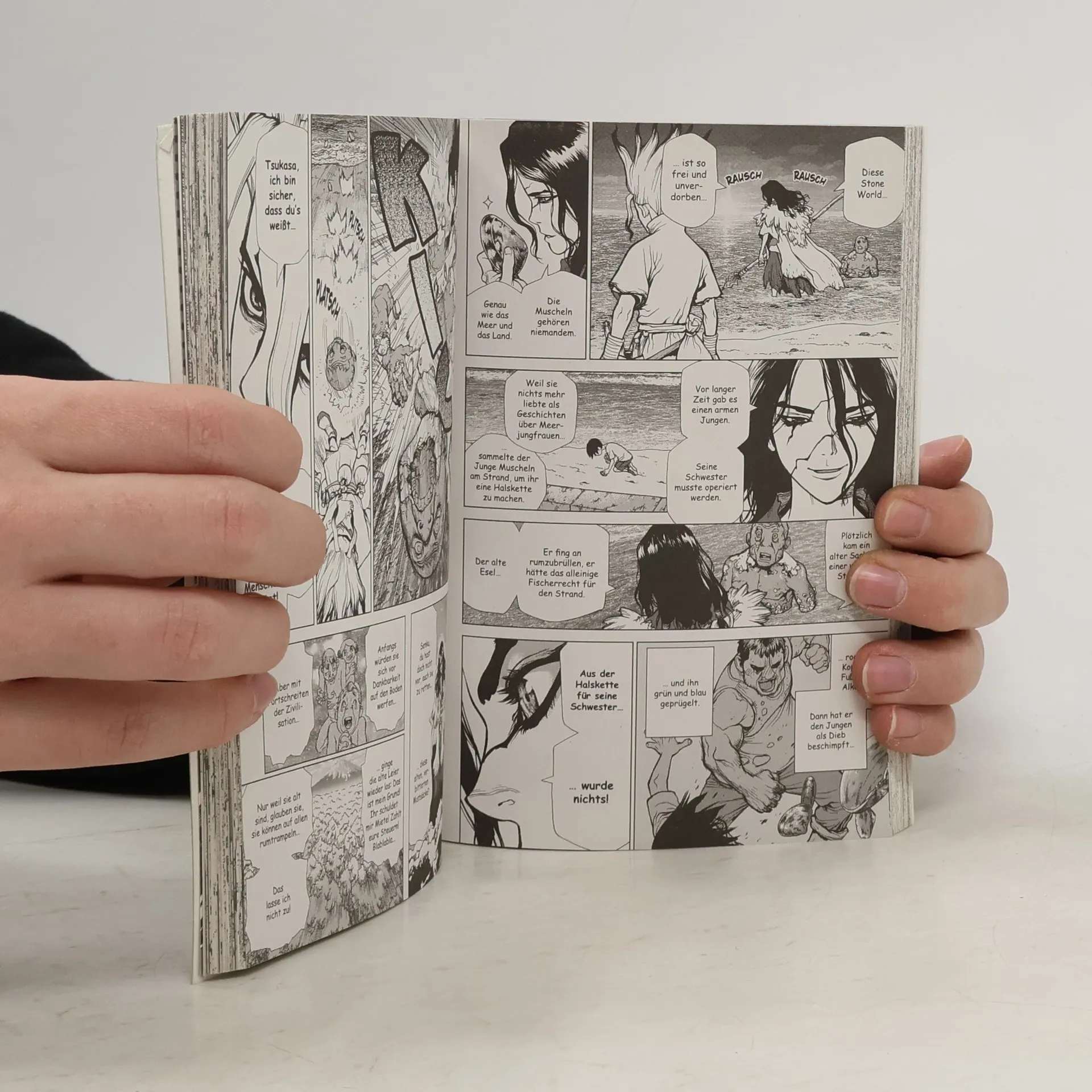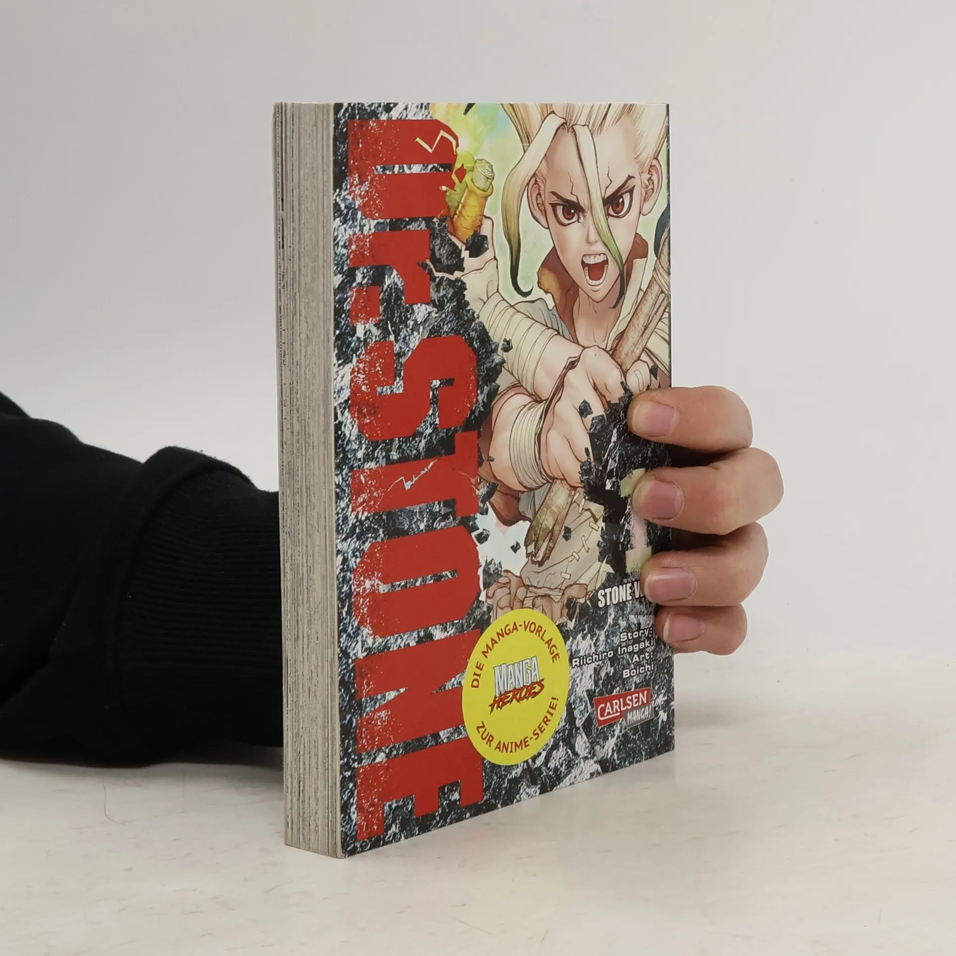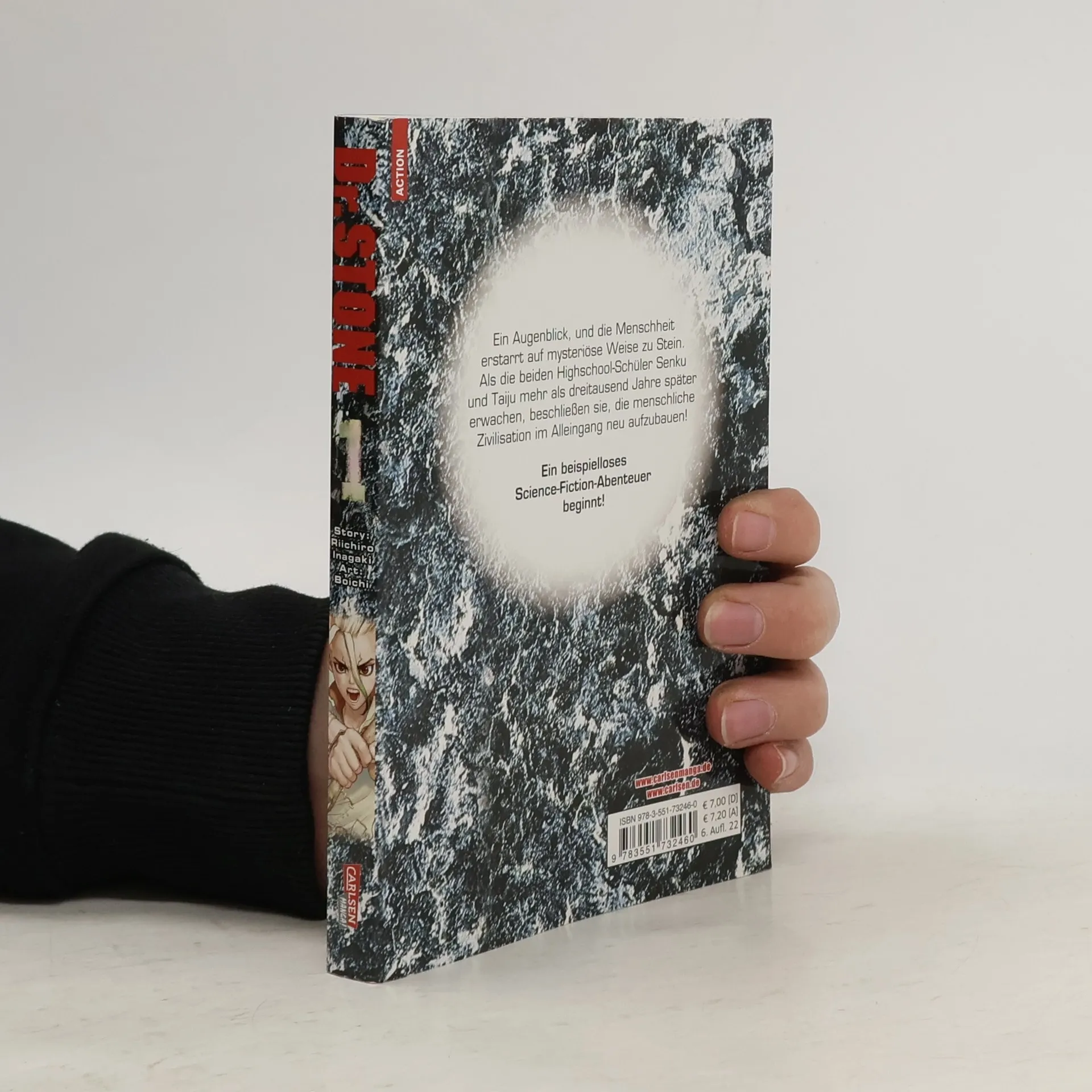 Der irre und geniale Doktor, der die Menschheit rettet! Als der Highschool-Schüler Taiju endlich den Mut aufbringt, Yuzuriha – das Mädchen seiner Träume – seine Liebe zu gestehen, wird der Himmel von einem Licht erfüllt, das alle Lebewesen, die es erreicht, zu Stein werden lässt. Nach Tausenden von Jahren in Stein kann er sich wie durch ein Wunder befreien und sucht nach weiteren Überlebenden. Bei seiner Suche trifft er auf seinen Freund und Wissenschaftsgenie Senku, der schon früher seinem Steingefängnis entkommen konnte. Gemeinsam versuchen sie die Weltbevölkerung zu retten und untersuchen, wie es zu diesem Ereignis gekommen ist. Bei ihrem Abenteuer treffen sie natürlich nicht nur auf Freunde… DR. STONE begeistert die Leser mit jeder Menge Action, Witz und Wissenschaft! Weitere Informationen: - Abgeschlossen in 26 Bänden - Top Titel der japanischen WEEKLY SHONEN JUMP - Perfekt für alle Mangafans ab 14 Jahren