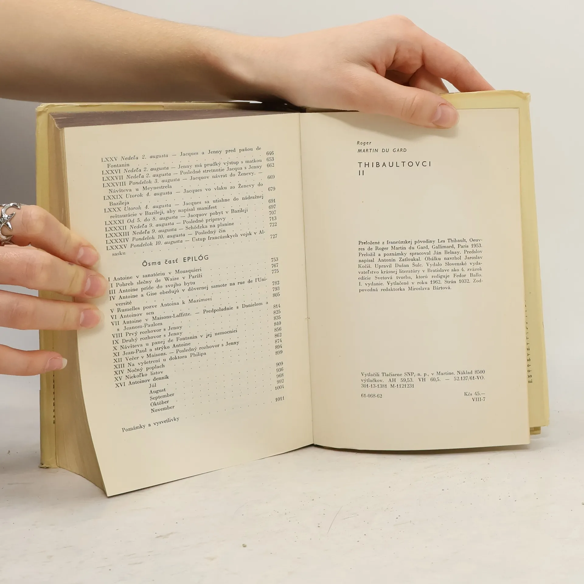 Kniha ponúka román o prvej svetovej vojne, román politický - zobrazuje rodinnú tragédiu rodu Thibaultovcov, ktorá sa mení na tragédiu všeobecnú, na tragédiu celého ľudstva. Prvé slovenské vydanie.