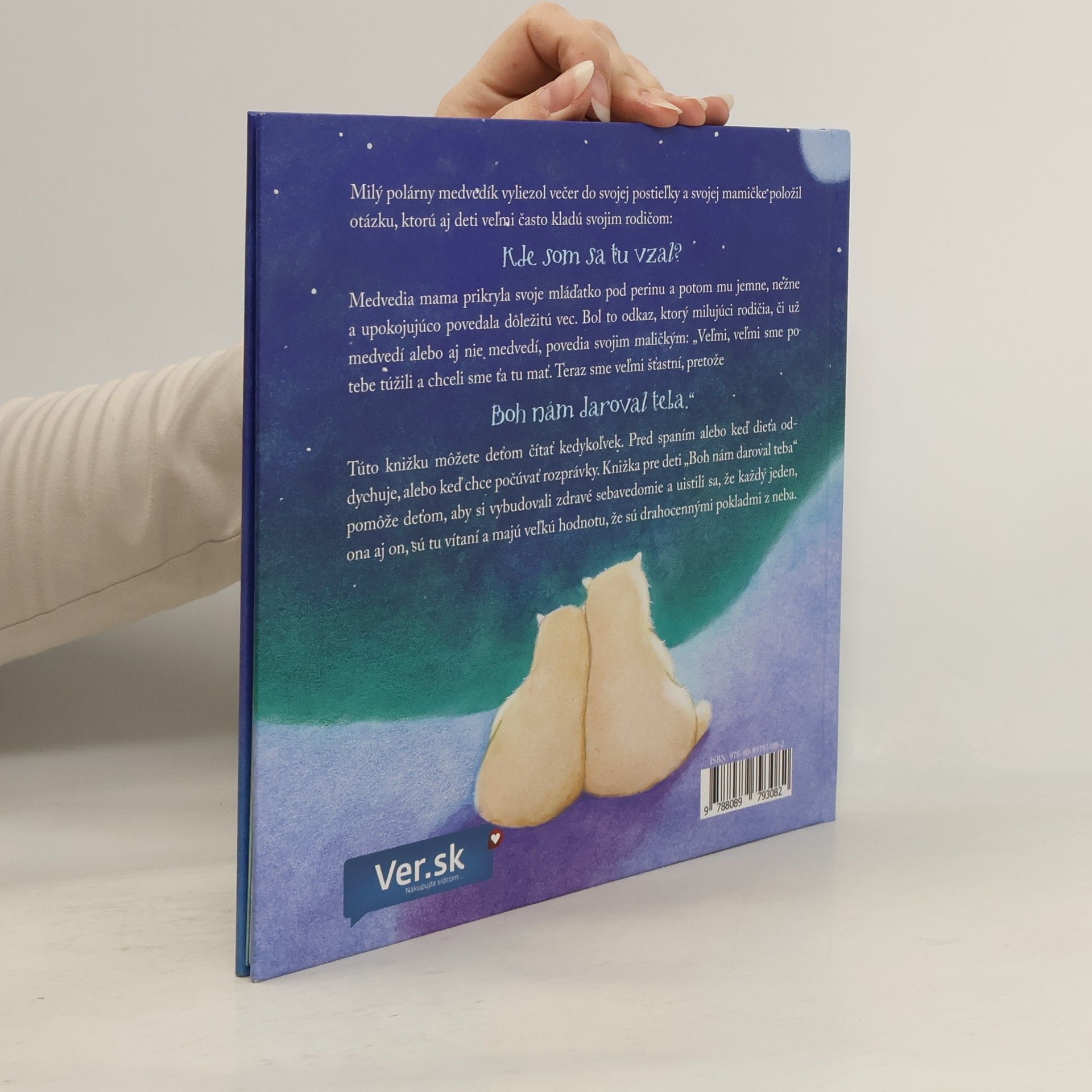 Milý polárny medvedík vyliezol večer do svoje postieľky a svojej mamičke položil otázku, ktorú aj deti veľmi radi kladú svojim rodičom: "Kde som sa tu vzal?" Medvedia mama prikryla svoje mláďatko pod perinu a potom mu jemne, nežne a upokojujúco povedala dôležitú vec. Bol to odkaz, ktorý milujúci rodičia, či už medvedí alebo nie medvedí, povedia svojim maličkým: "Veľmi, veľmi sme po tebe túžili a chceli sme ťa tu mať. Teraz sme veľmi šťastní, pretože Boh nám daroval teba." Túto knižku môžete deťom čítať kedykoľvek. Pred spaním alebo keď dieťa oddychuje, alebo keď chce počúvať rozprávky. Knižka pre deti ,,Boh nám daroval teba" pomôže deťom, aby si vybudovali zdravé sebavedomie a uistili sa, že každý jeden, on aj ona, sú vítaní a majú veľkú hodnotu, že sú drahocennými pokladmi z neba.