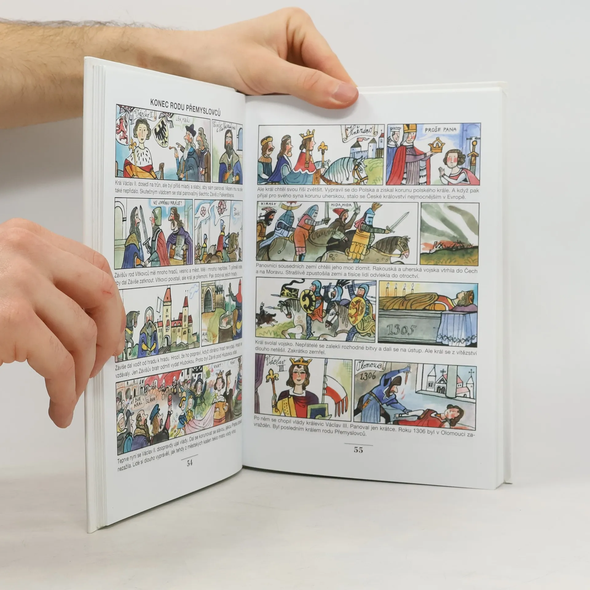 Oblíbená knížka obrázkových seriálů, která hravě, humorně, ale velmi výstižně přibližuje čtenářům nejstarší i novější dějiny naší vlasti. Autoři vyprávějí o příchodu praotce Čecha, o Bivojovi, Libušině proroctví, Karlu IV., Janu Husovi, golemovi, avšak i o slavných spisovatelích, hudebních skladatelích, vědcích a vynálezcích. Knížka končí vznikem Československé republiky v roce 1918. Historii svého národa by měl znát každý, a malý i větší čtenář se právě tady dozví mnohé, co ještě nevěděl, nebo si připomene, co už pozapomněl. A navíc se pobaví krátkými texty a veselými obrázky