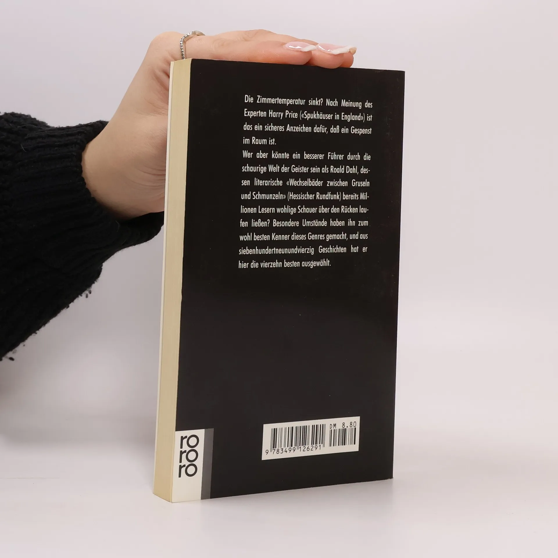 Die Zimmertemperatur sinkt? Nach Meinung des Experten Harry Price ("Spukhäuser in England") ist das ein sicheres Anzeichen dafür, dass ein Gespenst im Raum ist. Wer aber könnte ein besserer Führer durch die Welt der Geister sein als Roald Dahl, dessen literarische "Wechselbäder zwischen Gruseln und Schmunzeln" (Hessischer Rundfunk) bereits Millionen Lesern wohlige Schauer über den Rücken laufen ließen? Besondere Umstände haben ihn zum wohl besten Kenner dieses Genres gemacht, und aus siebenhundertneunundvierzig Geschichten hat er hier die vierzehn besten ausgewählt.