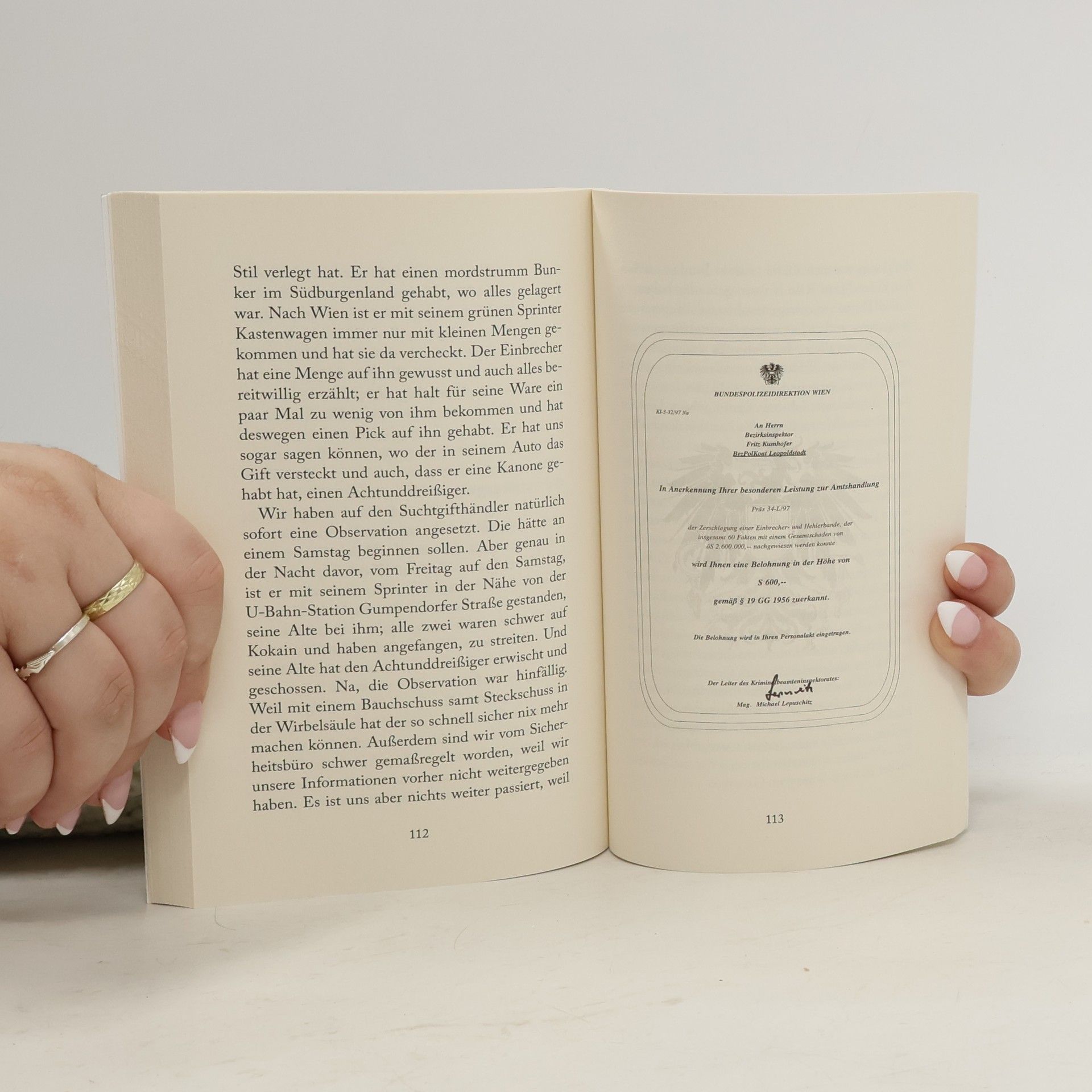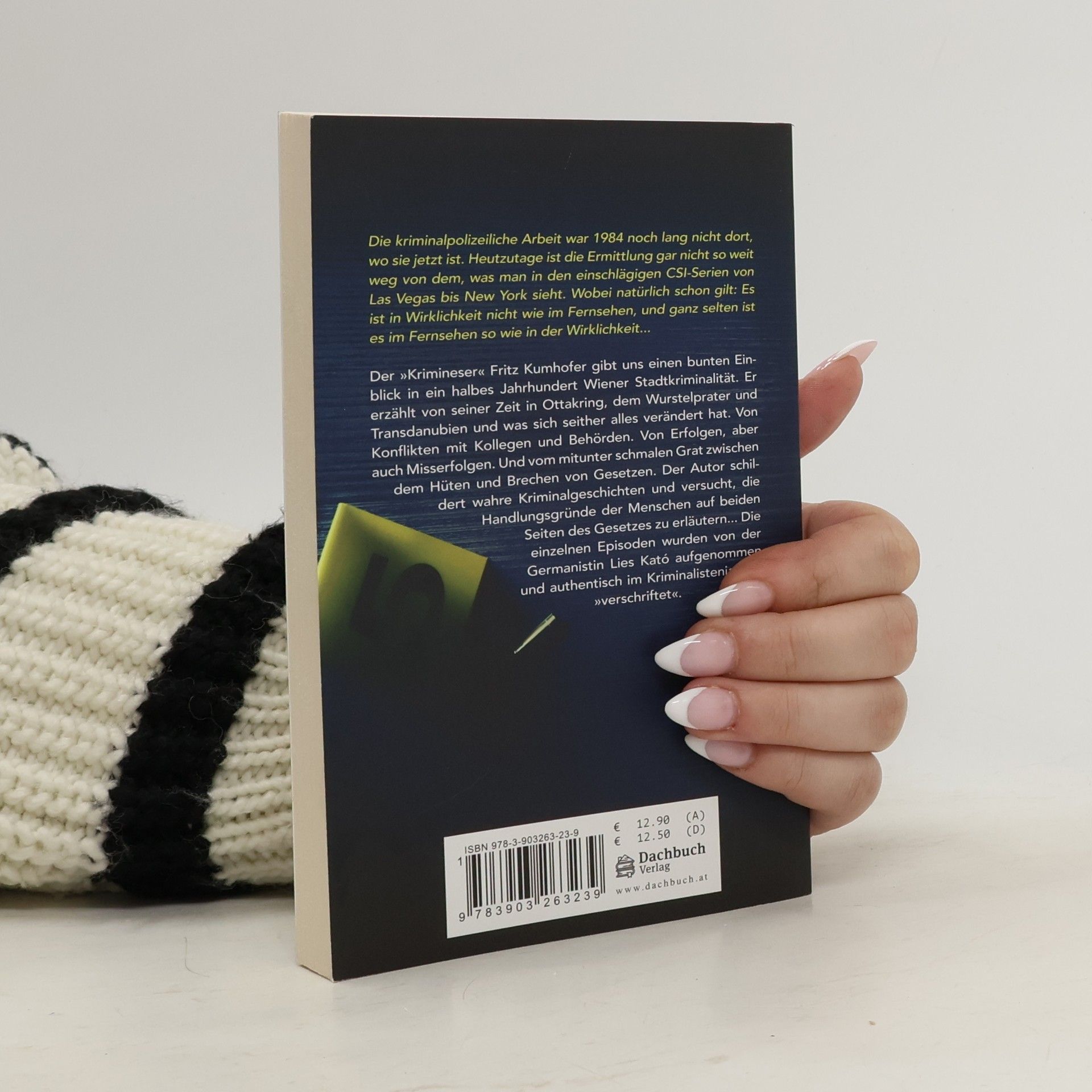 Der Wiener Kriminalpolizist Fritz Kumhofer erzählt autobiographisch über seine Polizeikarriere. Er richtet sich damit an jede Zielgruppe, die sich für Wiener Zeitgeschichte und detailliert geschilderte Kriminalfälle interessiert. Im Wienerischen Wortlaut und versiert von allen Seiten beleuchtet, erzählt er vom mitunter schmalen Grat zwischen dem Hüten und Brechen von Gesetzen, von Konflikten mit Kollegen und Behörden sowie von Erfolgen, aber auch Misserfolgen. Die Leserschaft bekommt einen tiefen und lebendigen Einblick in fast ein halbes Jahrhundert gelebte Wiener Geschichte der Kriminalistik. Der Autor schildert, was – im Gegensatz zu heute – früher alles anders war. Kumhofer lässt einen an wahren Kriminalgeschichten teilhaben und versucht auch, die Handlungsgründe der Menschen zu erläutern, die auf beiden Seiten des Gesetzes stehen. Verschriftet wurden die (teils) biographischen Geschichten von Germanistin und Autorin Lies Kató.
