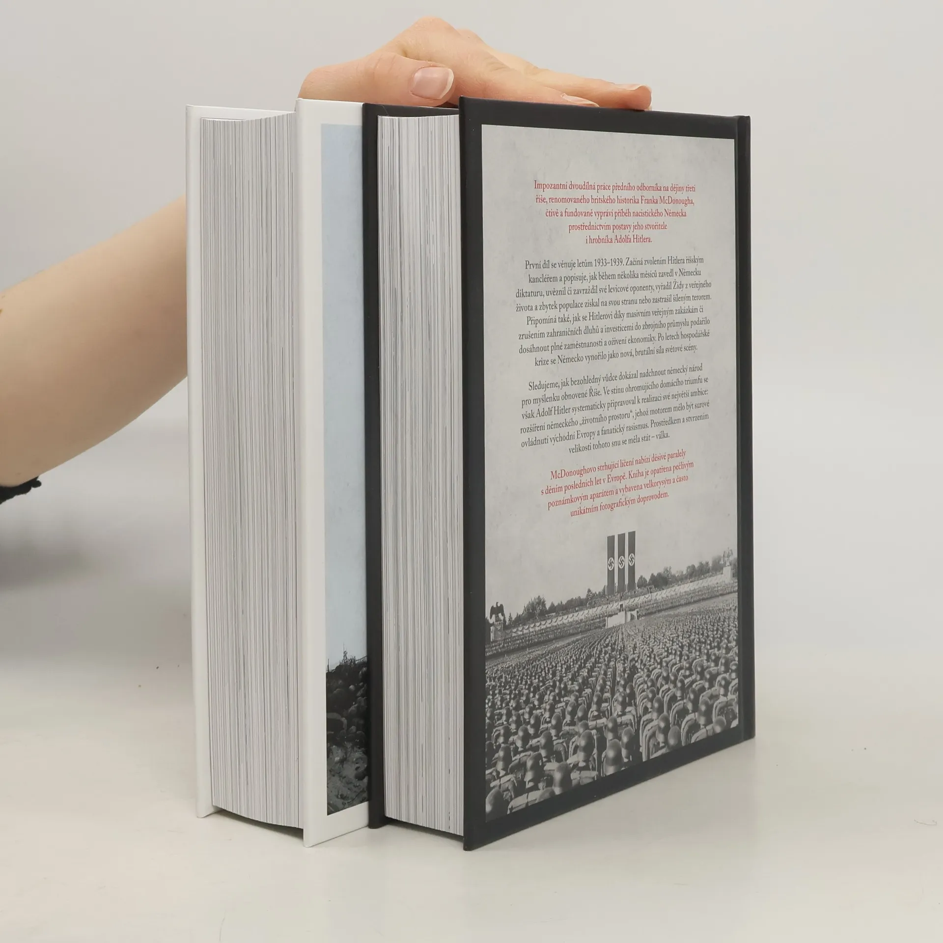 Impozantní dvoudílná práce renomovaného britského historika Franka McDonougha čtivě vypráví příběh nacistického Německa prostřednictvím Adolfa Hitlera. McDonoughovo líčení nabízí děsivé paralely s nedávnými událostmi v Evropě a je doplněno pečlivým poznámkovým aparátem a unikátním fotografickým materiálem. První díl se zaměřuje na léta 1933–1939, kdy byl Hitler zvolen říšským kancléřem. Popisuje, jak během několika měsíců zavedl v Německu diktaturu, vyřadil Židy z veřejného života a zastrašil populaci terorem. Díky masivním veřejným zakázkám a investicím do zbrojního průmyslu dosáhl plné zaměstnanosti a oživení ekonomiky, čímž se Německo stalo brutální silou na světové scéně. Hitler systematicky připravoval expanze na východ a jeho ambice vyvrcholily ve válce. Druhý díl pokrývá léta 1940–1945, kdy nacistické Německo stálo na vrcholu moci, ale na konci bylo v troskách a neslo si hanbu holokaustu a válečných zločinů. McDonough ukazuje, že i přes Hitlerovy plány a počáteční úspěchy se Německo nikdy nestalo skutečnou supervelmocí a nemělo šanci uspět proti Spojencům. Díl sleduje Hitlerova vojenská vítězství, nelidské vraždění a konečný obrat na bitevním poli vedoucí k porážce nacionálního socialismu.