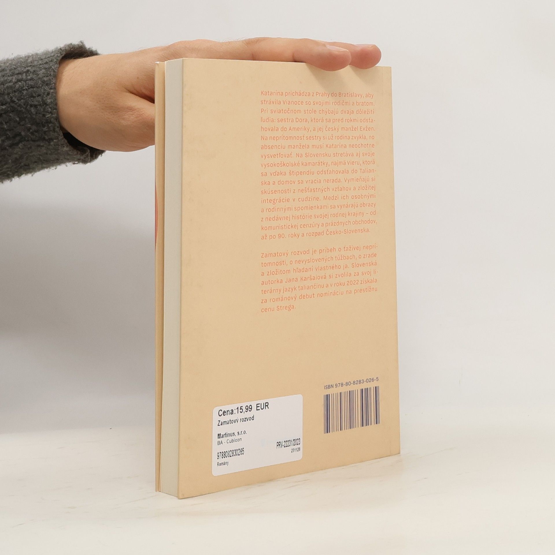 Katarína prichádza z Prahy do Bratislavy, aby strávila Vianoce so svojimi rodičmi a bratom. Pri sviatočnom stole chýbajú dvaja dôležití ľudia: sestra Dora, ktorá sa pred rokmi odsťahovala do Ameriky, a jej český manžel Evžen. Na neprítomnosť sestry si už rodina zvykla, no absenciu manžela musí Katarína neochotne vysvetľovať. Na Slovensku stretáva aj svoje vysokoškolské kamarátky, najmä Vieru, ktorá sa vďaka štipendiu odsťahovala do Talianska a domov sa vracia nerada. Vymieňajú si skúsenosti z nešťastných vzťahov a zložitej integrácie v cudzine. Medzi ich osobnými a rodinnými spomienkami sa vynárajú obrazy z nedávnej histórie svojej rodnej krajiny – od komunistickej cenzúry a prázdnych obchodov, až po 90. roky a rozpad Česko-Slovenska.Zamatový rozvod je príbeh o ťaživej neprítomnosti, o nevyslovených túžbach, o zrade a zložitom hľadaní vlastného ja. Slovenská autorka Jana Karšaiová si zvolila za svoj literárny jazyk taliančinu a v roku 2022 získala za románový debut nomináciu na prestížnu cenu Strega.
