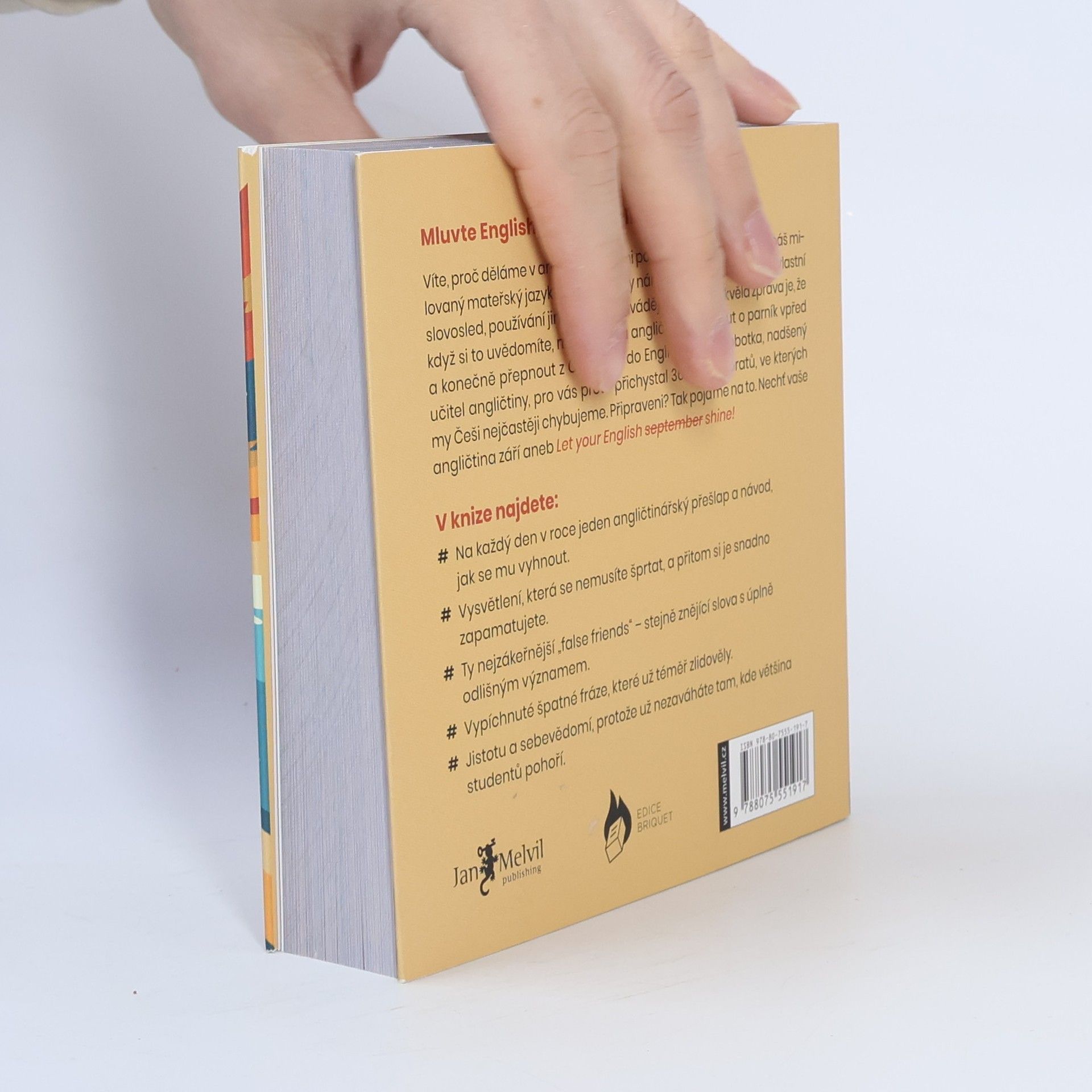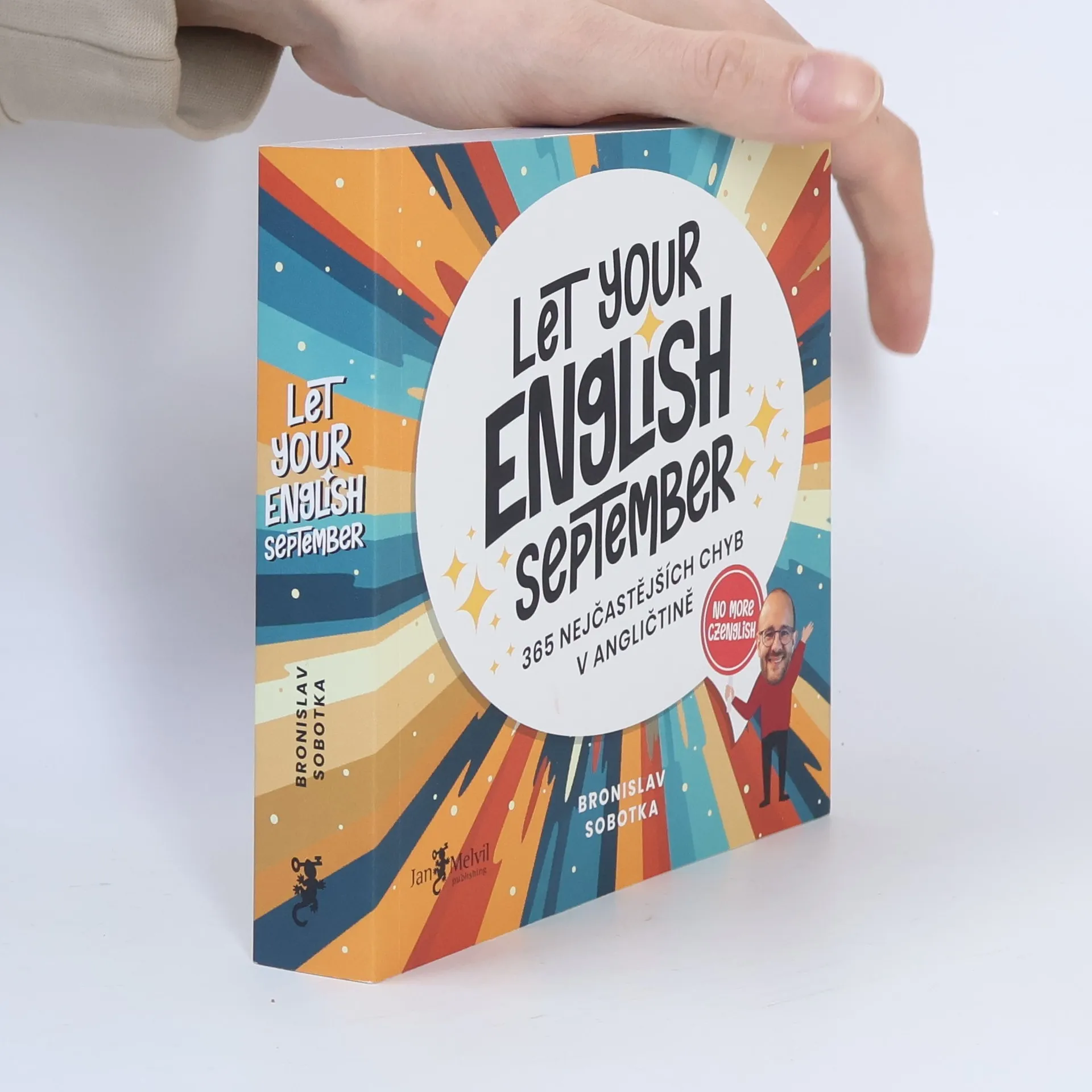 Víte, proč děláme v angličtině všichni podobné chyby?Na vině je náš milovaný mateřský jazyk – do angličtiny nám záludně podsouvá svůj vlastní slovosled, používání jiných časů i zavádějící slovíčka. Skvělá zpráva je, že když si to uvědomíte, můžete svou angličtinu posunout o parník vpřed a konečně přepnout z Czenglish do English!O KNIZEKaždý z nás to občas udělá - složí anglickou větu tak, jak by byla správně v češtině a vytvoří tzv. Czenglish. Někdy máme štěstí a zůstane to bez povšimnutí. Obvykle ale následuje rozpačité ticho, nepochopení nebo dokonce trapas!Že nechcete ani jedno? Pak je tato kniha právě pro vás. Broňa Sobotka, nadšený učitel angličtiny z Brna, vám v ní postupně představí 365 běžně používaných vět a frází, ve kterých my Češi nejčastěji chybujeme, a vysvětlí, jak se jim vyhnout.Cílem knihy totiž není nic menšího než zlepšit vaši angličtinu, ušetřit vás většiny nedorozumění a trapasů… a možná i trochu rozesmát.Tak pojďme na to. Nechť vaše angličtina září aneb Let your English September - shine!V KNIZE NAJDETENa každý den v roce jeden angličtinářský přešlap a návod, jak se mu vyhnout.Vysvětlení, která se nemusíte šprtat, a přitom si je snadno zapamatujete.Ty nejzákeřnější „false friends“ – stejně znějící slova s úplně odlišným významem.Vypíchnuté špatné fráze, které už téměř zlidověly.Jistotu a sebevědomí, protože už nezaváháte tam, kde většina studentů pohoří.