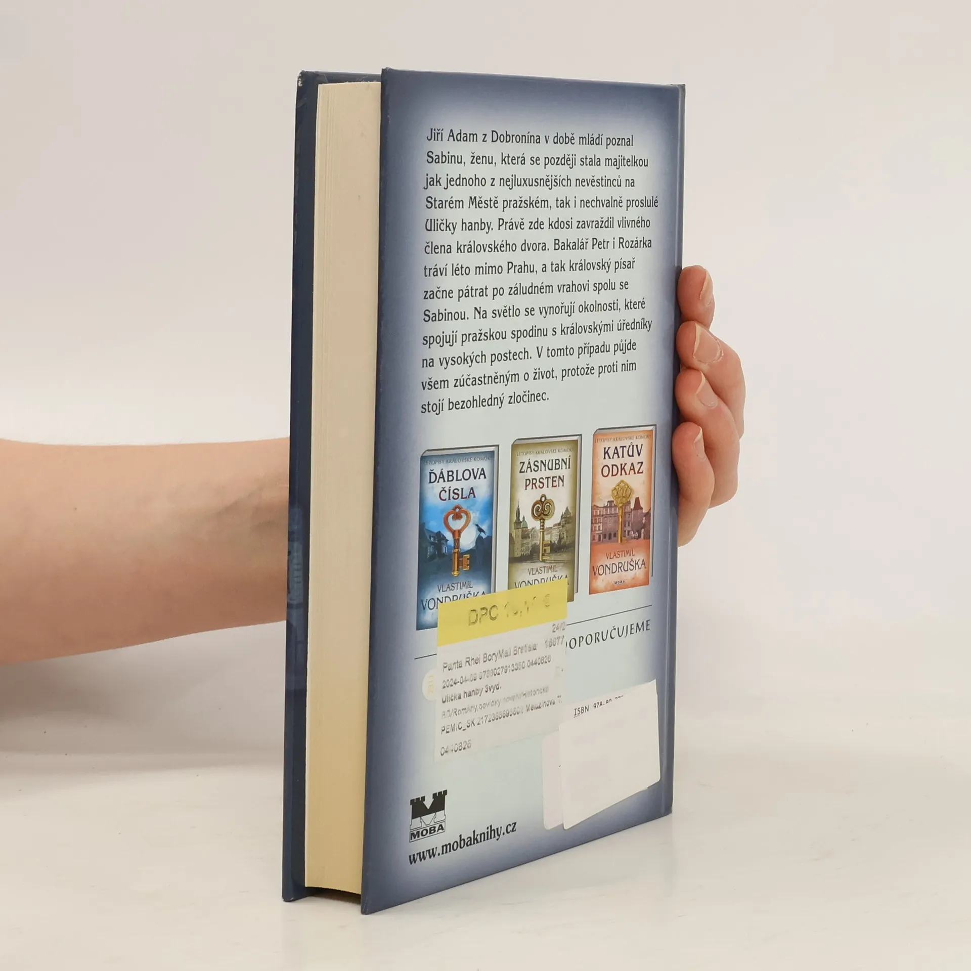 V osmém příběhu Letopisů královské komory pátrá královský písař Jiří Adam z Dobronína po vrahovi nevěstky a člena významného šlechtického rodu v Uličce hanby, proslulé svými nevěstinci. Jiří Adam z Dobronína se chystá užít si odpočinku v klidné, na léto částečně vylidněné Praze. Nečekaně však dostává diskrétní úkol od Valkouna z Adlaru, sekretáře vojenského hejtmana, ten postrádá svého bratra Plichtu a především obálku s jistými důležitými dokumenty, kterou údajně Plichta ukradl Valkounovu nadřízenému. Jiří Adam záhy nachází tělo Plichty, který byl zavražděn společně s prostitutkou v Uličce hanby. A brzo pochopí, že za jejich smrtí stojí mnohem víc, než se na první pohled zdálo a stopy ho zavedou až mezi královské úředníky na vysokých postech.