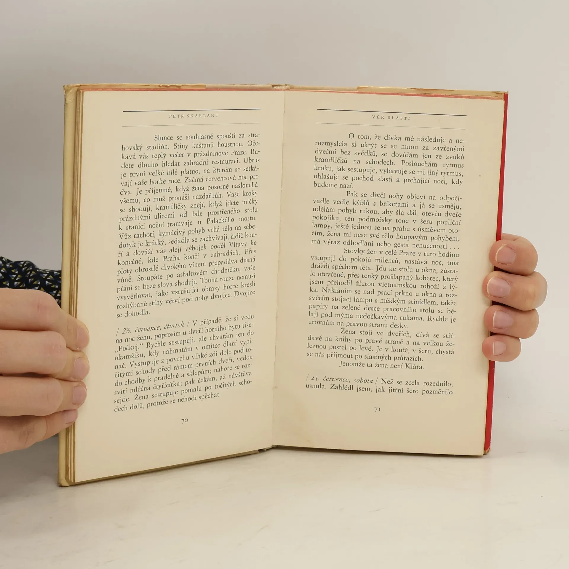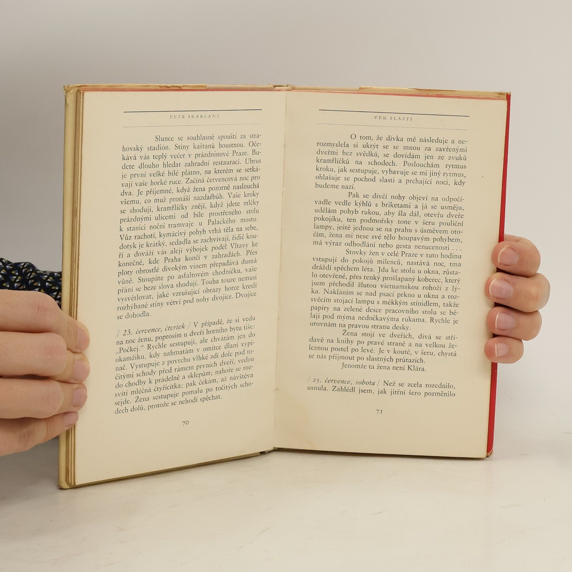 "Milostný deník čtyřiadvacetiletého" napsaný básníkem Petrem Skarlantem je něžný osudový příběh o lásce a smrti. (A také o Praze; magický děj Skarlantovy lyrické prózy se odehrává v přesně zachycené atmosféře plováren na Vltavě, studentských hospůdek, kaváren, kolejí a podnájmůa nočního života Prahy první poloviny šedesátých let.) Palčivá autobiografická látka je vymezena třemi roky, na jejichž začátku čtyřiadvacetiletý autor poznává dva vzrušující vztahy. Lásku a kamarádství. Nešťastnou lásku k ženě, která mu dovolí, aby poznal sám sebe a uniká mu. A přátelství muže, kterého předčasná smrt změní v legendu. Ostatní milostná dobrodružství, zdánlivě úspěšná a zachycovaná s nejzazší upřímností, neznamenají nic proti nečekanému setkání s láskou. Básník milostný cit impulsívně zachycuje a rozebírá v bohatě instrumentovaném a dramatickém toku deníkových záznamů pod klenbou "pražského nebe".