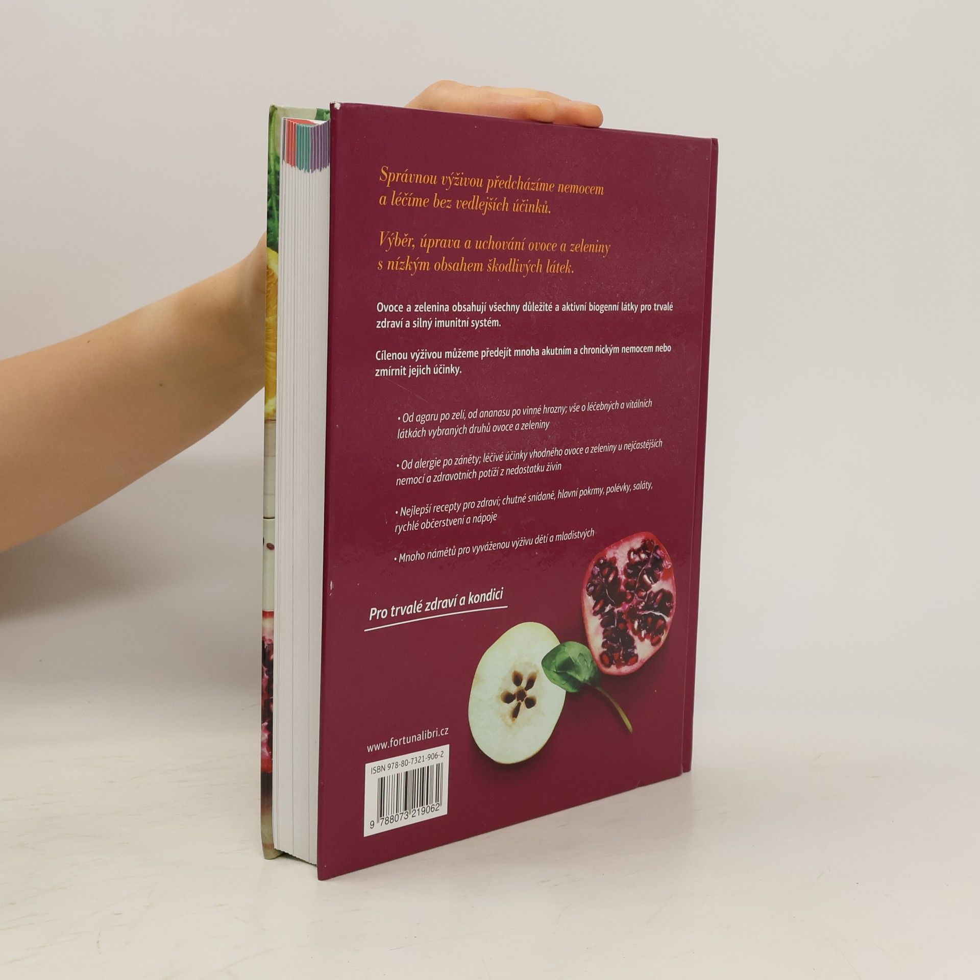 Předcházení nemocem a léčba bez vedlejších účinků prostřednictvím správné výživy - ovocnými a zeleninovými pokrmy. Přehled a popis jednotlivých druhů ovoce a zeleniny (řazení podle německého originálu), charakteristika, původ a rozšíření, léčivé účinky. U každého druhu zeleniny nebo ovoce je návod na přípravu zdravého jídla. Přehled ovoce a zeleniny s obsahem mnohých léčivých látek, jejichž konzumace pomáhá proti běžným zdravotním problémům. Kuchařské předpisy na přípravu zdravých jídel.