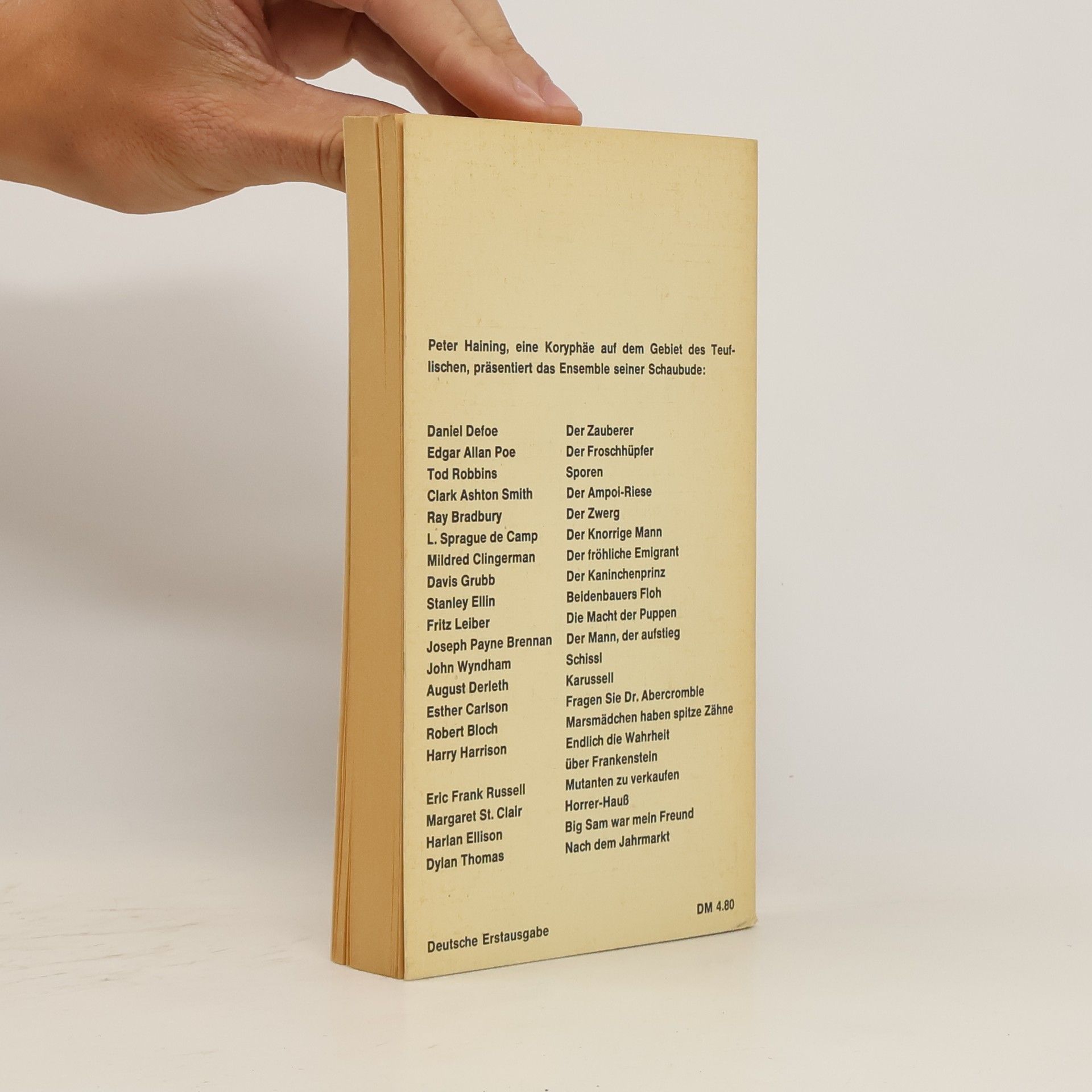 Peter Haining, eine Koryphäe auf dem Gebiet des Teuflischen, präsentiert das Ensemble seiner Schaubude: Daniel Defoe Der Zauberer Edgar Allan Poe Der Froschhüpfer Tod Robbins Sporen Clark Ashton Smith Der Ampoi-Riese Ray Bradbury Der Zwerg L. Sprague de Camp Der Knorrige Mann Mildred Clingerman Der fröhliche Emigrant Davis Grubb Der Kaninchenprinz Stanley Ellin Beidenbauers Floh Fritz Leiber Die Macht der Puppen Joseph Payne Brennan Der Mann, der aufstieg John Wyndham Schissl August Derleth Karussell Esther Carlson Fragen Sie Dr. Abercrombie Robert Bloch Marsmädchen haben spitze Zähne Harry Harrison Endlich die Wahrheit über Frankenstein Eric Frank Russell Mutanten zu verkaufen Margaret St. Clair Horrer-Hauß Harlan Ellison Big Sam war mein Freund Dylan Thomas Nach dem Jahrmarkt