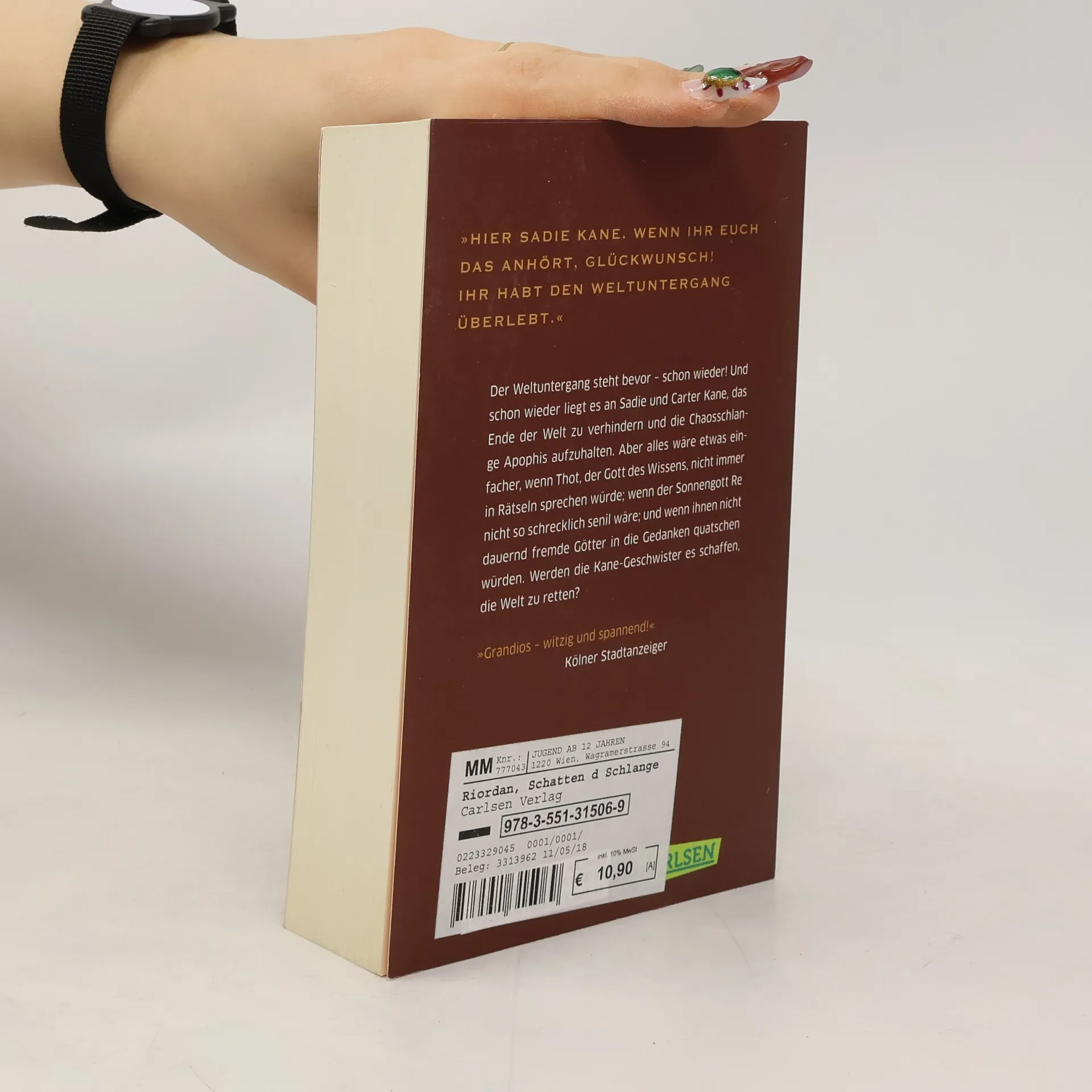 Ägyptische Götter, verlorene Zauber und ein Schatten, der das Schicksal entscheidet Irgendwie wird alles immer schwieriger! Chaos-Gott Apophis bereitet seinen Gefängnisausbruch vor. Den Geschwistern Carter und Sadie bleiben nur wenige Tage Zeit, das zu verhindern. Und leider können sie nicht sicher sein, dass die Magier auf ihrer Seite stehen. Wenn sie doch nur Apophis’ Schatten beeinflussen könnten! Dann hätten sie eine Chance, die Welt nicht dem Chaos zu überlassen. Doch wer ist Freund und wer Feind? Packende Fantasy-Trilogie mit mächtigen Magiern, wild gewordenen Göttern und mythologischen Monstern Die Geschwister Carter und Sadie Kane entdecken, dass sie die Nachkommen von Pharaonen sind und eine besondere Verbindung zu den ägyptischen Göttern haben. Nach einer missglückten Götterbeschwörung durch ihren Vater begibt sich das ungleiche Geschwisterpaar auf eine abenteuerliche Reise. Nur wenn sie ihre Kräfte bündeln und zusammenarbeiten, können sie die Welt retten. In der Fantasy-Buchreihe „Die Kane-Chroniken“ vermischt Rick Riordan die antike ägyptische Kultur und Mythologie mit der modernen Welt und entführt seine Leser*innen in ein rasantes Abenteuer mit spannenden Wendungen bis zur letzten Seite. ***Die Götter Ägyptens erwachen in der modernen Welt – rasant, actionreich und witzig: für Leser*innen ab 12 Jahren und für alle Fans der ägyptischen Mythologie***