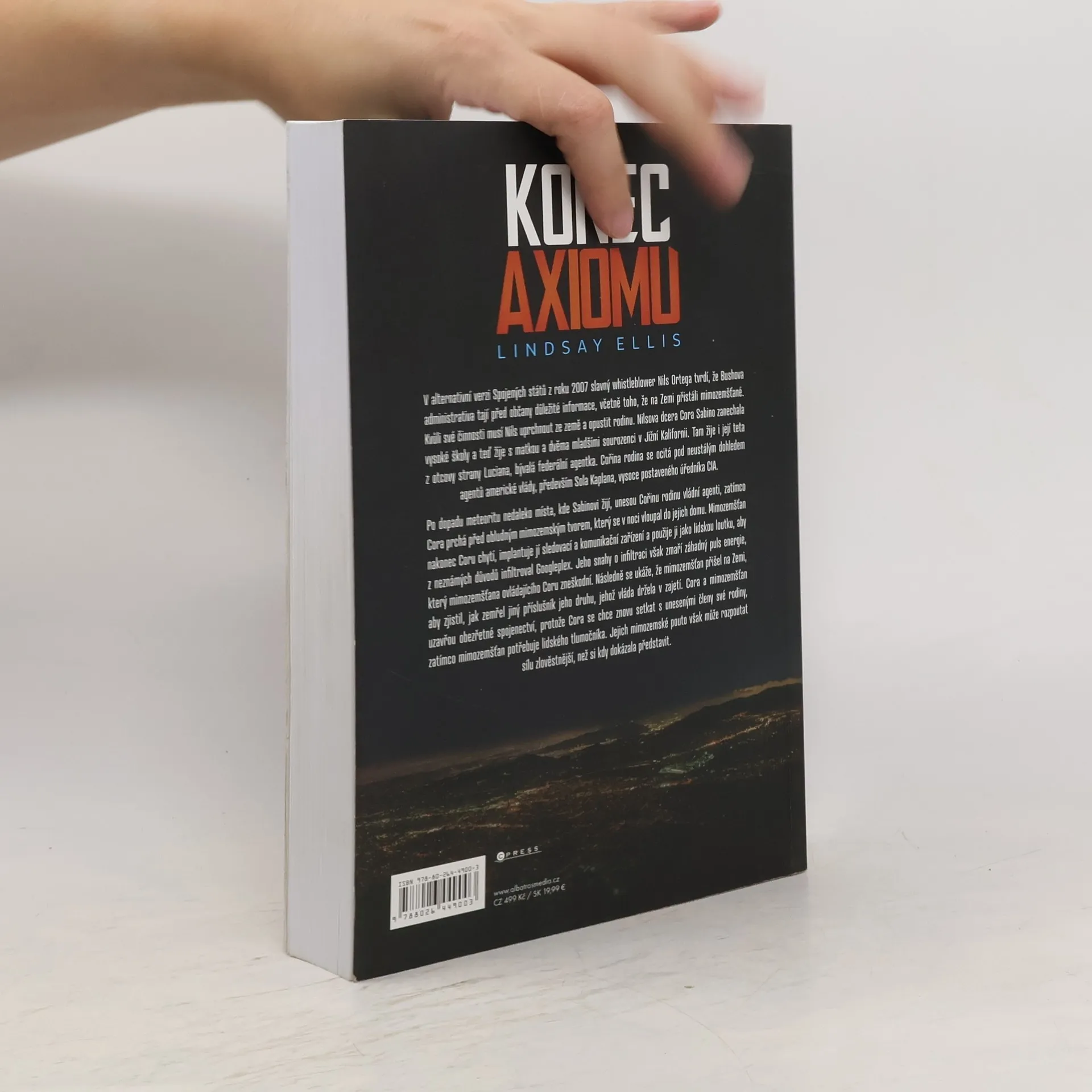 Konec Axiomu je napínavý sci-fi thriller. Hlavní hrdinkou je jednadvacetiletá Cora Sabino, která se ocitá v nebezpečí poté, co její otec, slavný whistleblower, odhalí, že vláda před lidmi tají existenci mimozemšťanů na Zemi. Po záhadném pádu meteoritu unesou Cořinu rodinu vládní agenti. Ona uteče, ale zkříží přitom cesty mimozemšťanovi, který ji implantuje dorozumívací zařízení. Cora a mimozemšťan pak uzavřou spojenectví, aby si vzájemně vypomohli v zoufalé situaci.