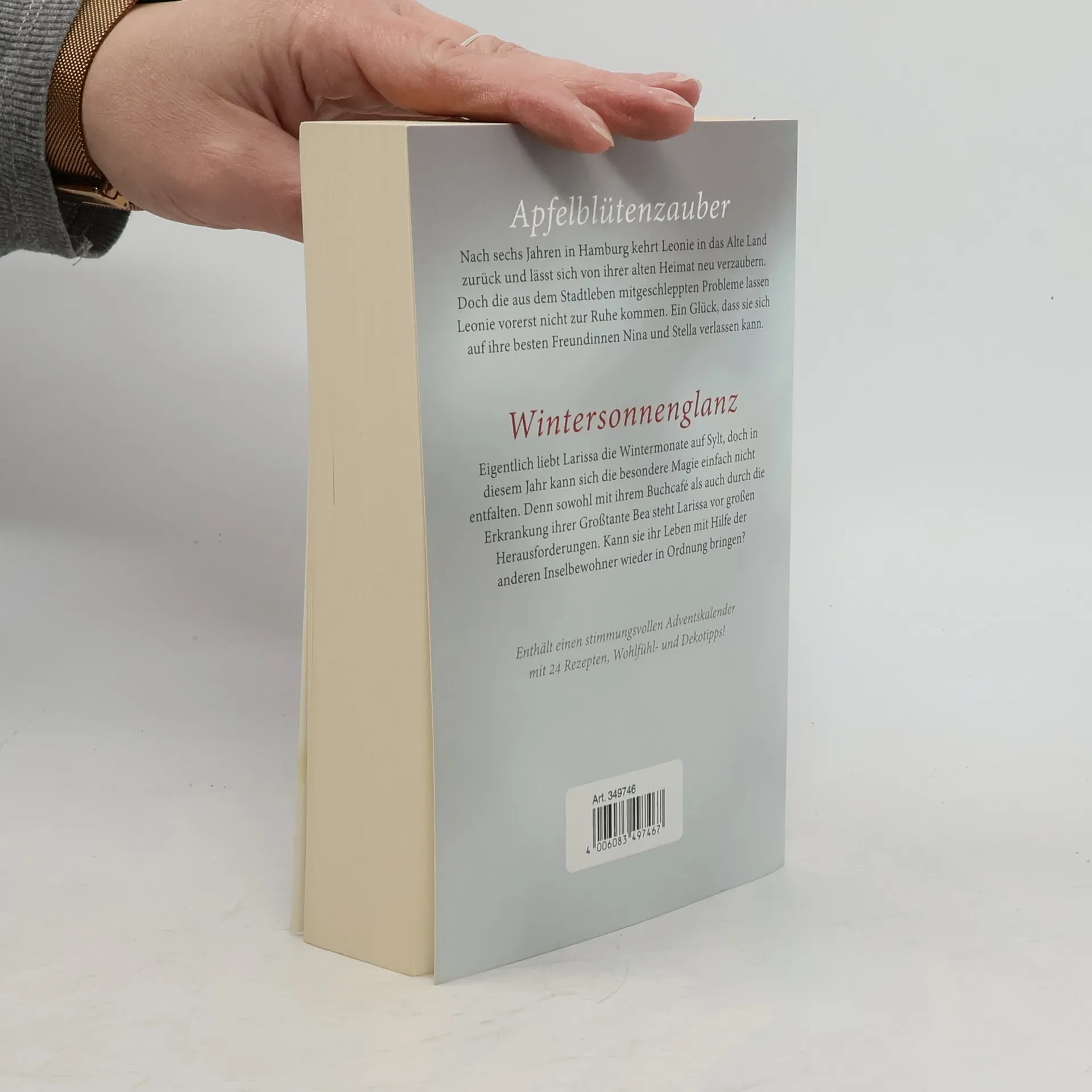 ApfelblütenzauberNach sechs Jahren in Hamburg kehrt Leonie in das Alte Land zurück und lässt sich von ihrer alten Heimat neu verzaubern. Doch die aus dem Stadtleben mitgeschleppten Probleme lassen Leonie vorerst nicht zur Ruhe kommen. Ein Glück, dass sie sich auf ihre besten Freundinnen Nina und Stella verlassen kann.WintersonnenglanzEigentlich liebt Larissa die Wintermonate auf Sylt, doch in diesem Jahr kann sich die besondere Magie einfach nicht einstellen. Denn sowohl mit ihrem Buchcafé als auch durch die Erkrankung ihrer Großtante Bea steht Larissa vor großen Herausforderungen. Kann sie ihr Leben mit Hilfe der anderen Inselbewohner wieder in Ordnung bringen?Enthält einen stimmungsvollen Adventskalender mit 24 Rezepten, Wohlfühl- und Dekotipps!