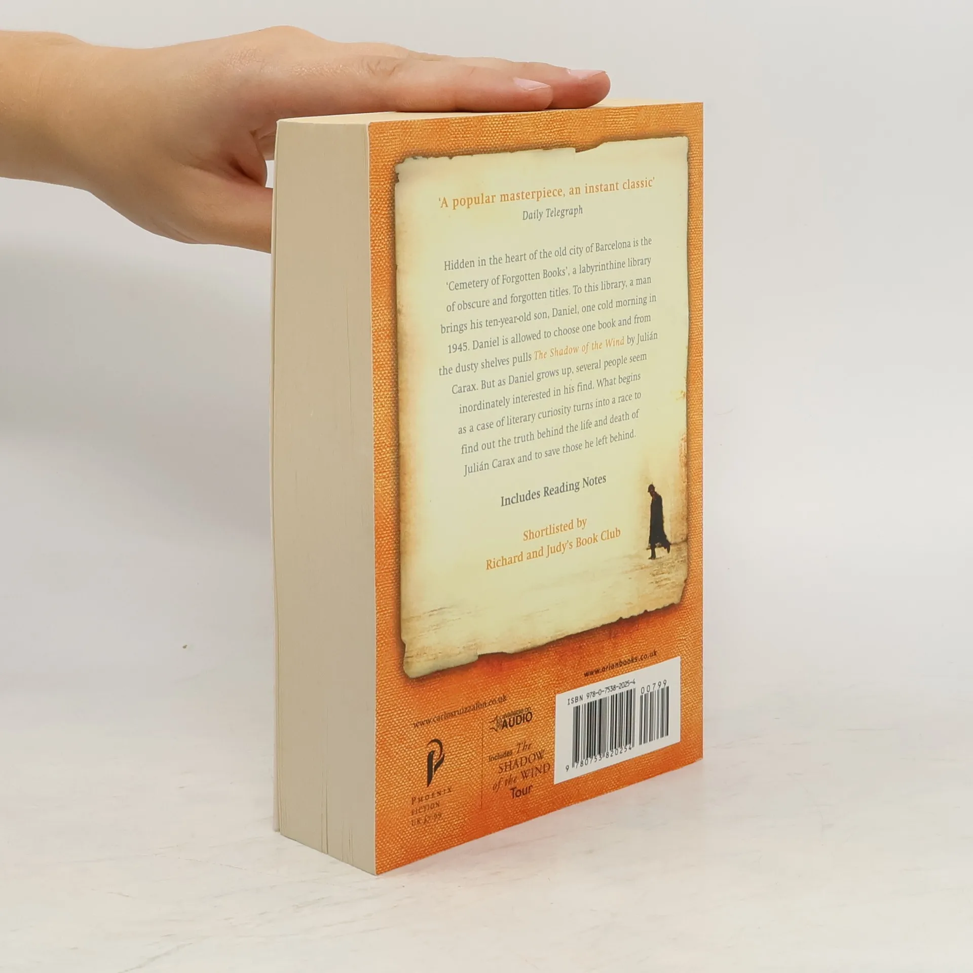 Hidden in the heart of the old city of Barcelona is the 'cemetery of lost books', a labyrinthine library of obscure and forgotten titles that have long gone out of print. To this library, a man brings his 10-year-old son Daniel one cold morning in 1945. Daniel is allowed to choose one book from the shelves and pulls out 'La Sombra del Viento' by Julian Carax. But as he grows up, several people seem inordinately interested in his find. Then, one night, as he is wandering the old streets once more, Daniel is approached by a figure who reminds him of a character from La Sombra del Viento, a character who turns out to be the devil. This man is tracking down every last copy of Carax's work in order to burn them. What begins as a case of literary curiosity turns into a race to find out the truth behind the life and death of Julian Carax and to save those he left behind. A page-turning exploration of obsession in literature and love, and the places that obsession can lead.